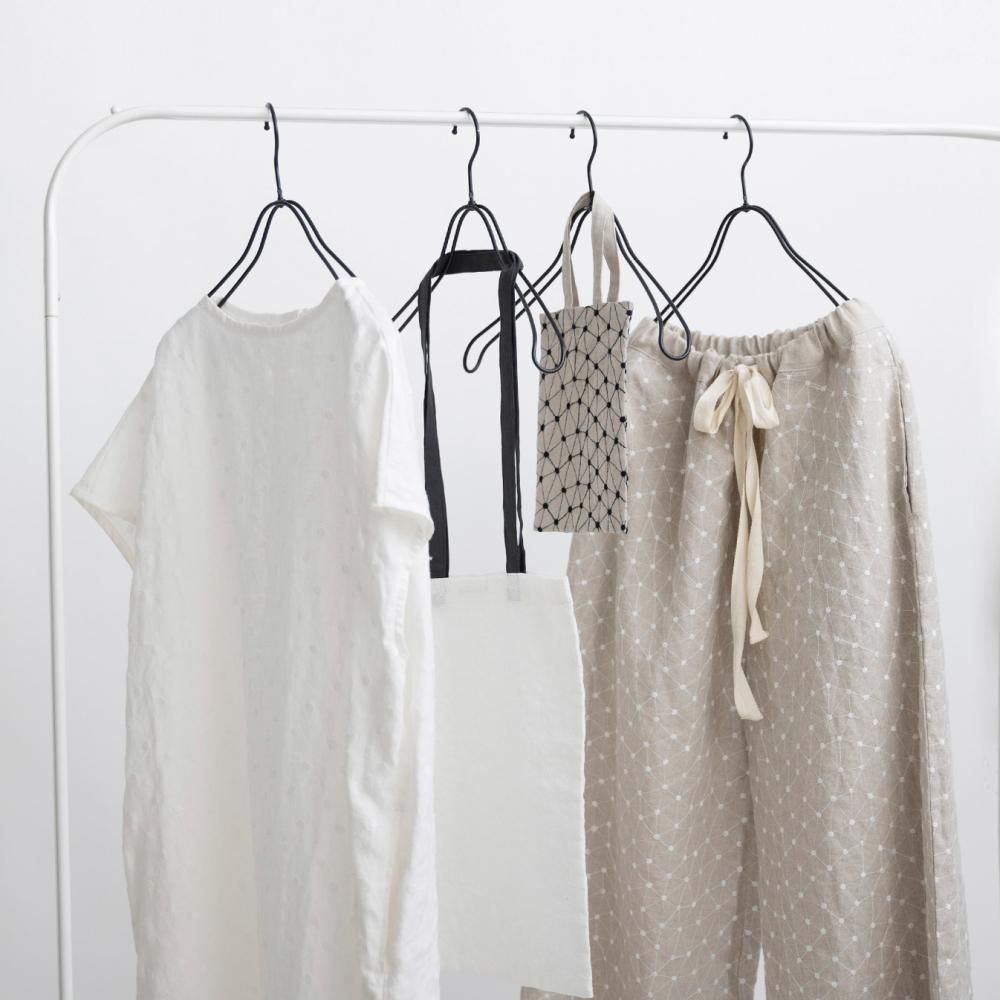 吸水・発散性に優れさわやかな肌触りのリネン素材に「メルッキ」刺繍をあしらいました。 「メルッキ」とは、フィンランド語で「星座」のこと。 金沢の刺繍作家、高知子さんのデザインを元に、日本国内の刺繍工場で刺繍を施しています。 この製品は機械刺しゅうのため、刺しゅう留まりの糸が1,0cmほど余っている箇所がありますが、これは不良品ではありません。 気になる場合は引っぱらずに余りを少し残してハサミでカットしてください。 またアクセサリーの金具や腕時計等を刺しゅう糸に引っかけないようにご注意ください。