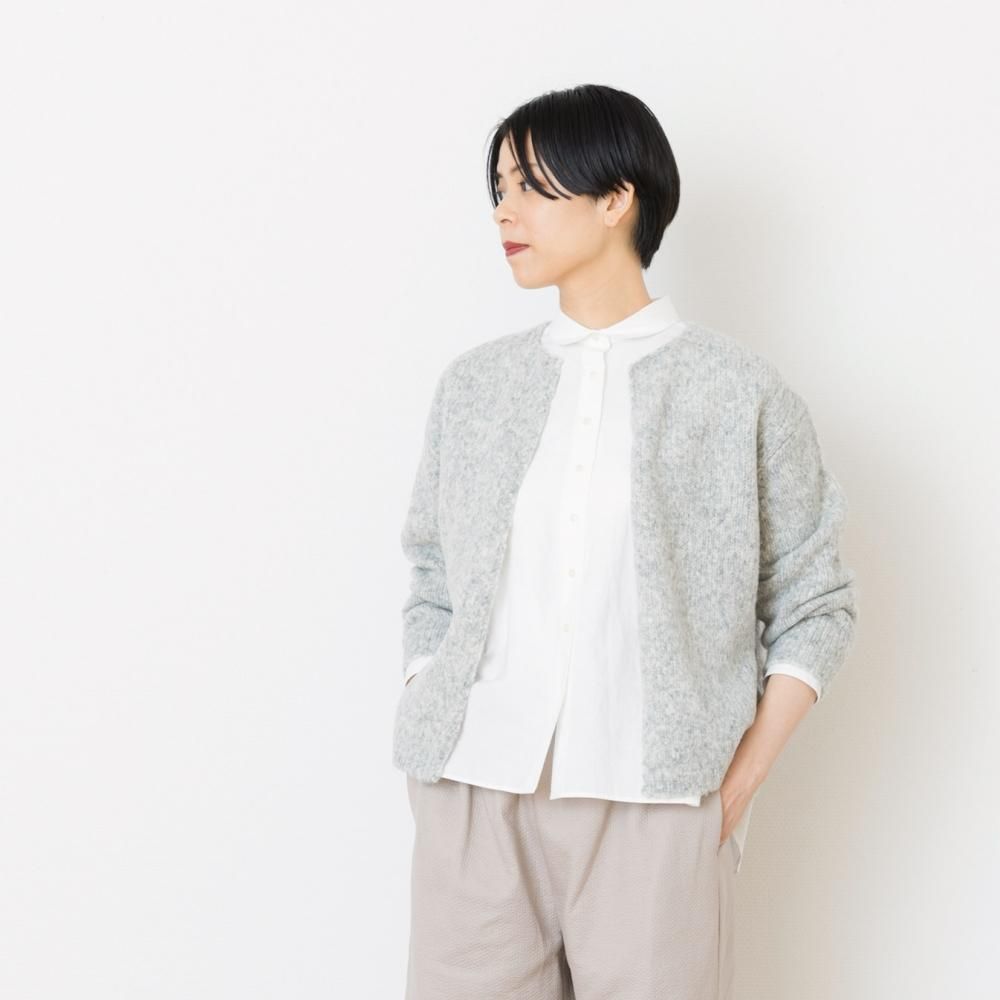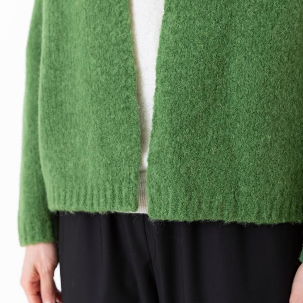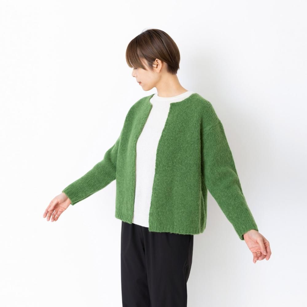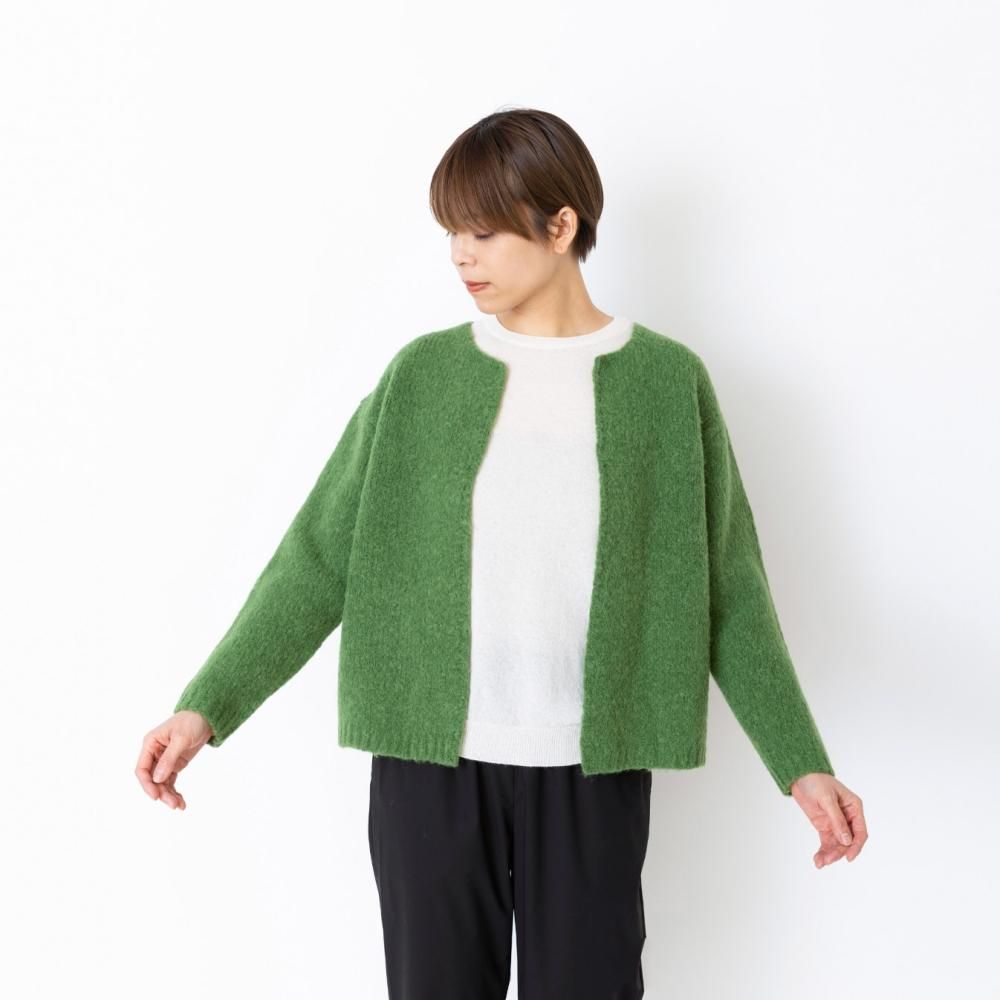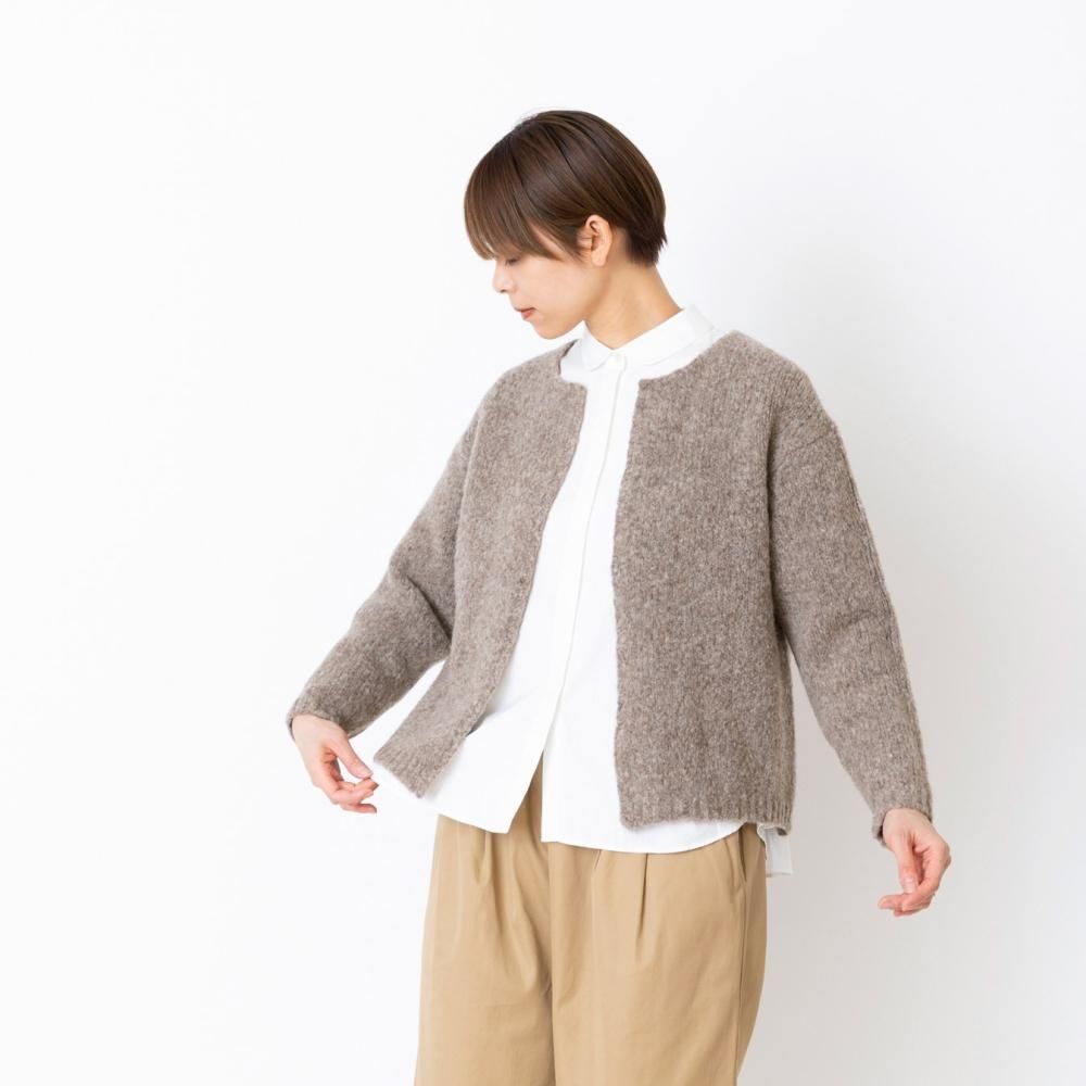 フロントにボタンのないシンプルなエアリーウールカーディガン。 ニットの柔らかさにジャケットのようなきちんと感を兼ね備えたきれいなフォルムが魅力の一枚。 たっぷりと空気を含んだベビーアルパカを使用しているため、ふわっと軽くてあたたかく、袖を通すたびに身体になじむ着心地です。