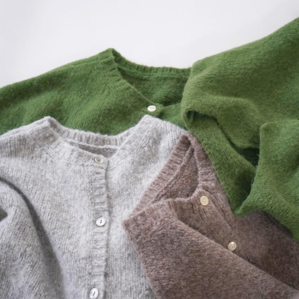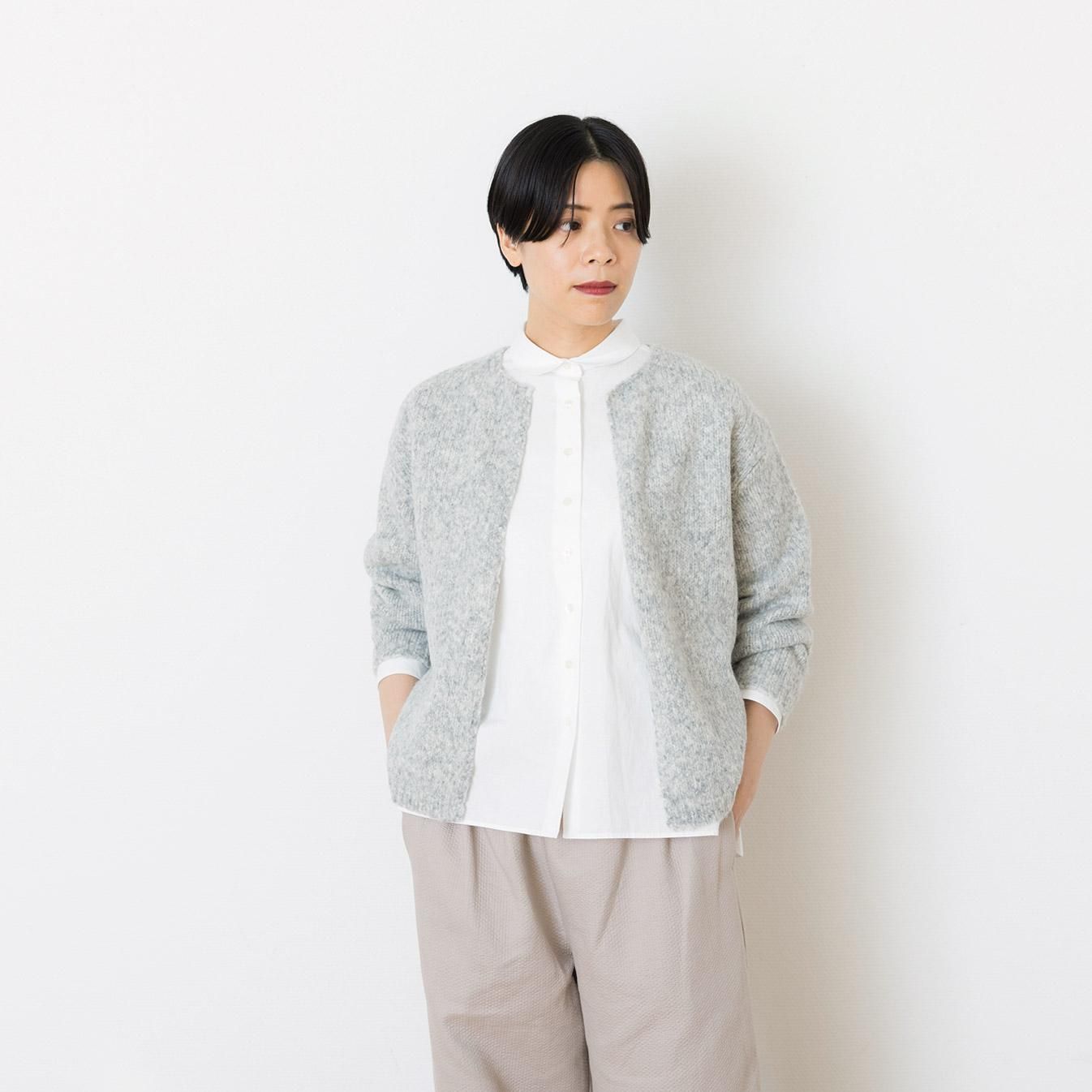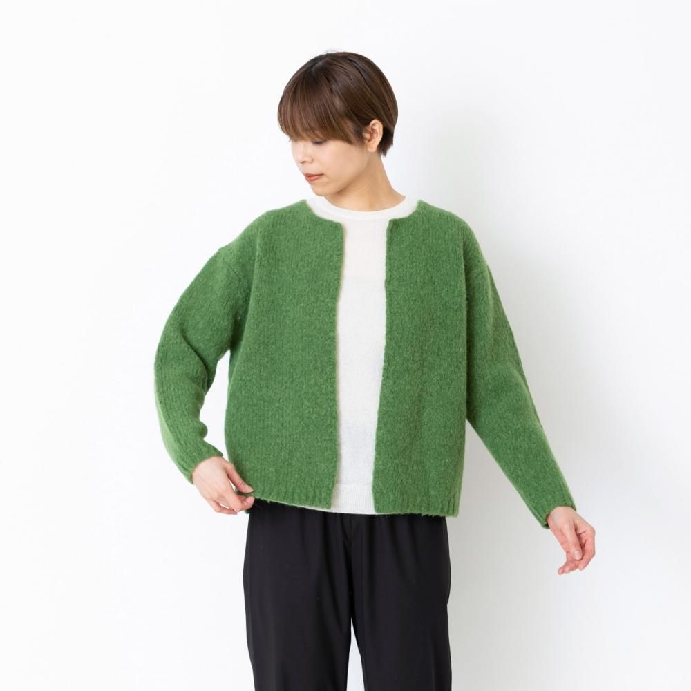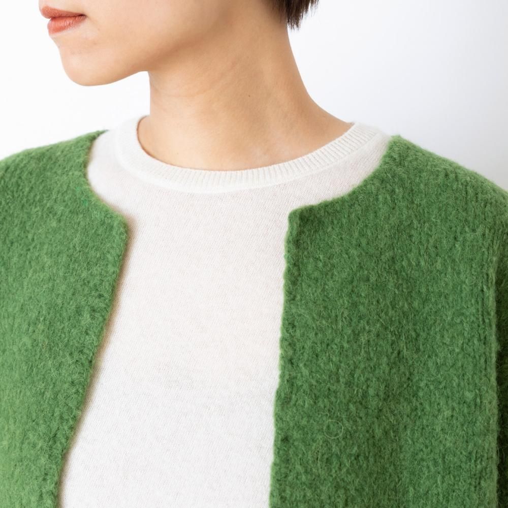 フロントにボタンのないシンプルなエアリーウールカーディガン。 ニットの柔らかさにジャケットのようなきちんと感を兼ね備えたきれいなフォルムが魅力の一枚。 たっぷりと空気を含んだベビーアルパカを使用しているため、ふわっと軽くてあたたかく、袖を通すたびに身体になじむ着心地です。