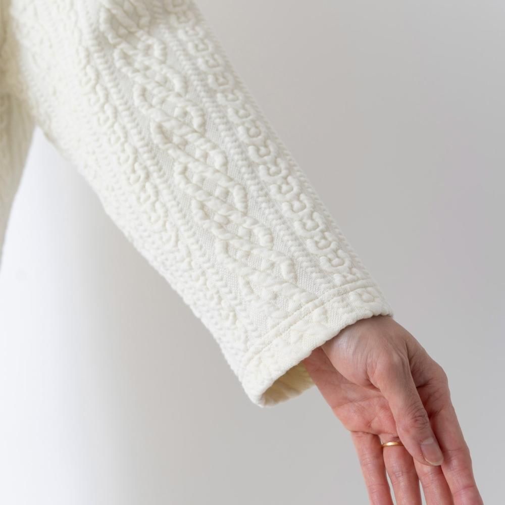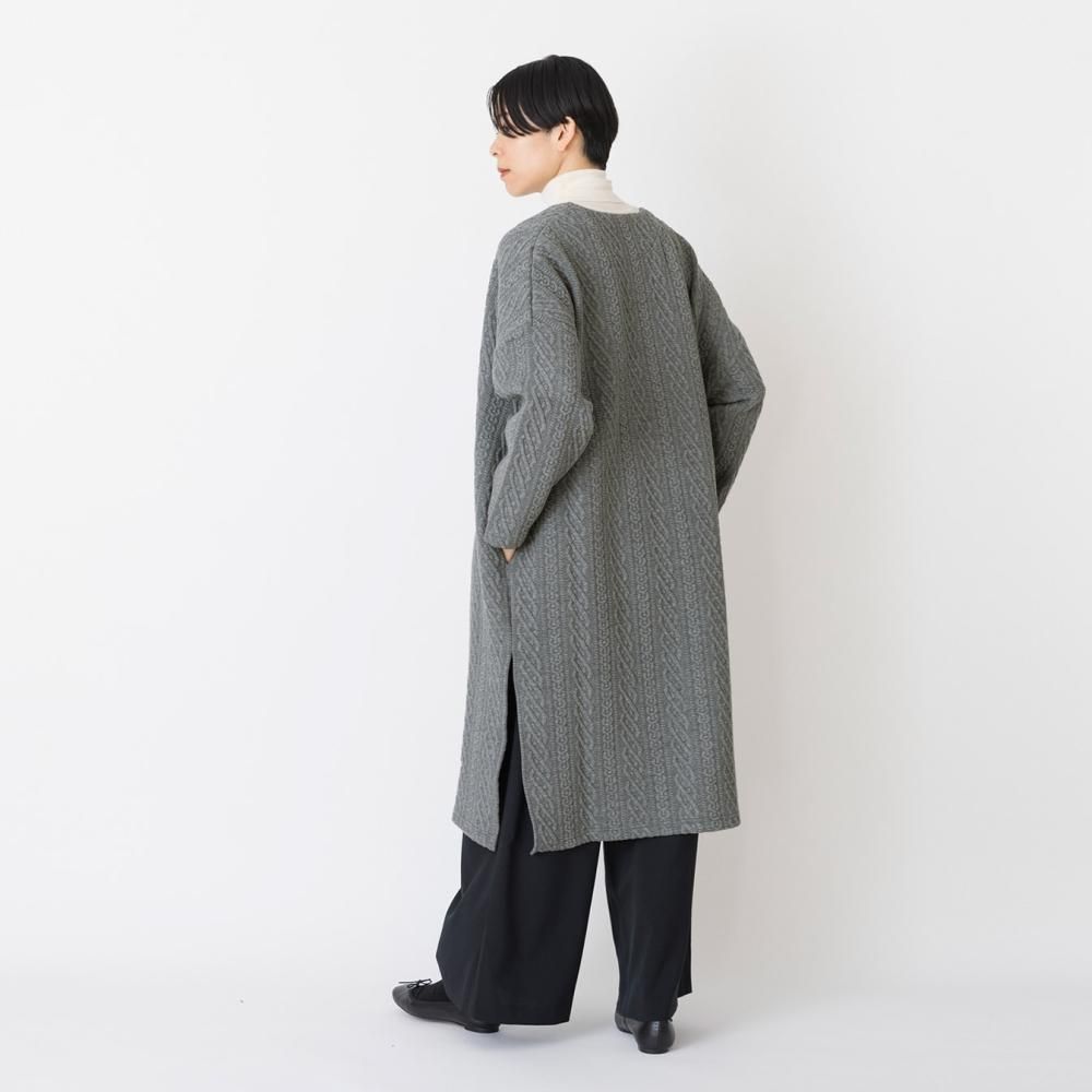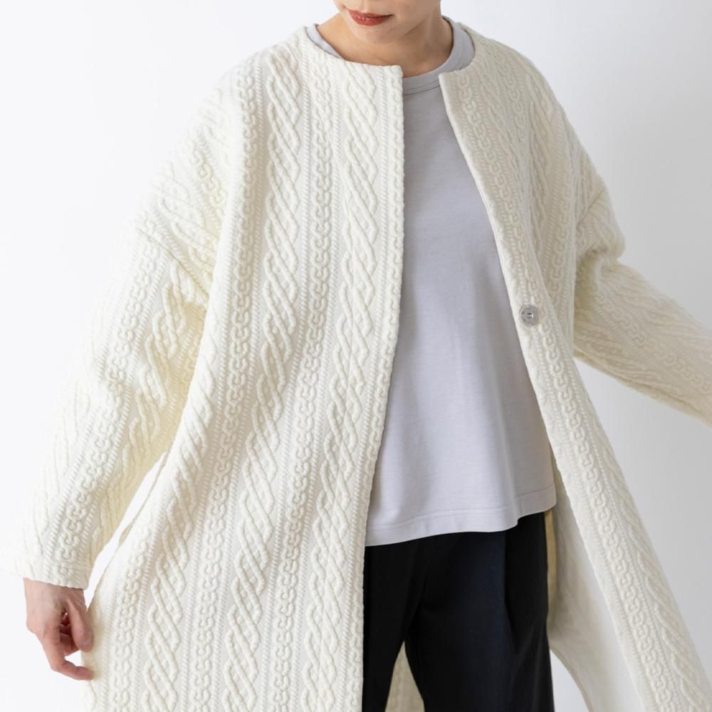 立体的なキルティングが目をひくカットソー素材のロングカーディガン。 一見ニットのようなデザインでありながら、伸縮性のあるコットン素材に細かなステッチを施したキルティング生地を使用。 編み柄にはアイルランドの伝統的なアラン柄を用いています。