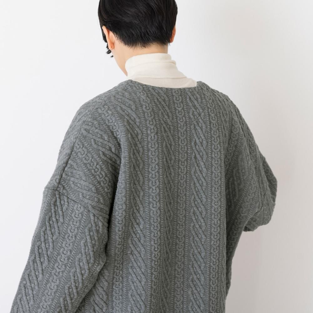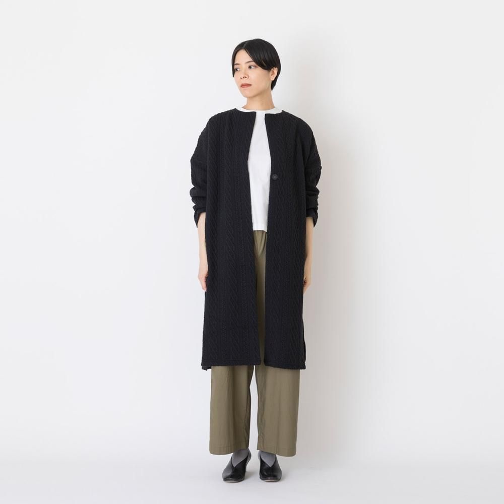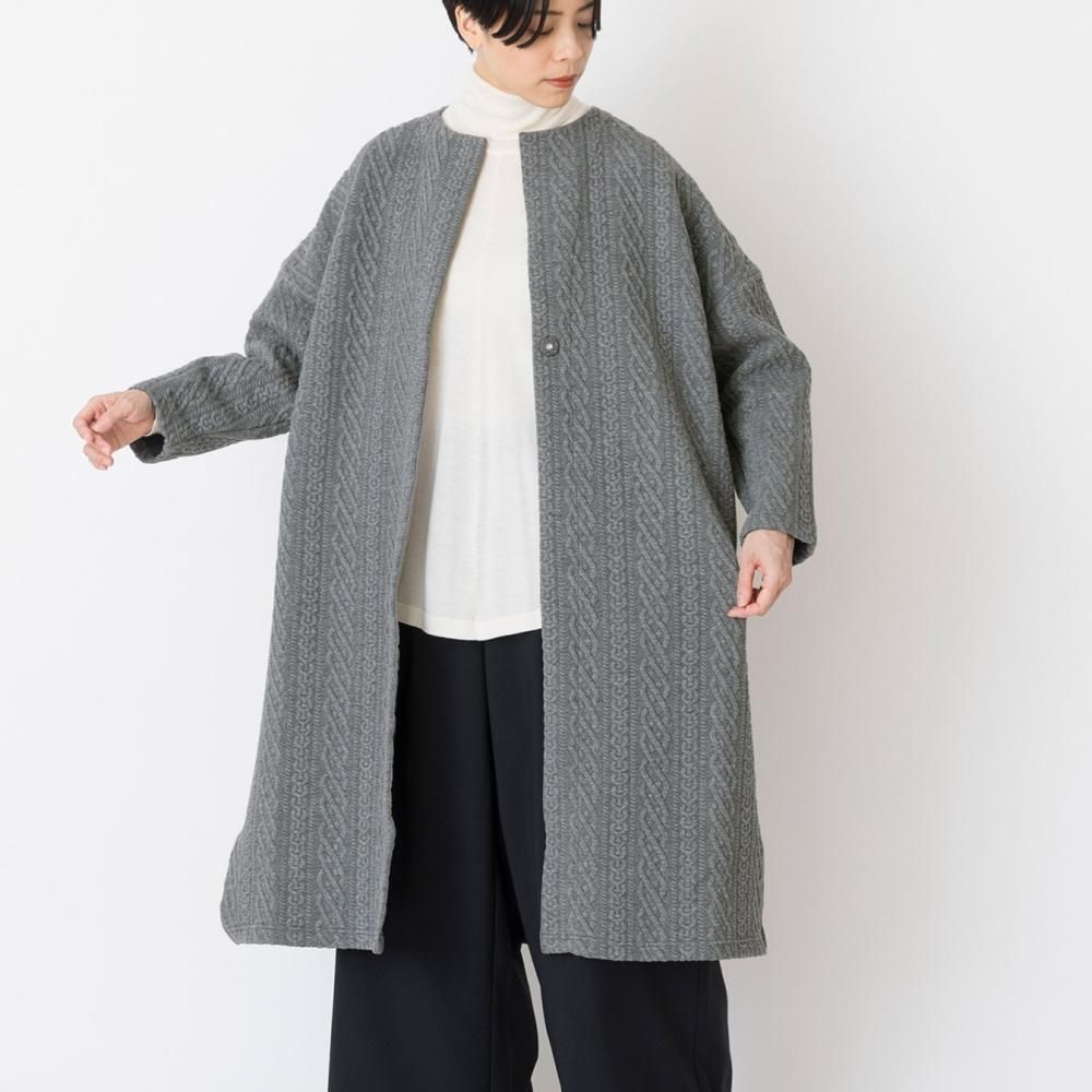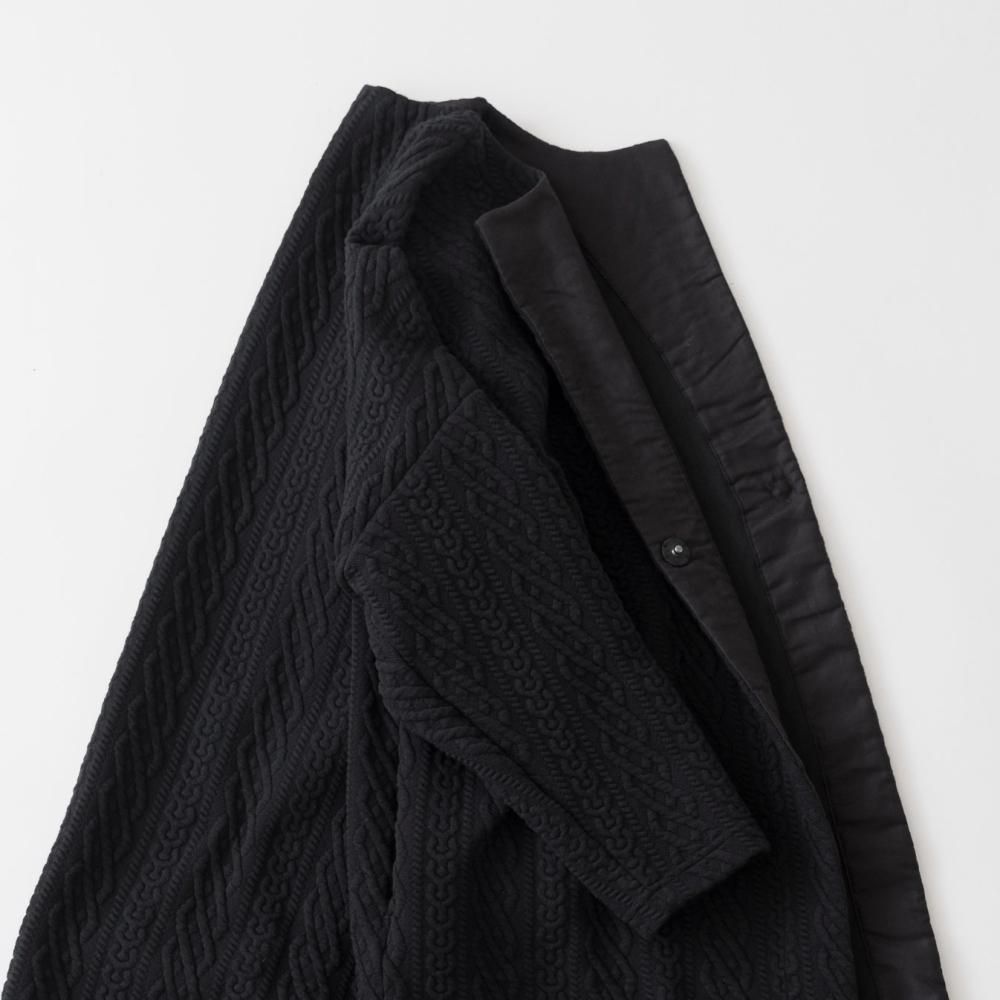 立体的なキルティングが目をひくカットソー素材のロングカーディガン。 一見ニットのようなデザインでありながら、伸縮性のあるコットン素材に細かなステッチを施したキルティング生地を使用。 編み柄にはアイルランドの伝統的なアラン柄を用いています。