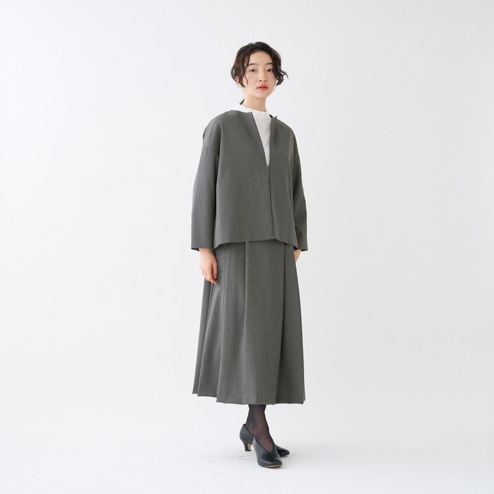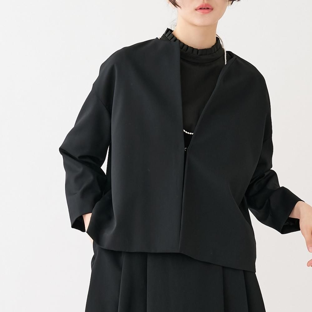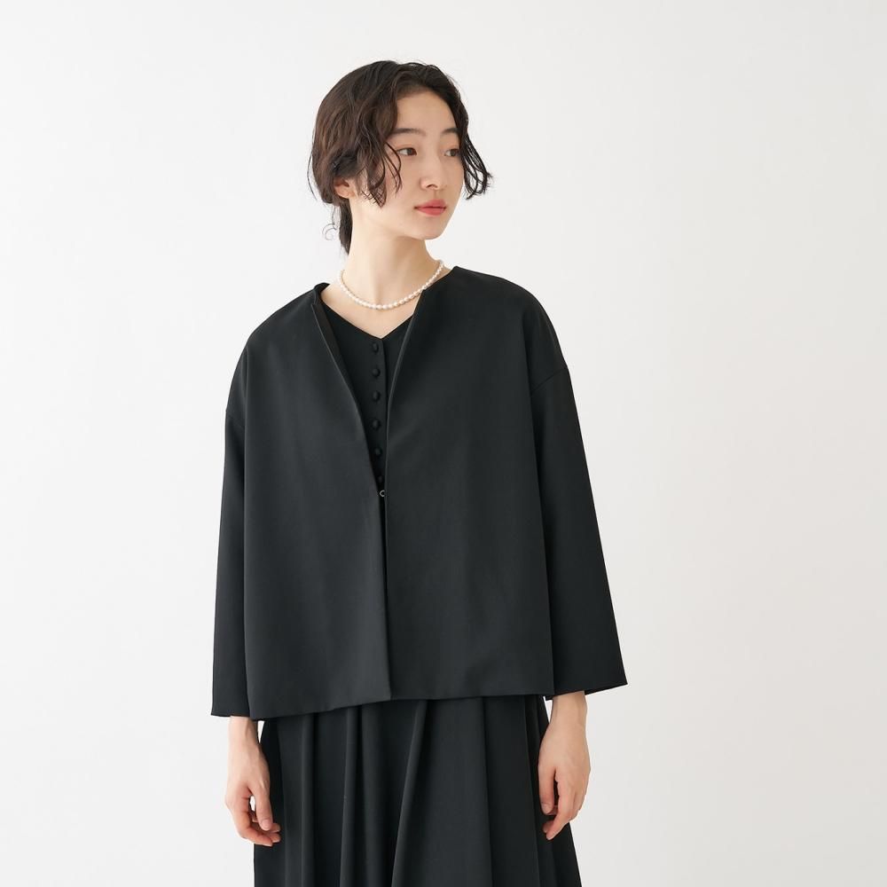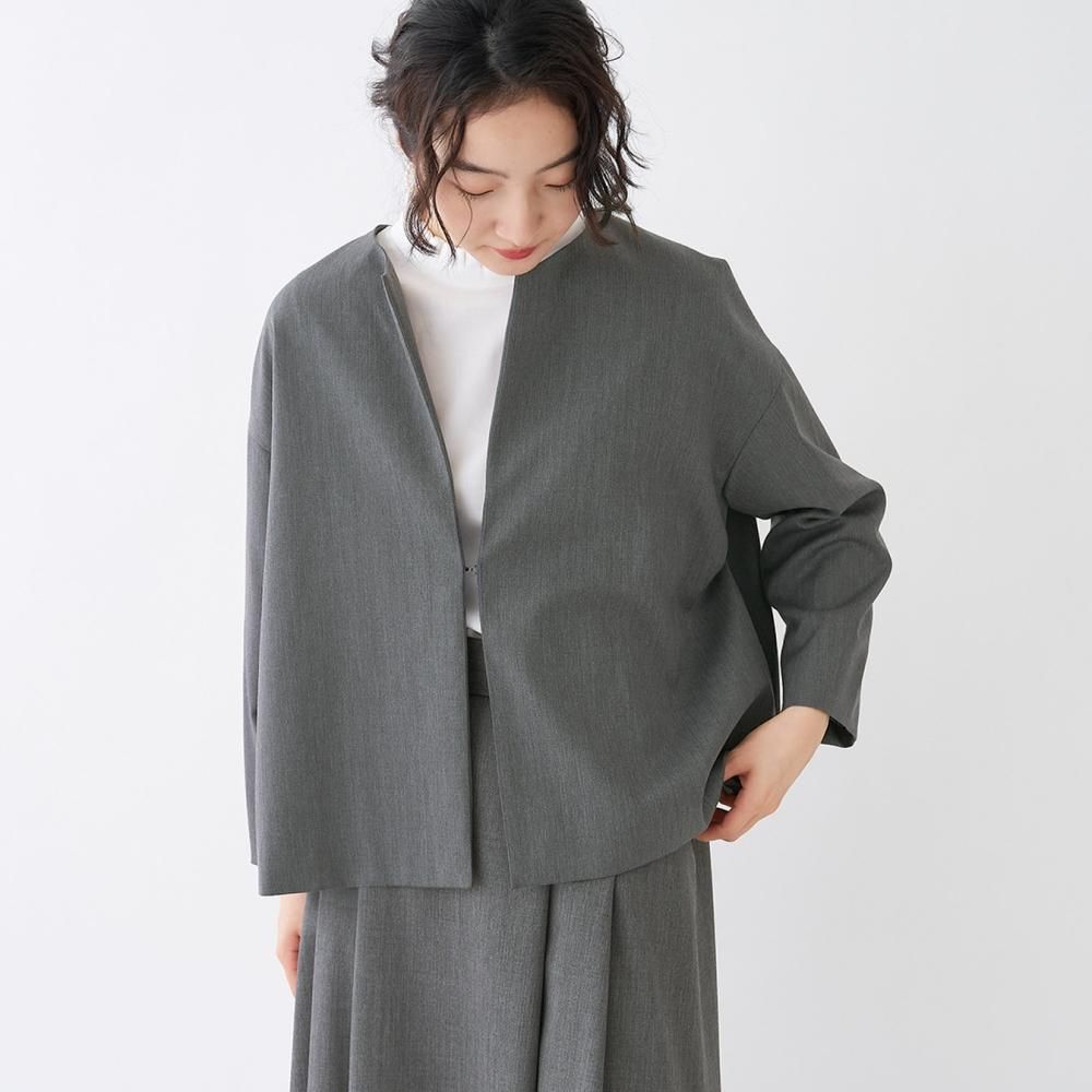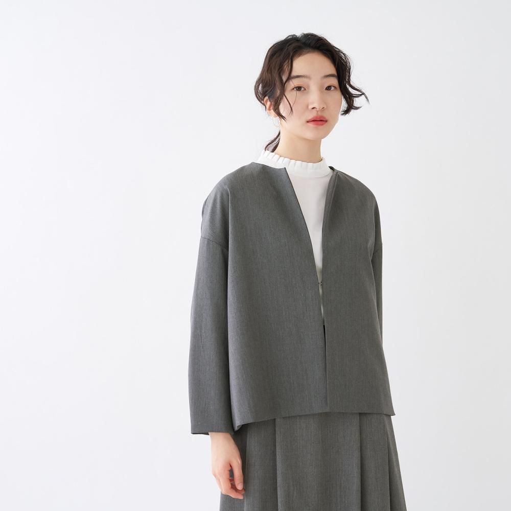 フロントにボタンのない、ミニマルなノーカラージャケット。 やや肩の下がるドロップショルダーでゆとりのあるデザイン。 袖丈や裾丈はすっきりとした短めのシルエットで、自然と上半身をスリムに見せてくれます。 同素材のスカートやワンピース、パンツと組み合わせてお気に入りのセットアップスタイルをお楽しみください。