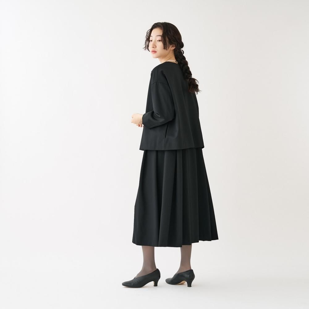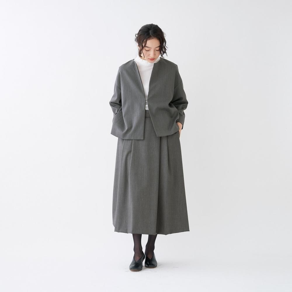 コートやスーツなどに用いられる事の多い、織りが密で目の詰んだ丈夫なウール生地を使用。 張りがあり、適度にやわらかく、生地には美しいほのかな光沢があり、繊細でしなやかな手触りが持ち味です。 横糸にストレッチ性のあるポリウレタン糸を使用して動きやすさをプラスしています。
