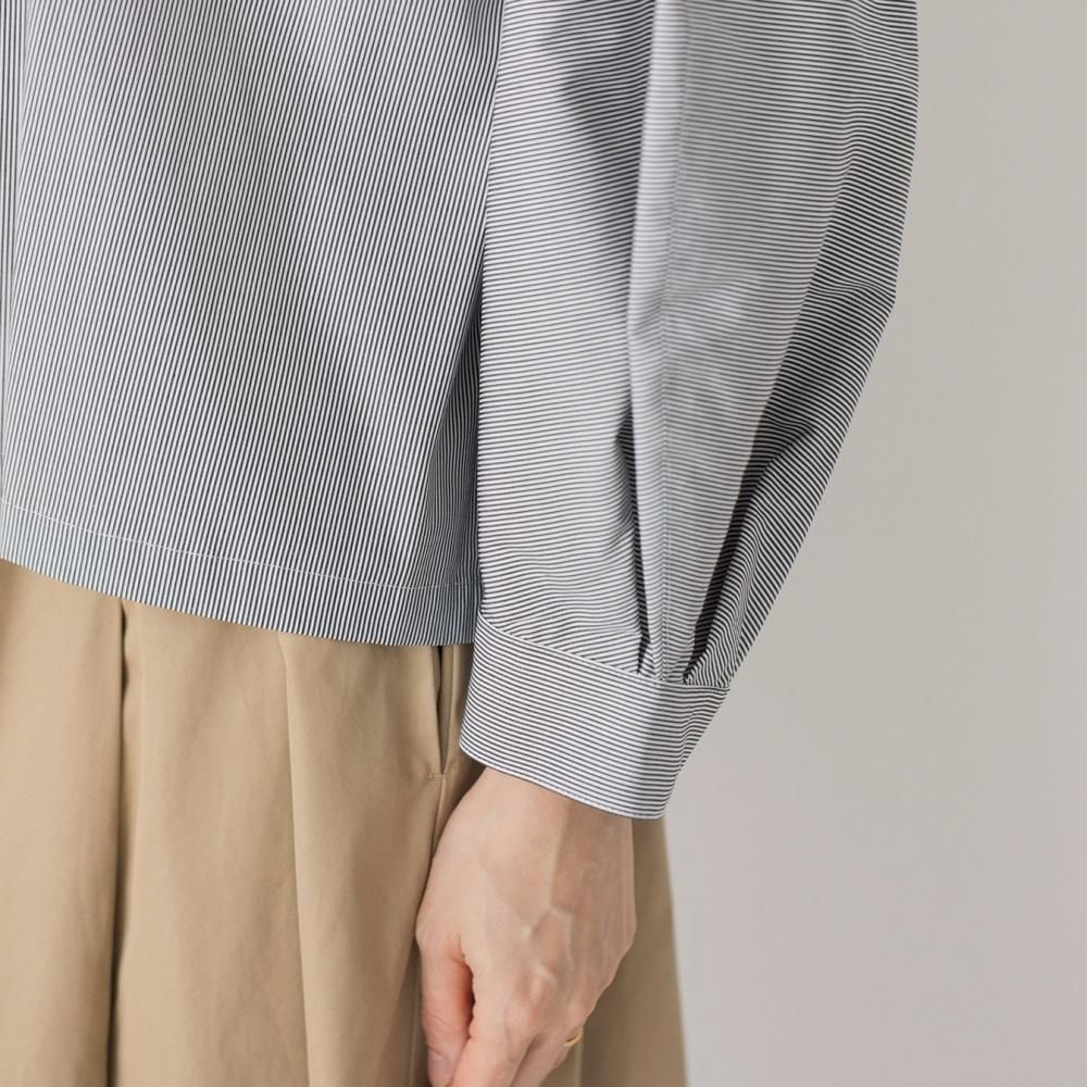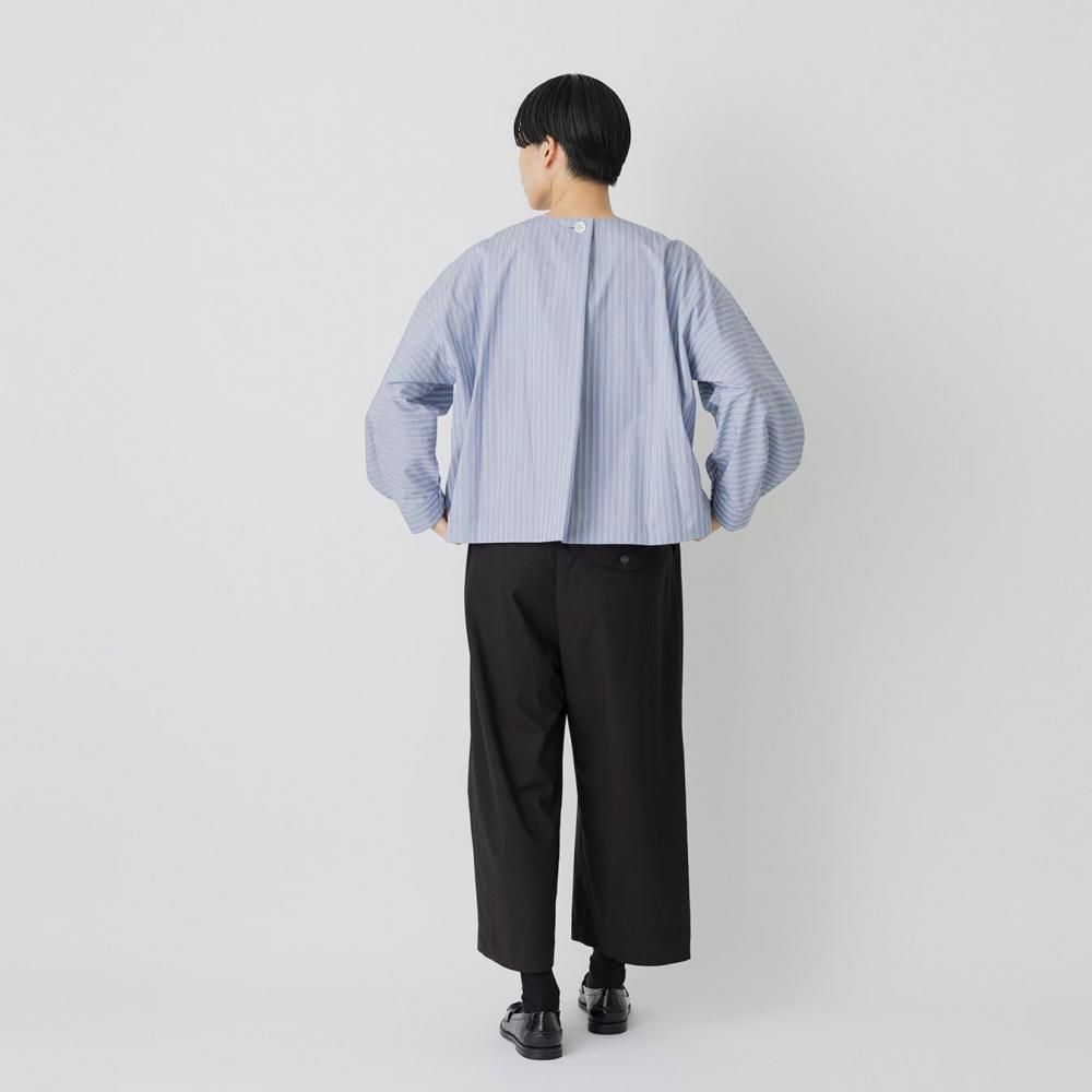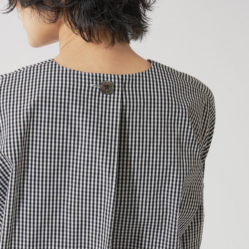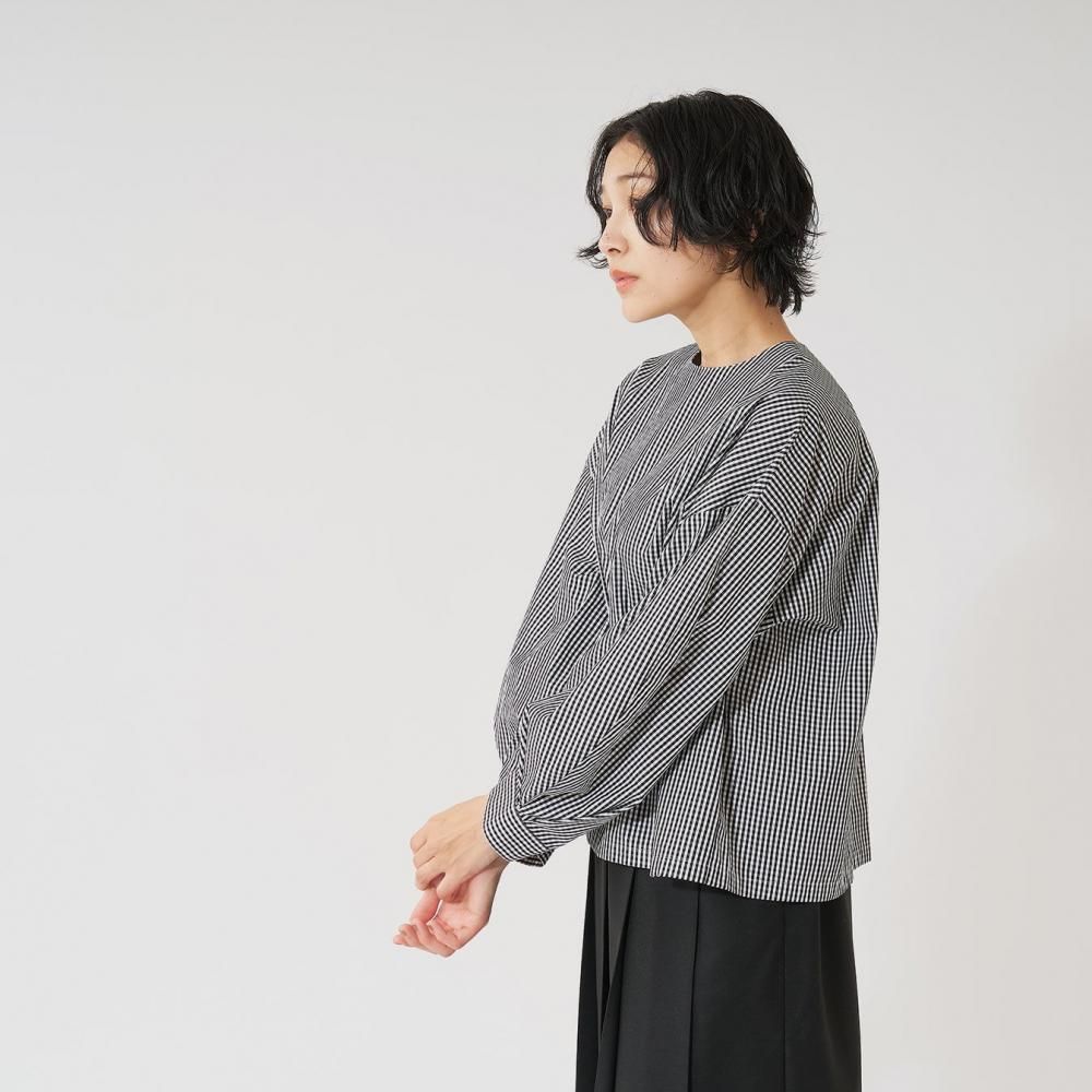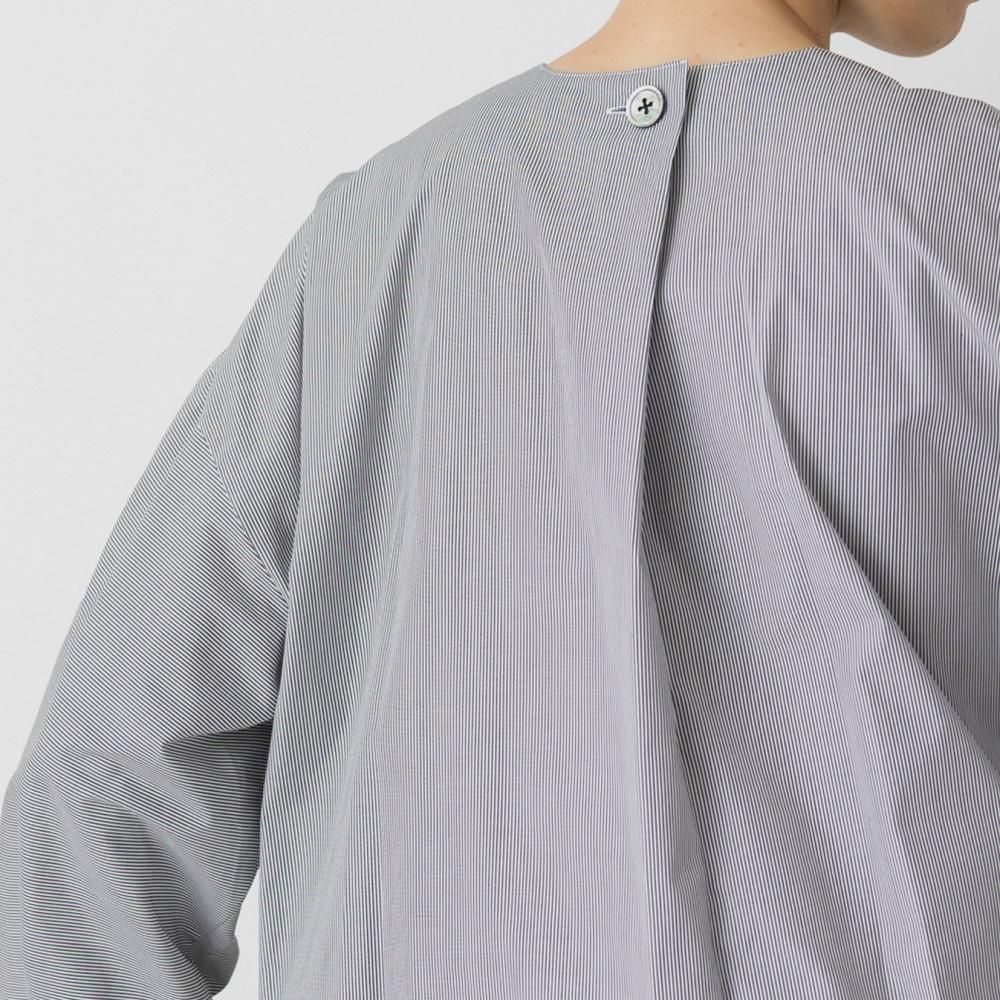 衿元は首に沿うコンパクトなネックライン。 やや肩が落ちるカッティング、カフスにタックを寄せてふくらんだ袖、背中側にはタックとボタンをあしらいミニマルながら印象的な1着に仕上げました。