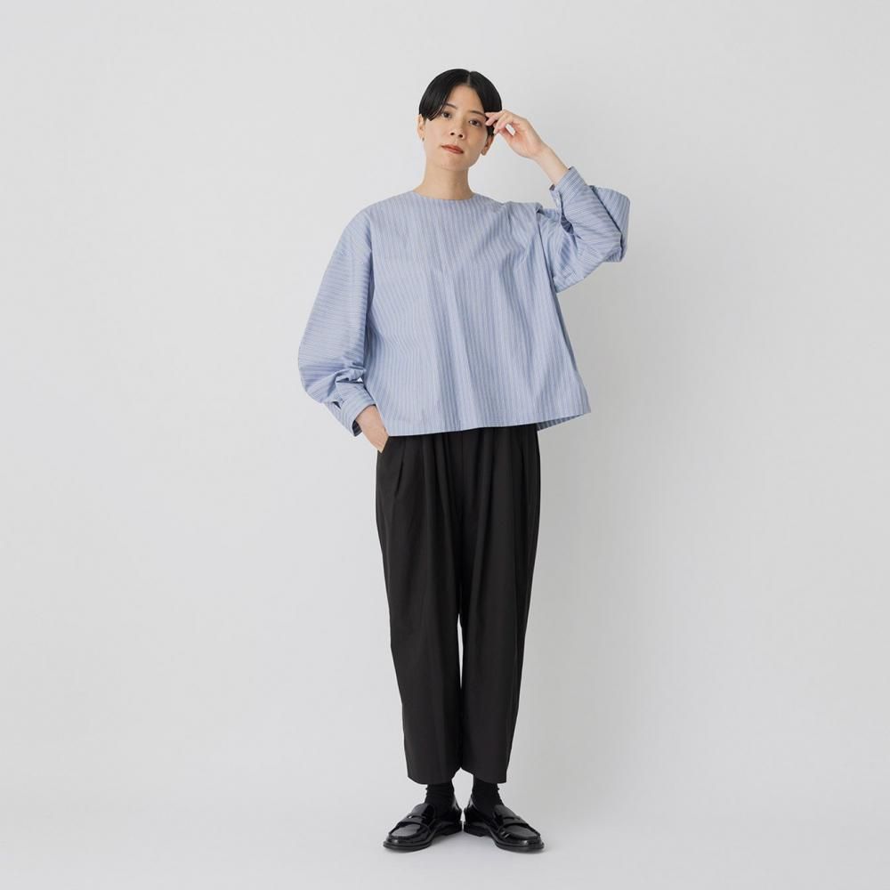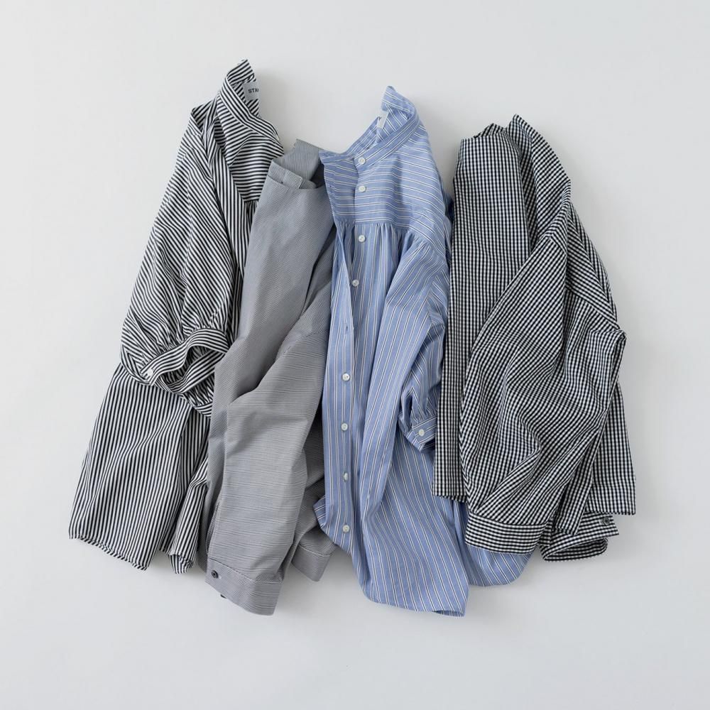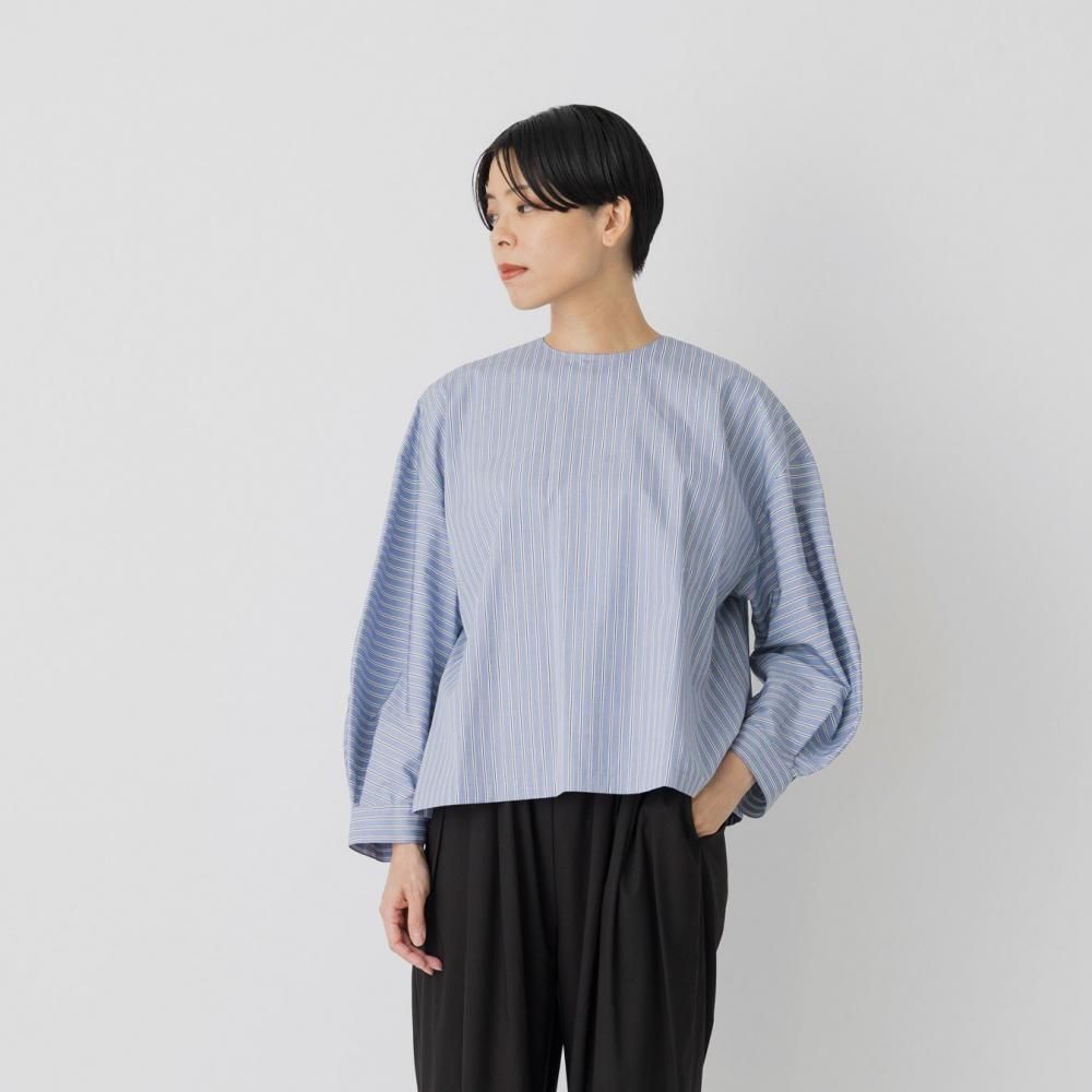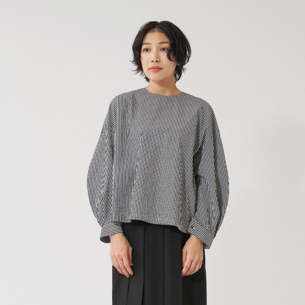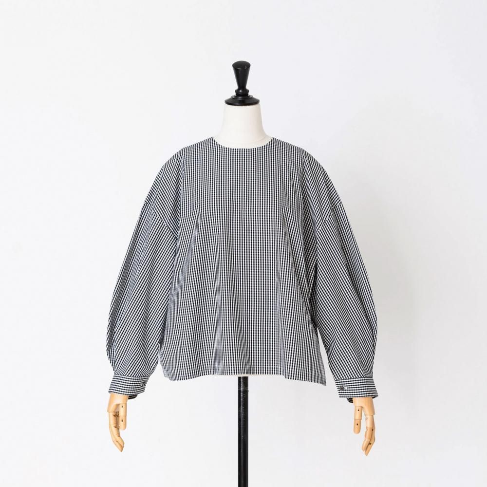 衿元は首に沿うコンパクトなネックライン。 やや肩が落ちるカッティング、カフスにタックを寄せてふくらんだ袖、背中側にはタックとボタンをあしらいミニマルながら印象的な1着に仕上げました。