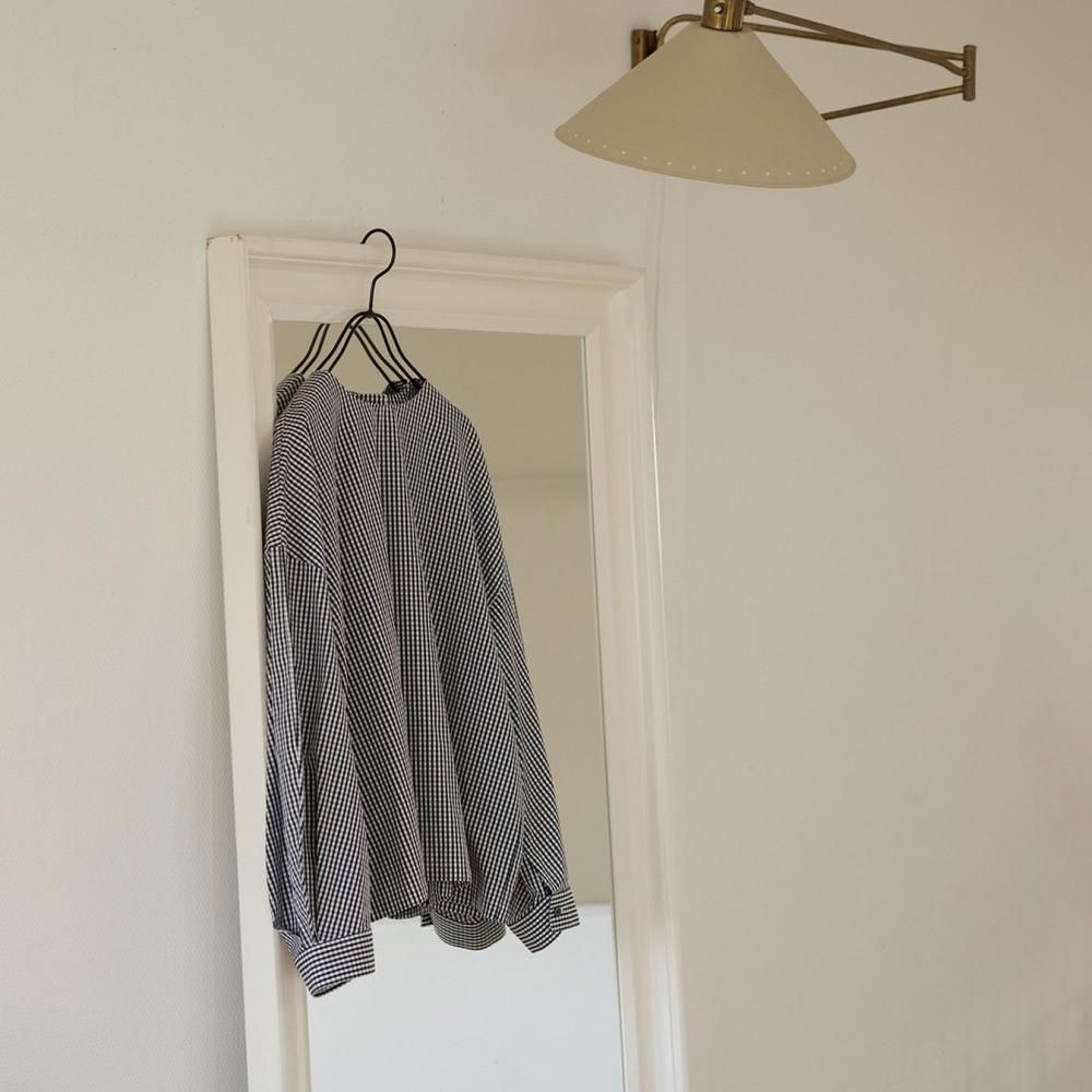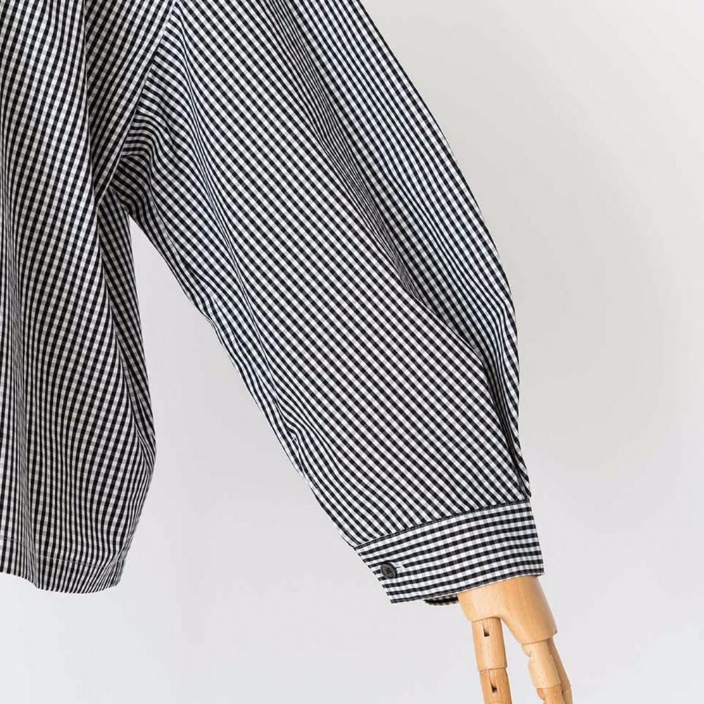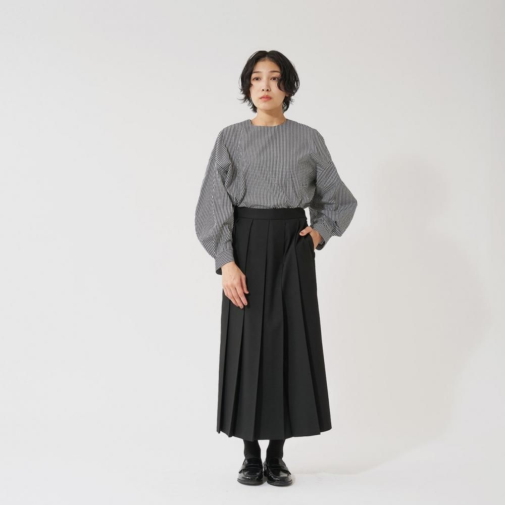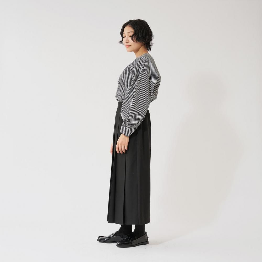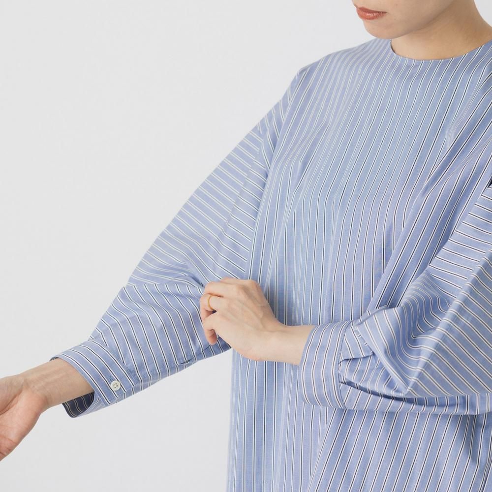 衿元は首に沿うコンパクトなネックライン。 やや肩が落ちるカッティング、カフスにタックを寄せてふくらんだ袖、背中側にはタックとボタンをあしらいミニマルながら印象的な1着に仕上げました。