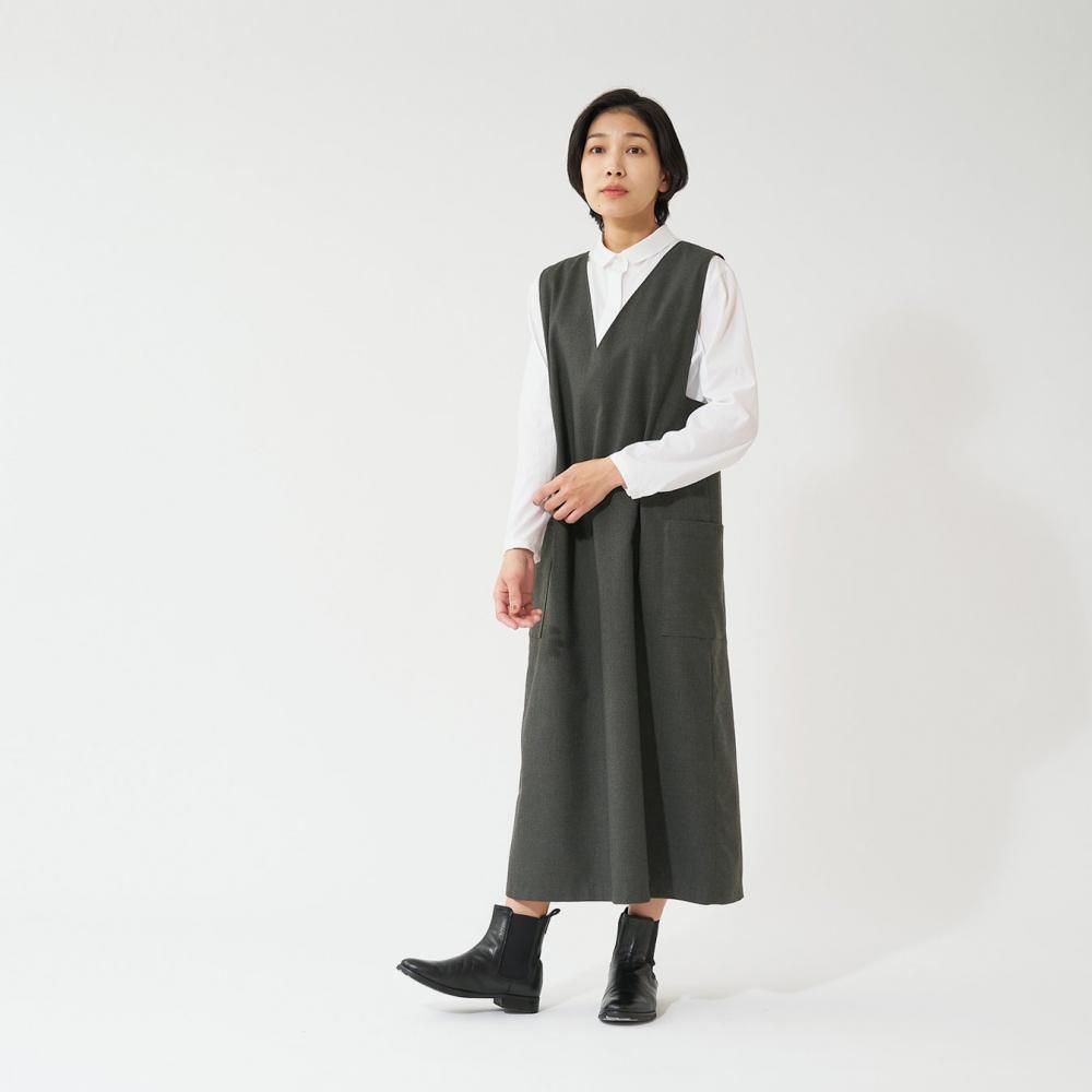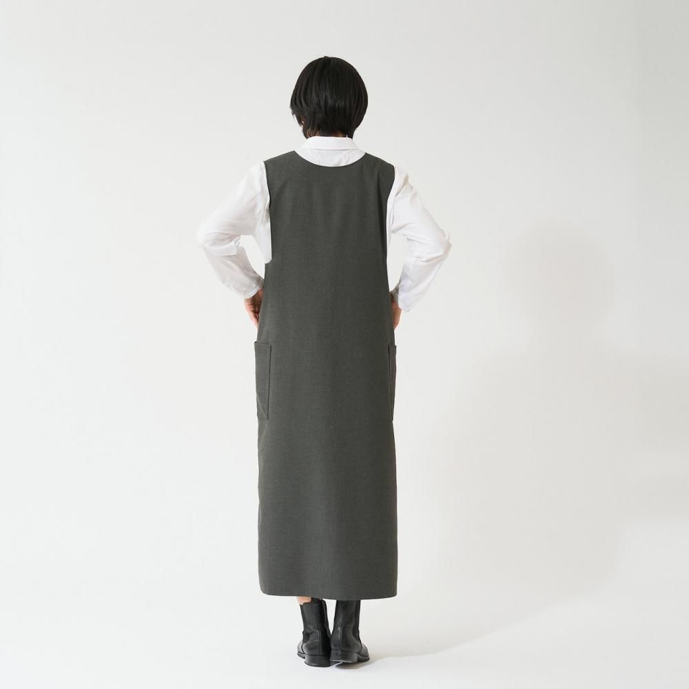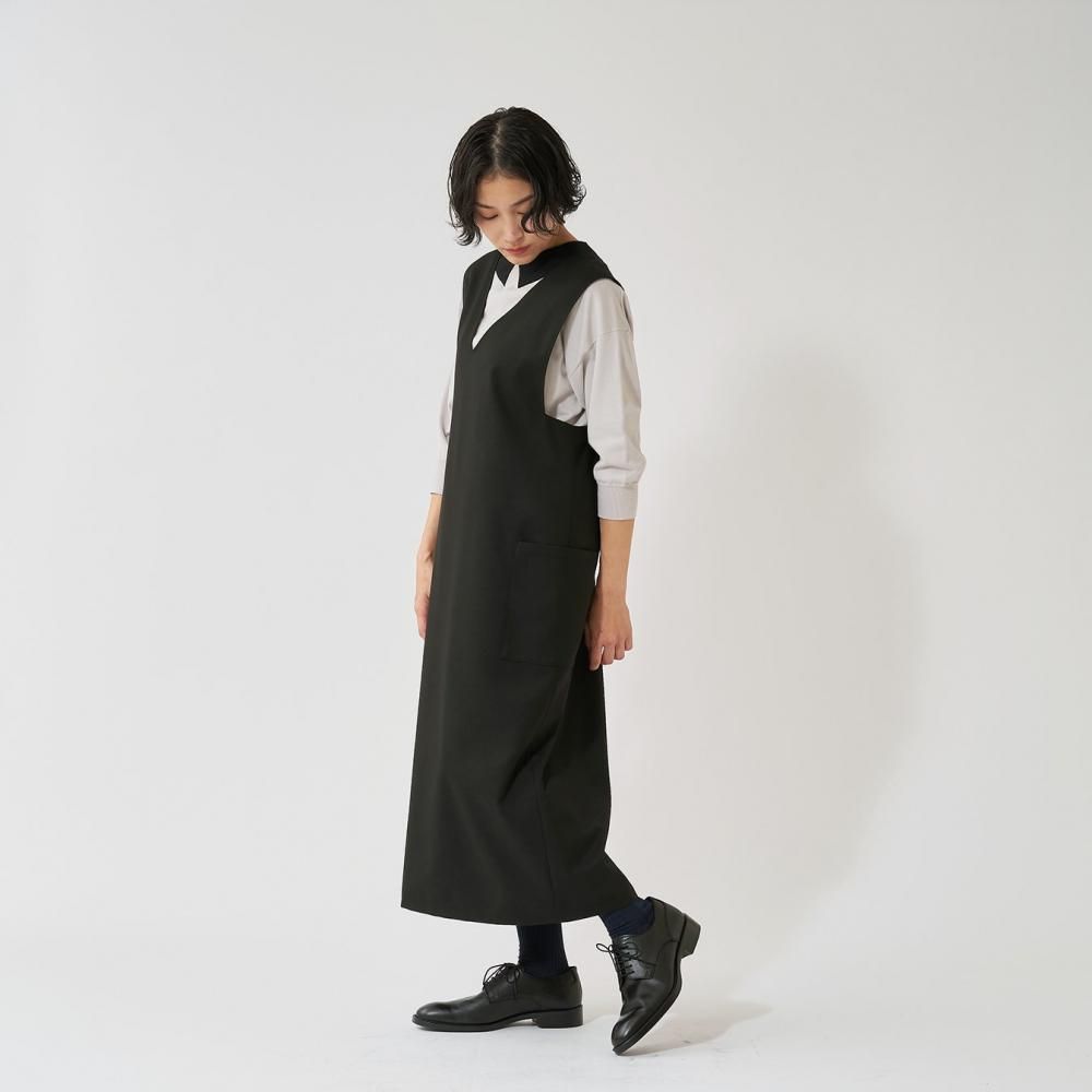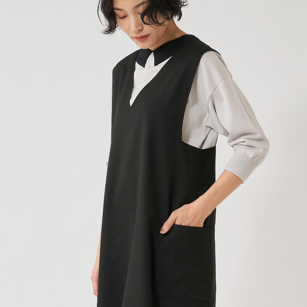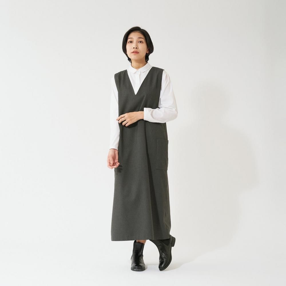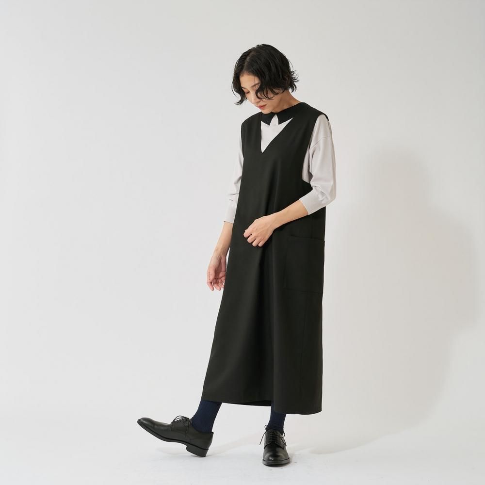 前はVネック、うしろはすっきりとしたクルーネックのジャンパースカート。