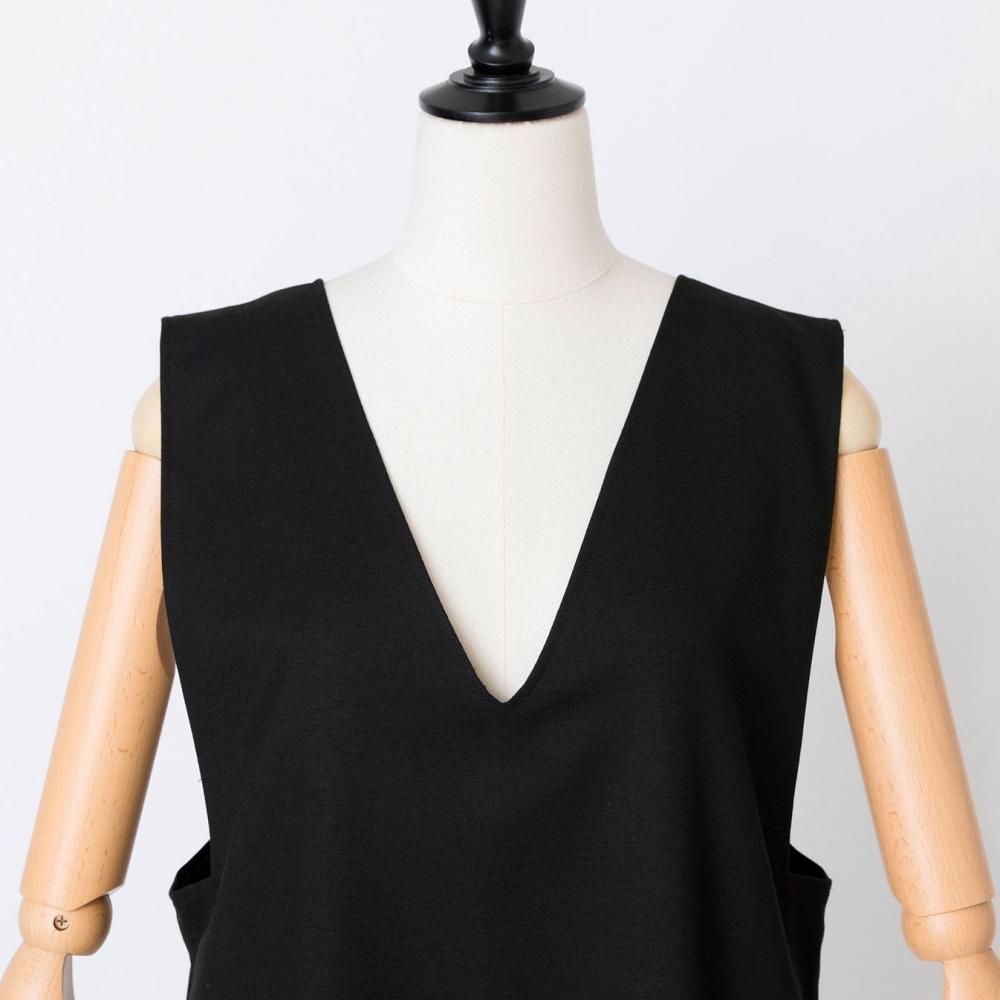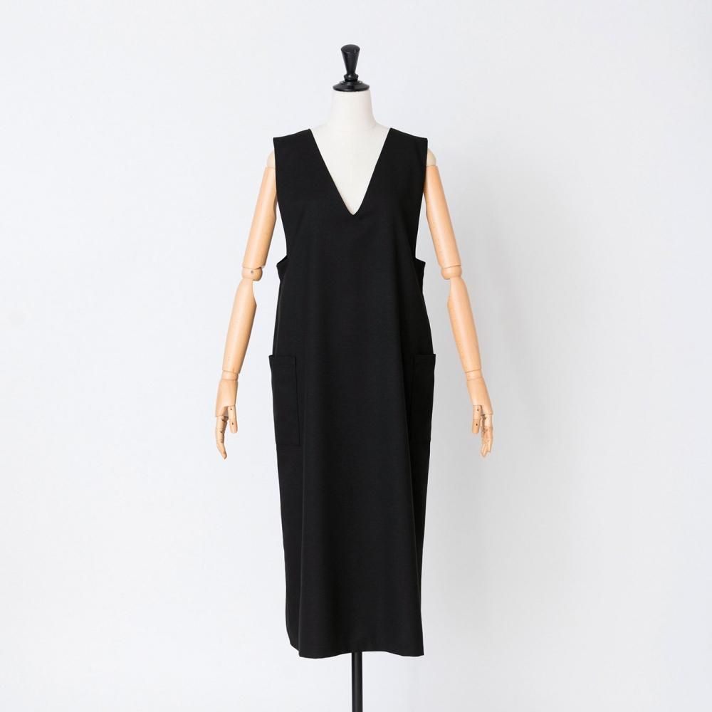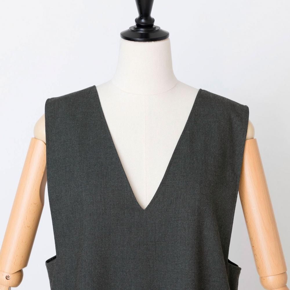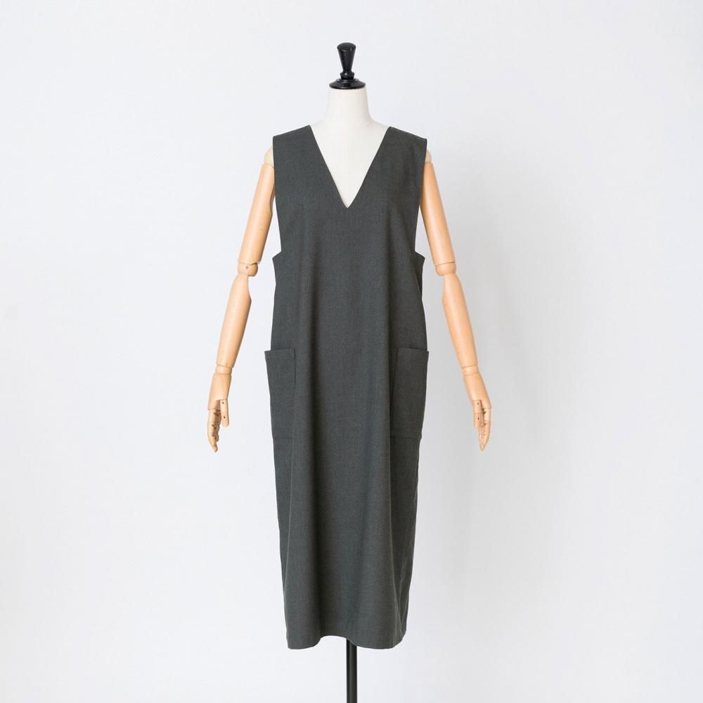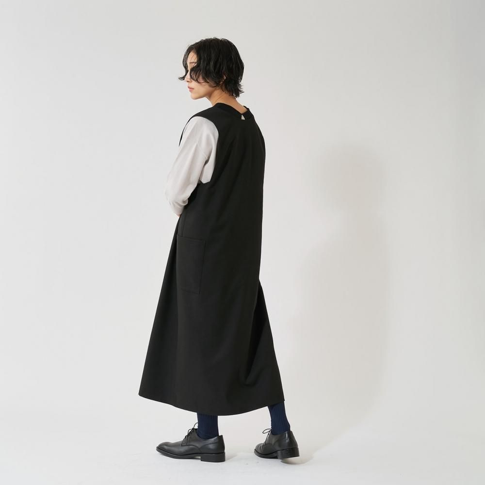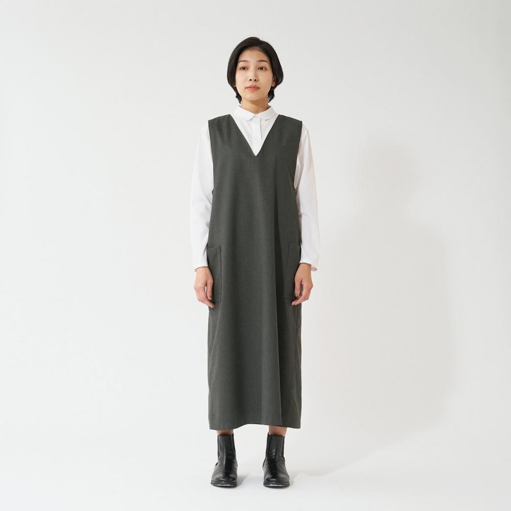 前はVネック、うしろはすっきりとしたクルーネックのジャンパースカート。