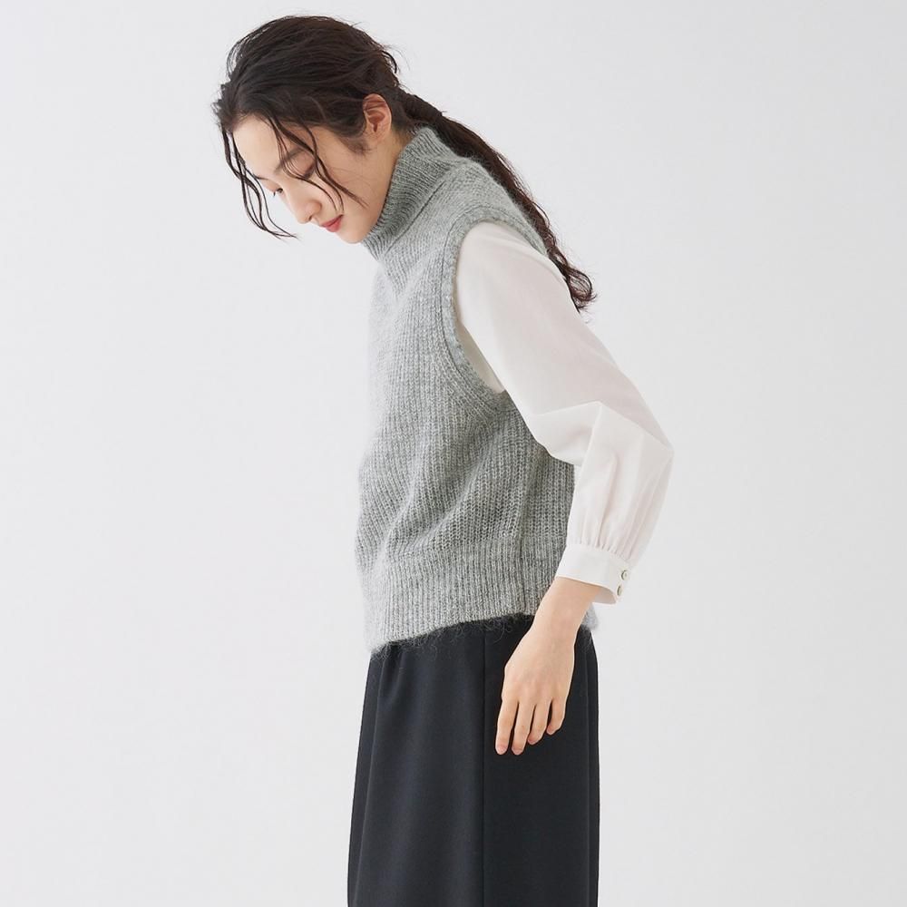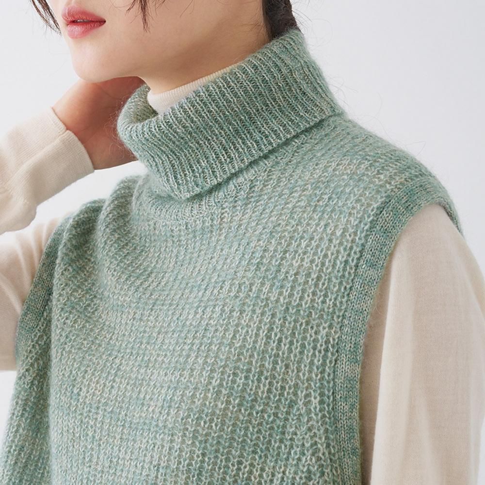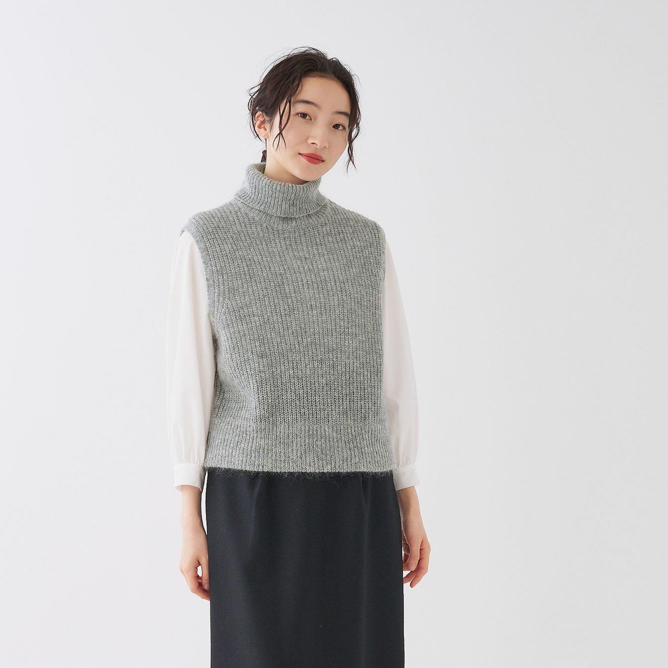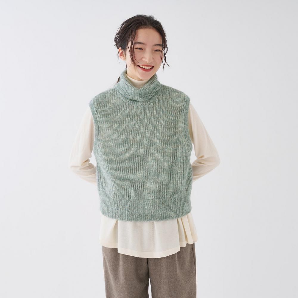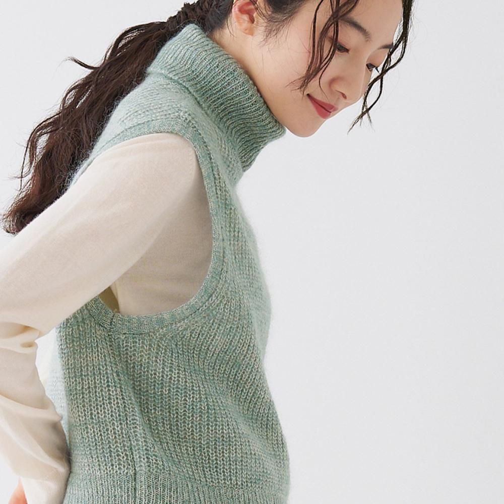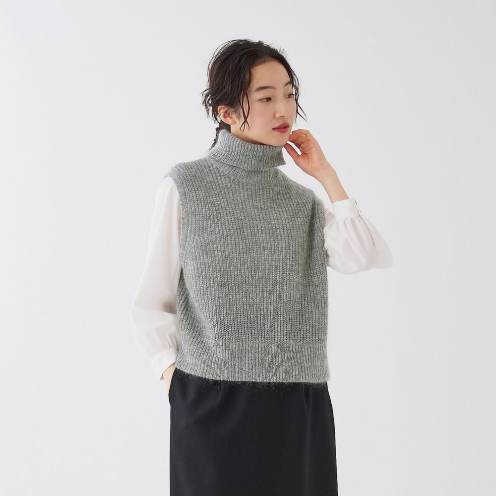 モヘヤのやわらかな風合いが、見た目にもあたたかなタートルネックベスト。