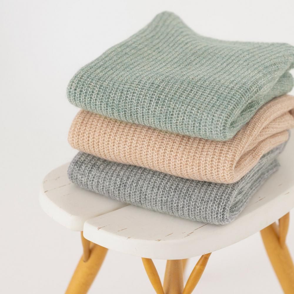 モヘヤの光沢とウールのふっくらとした手触りで、それぞれの良さを引き立てた糸を使用しています。