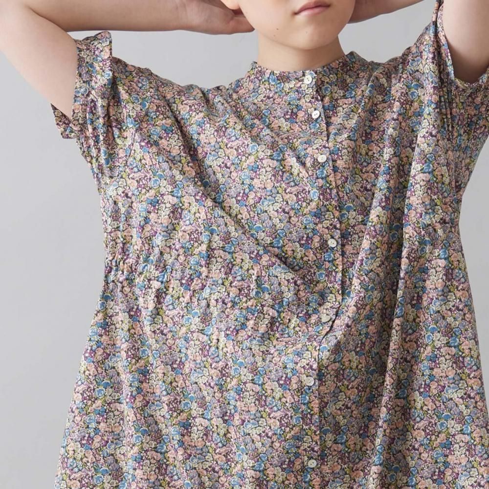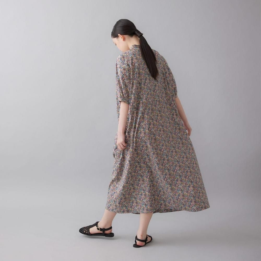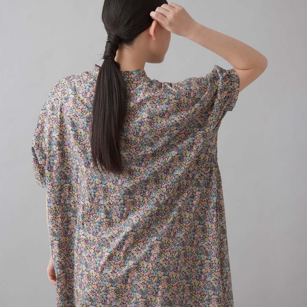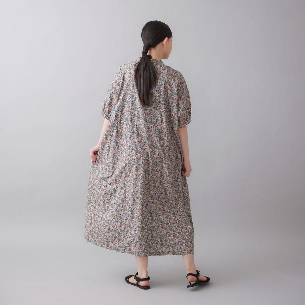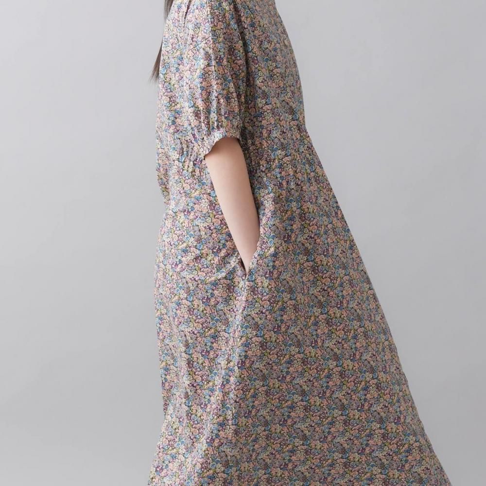 リバティ生地をたっぷりと使用した、前ボタン仕立てのワンピース。