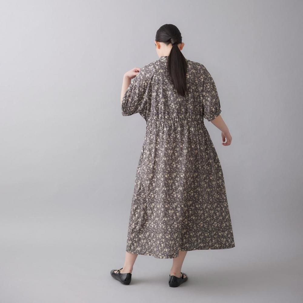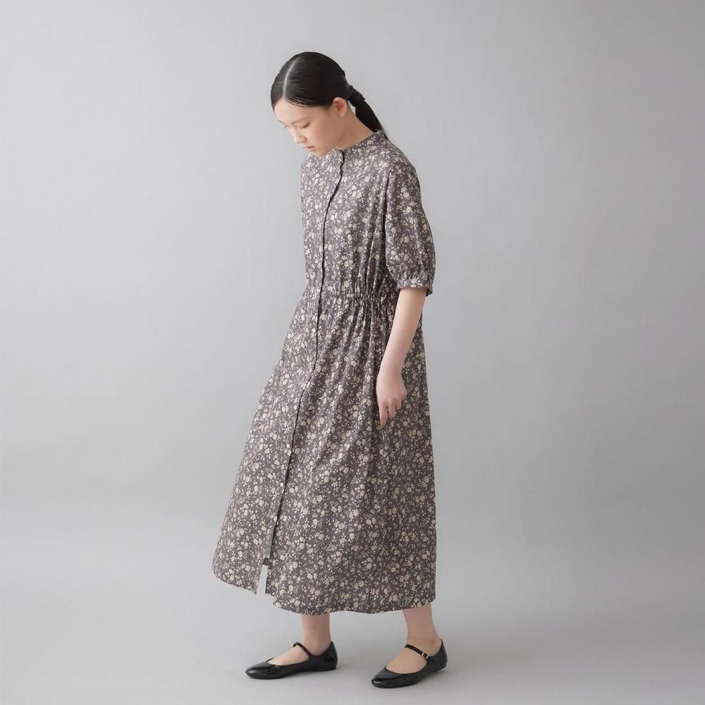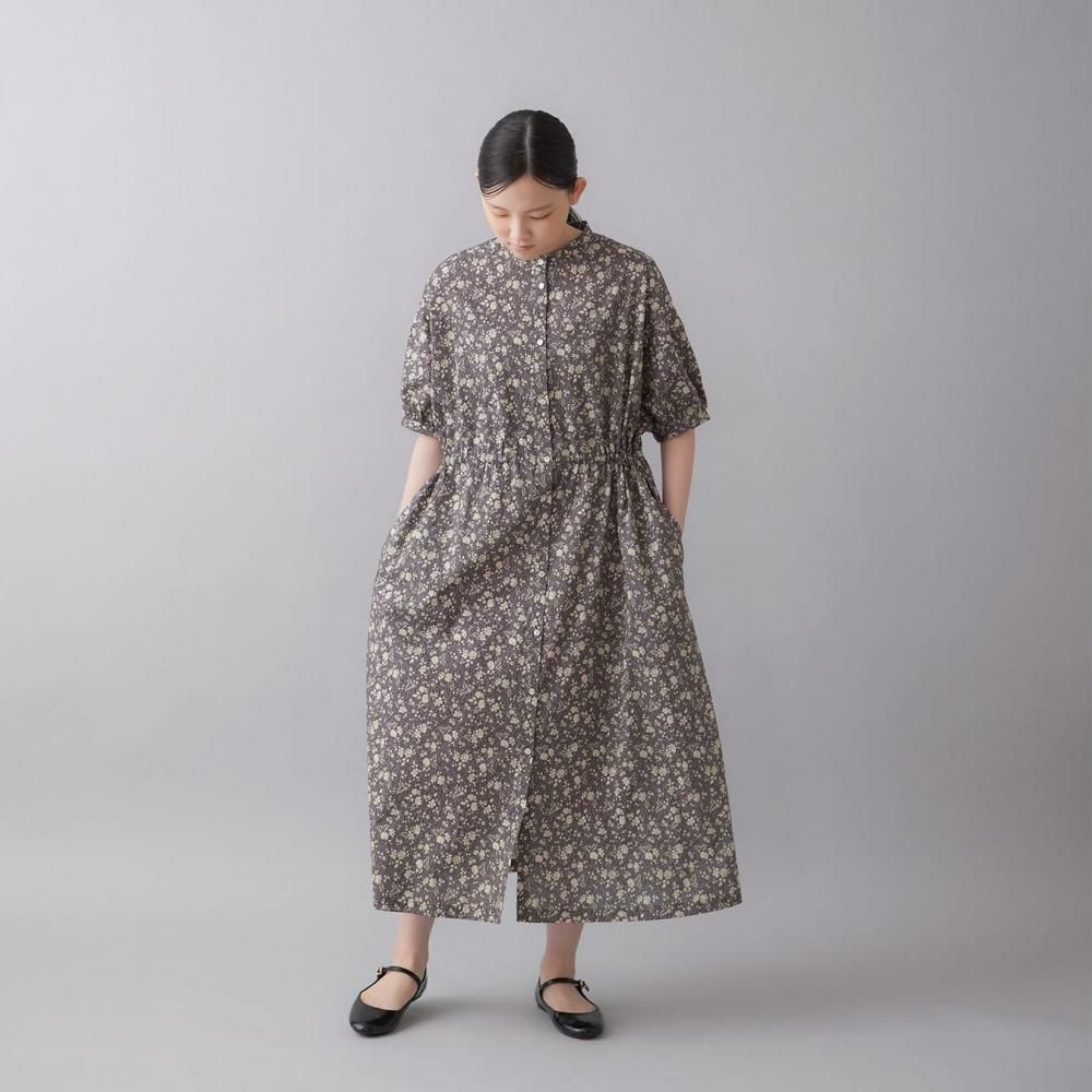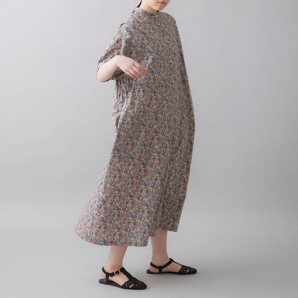 リバティ生地をたっぷりと使用した、前ボタン仕立てのワンピース。