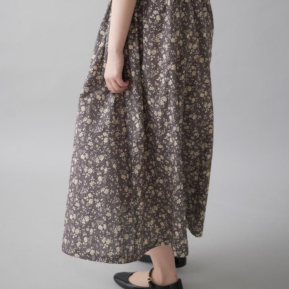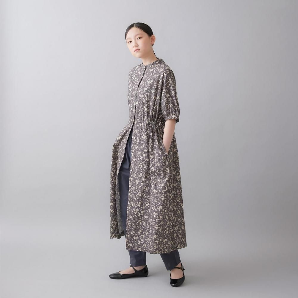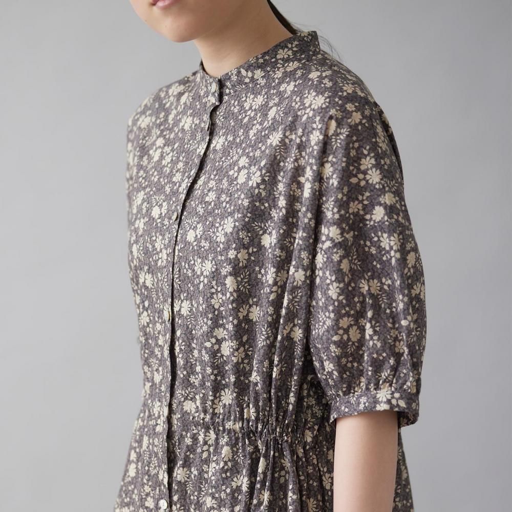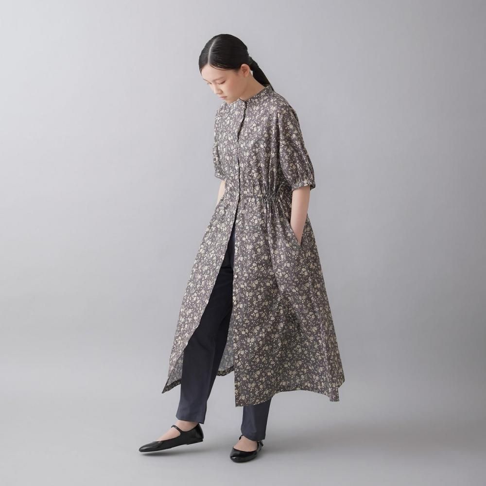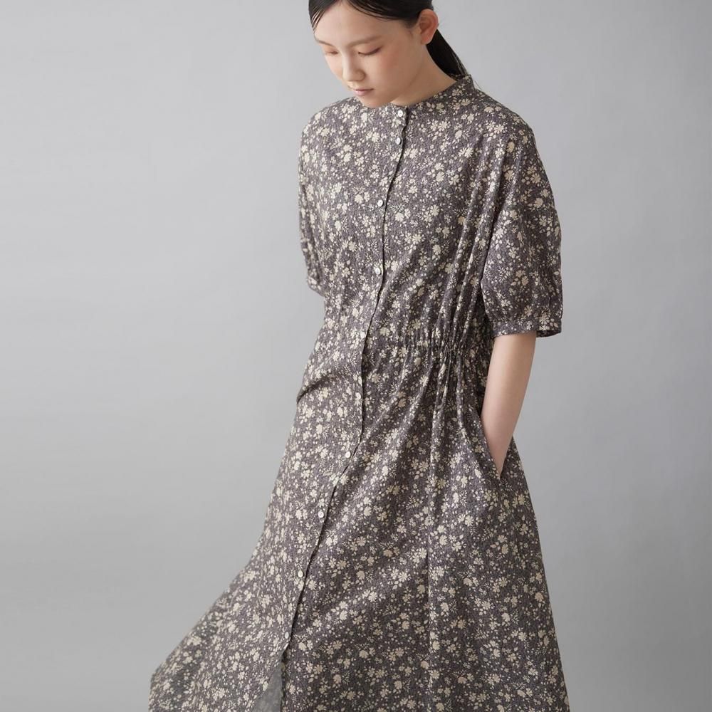 リバティ生地をたっぷりと使用した、前ボタン仕立てのワンピース。