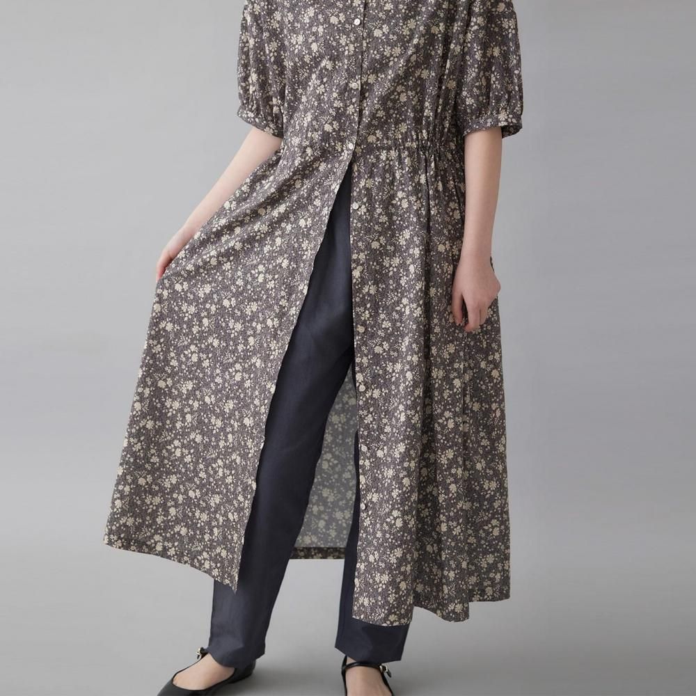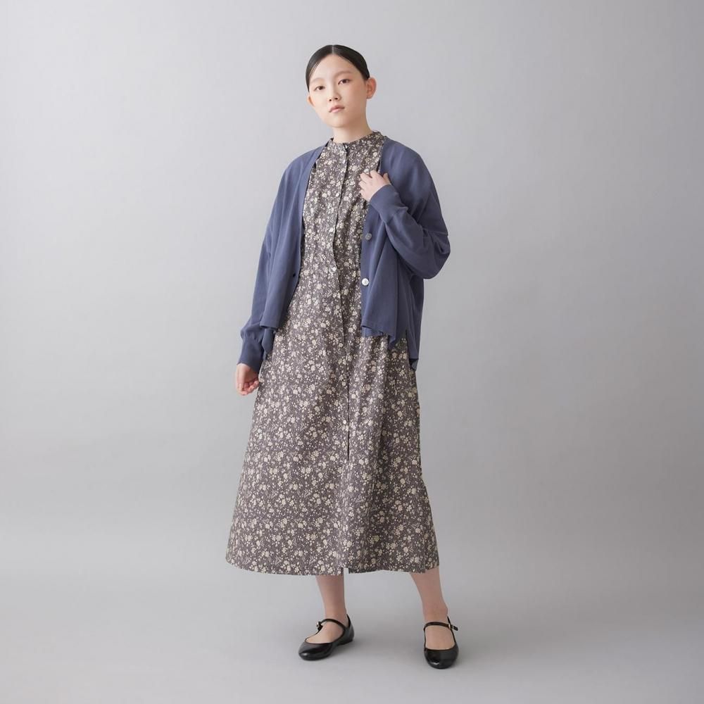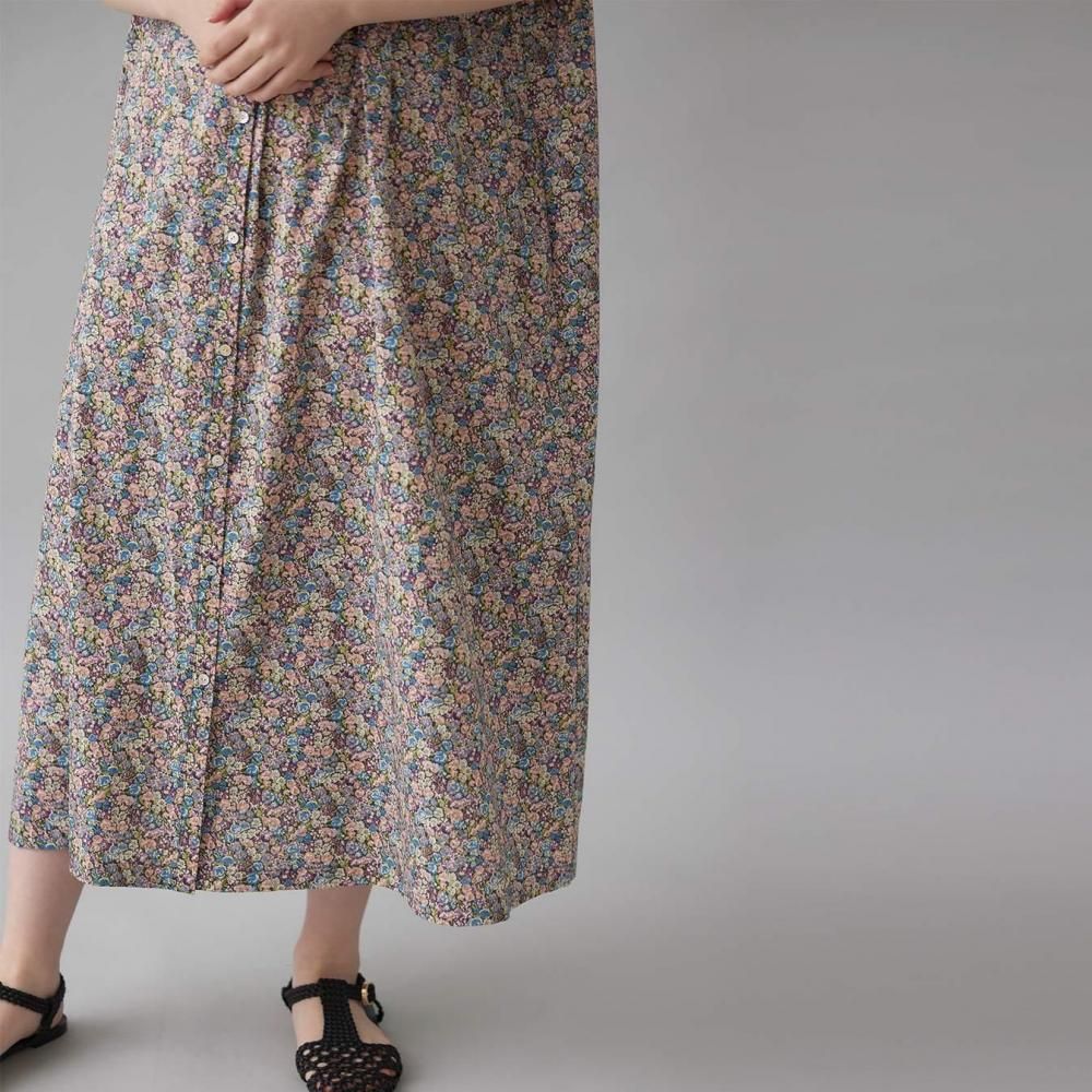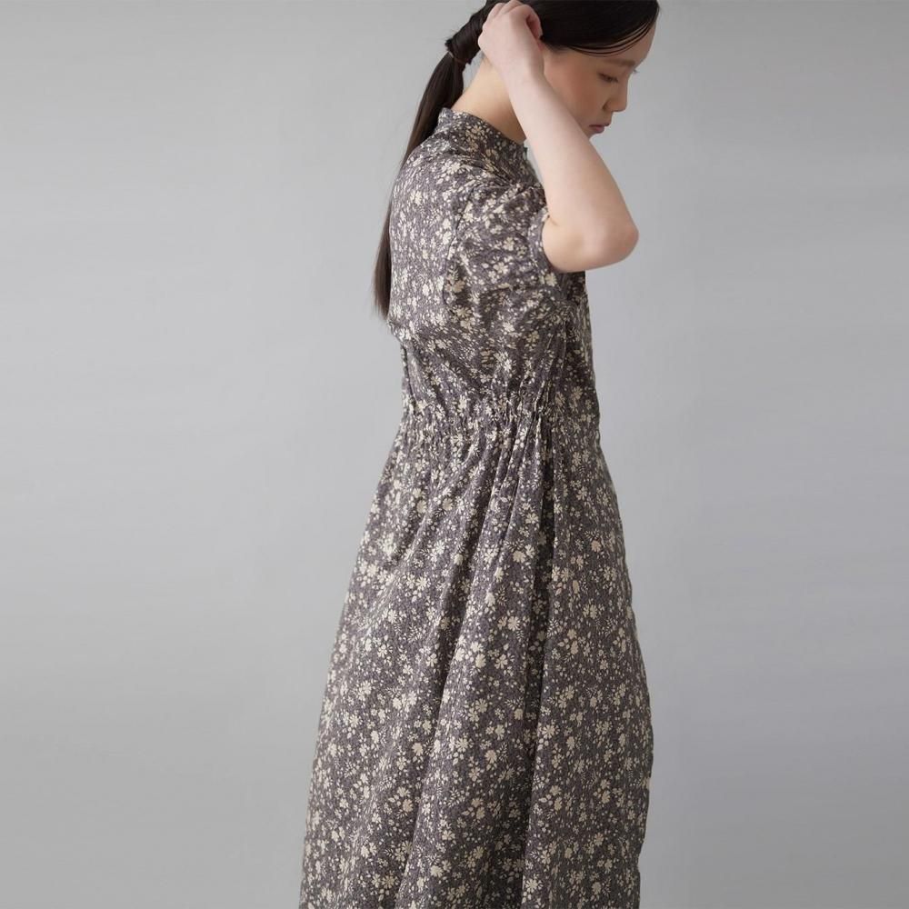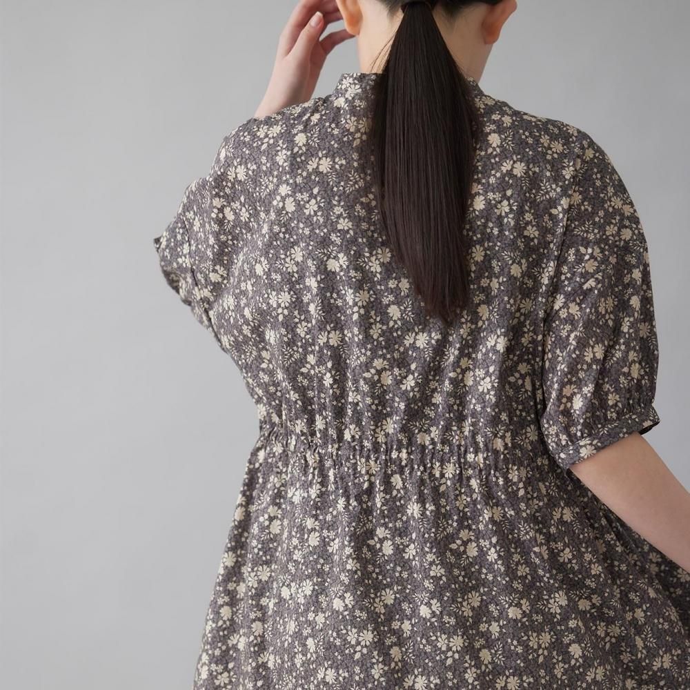 リバティ生地をたっぷりと使用した、前ボタン仕立てのワンピース。