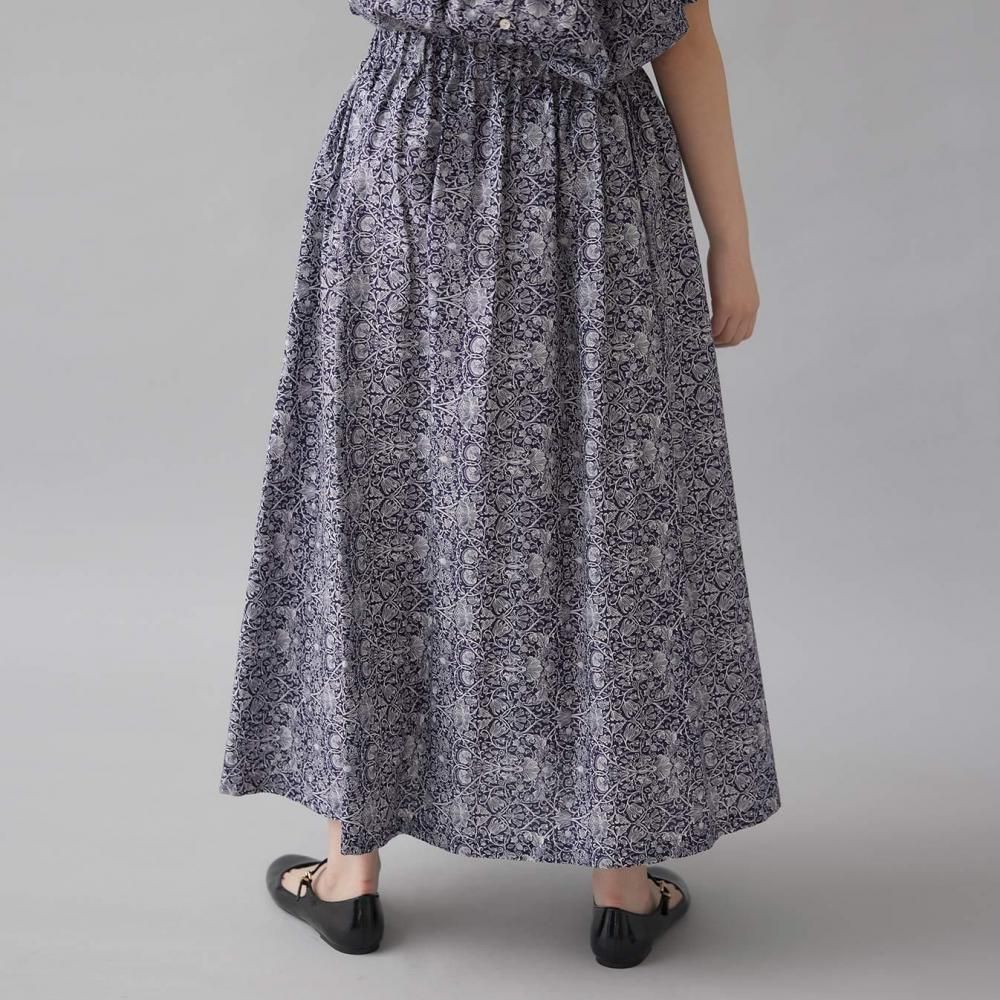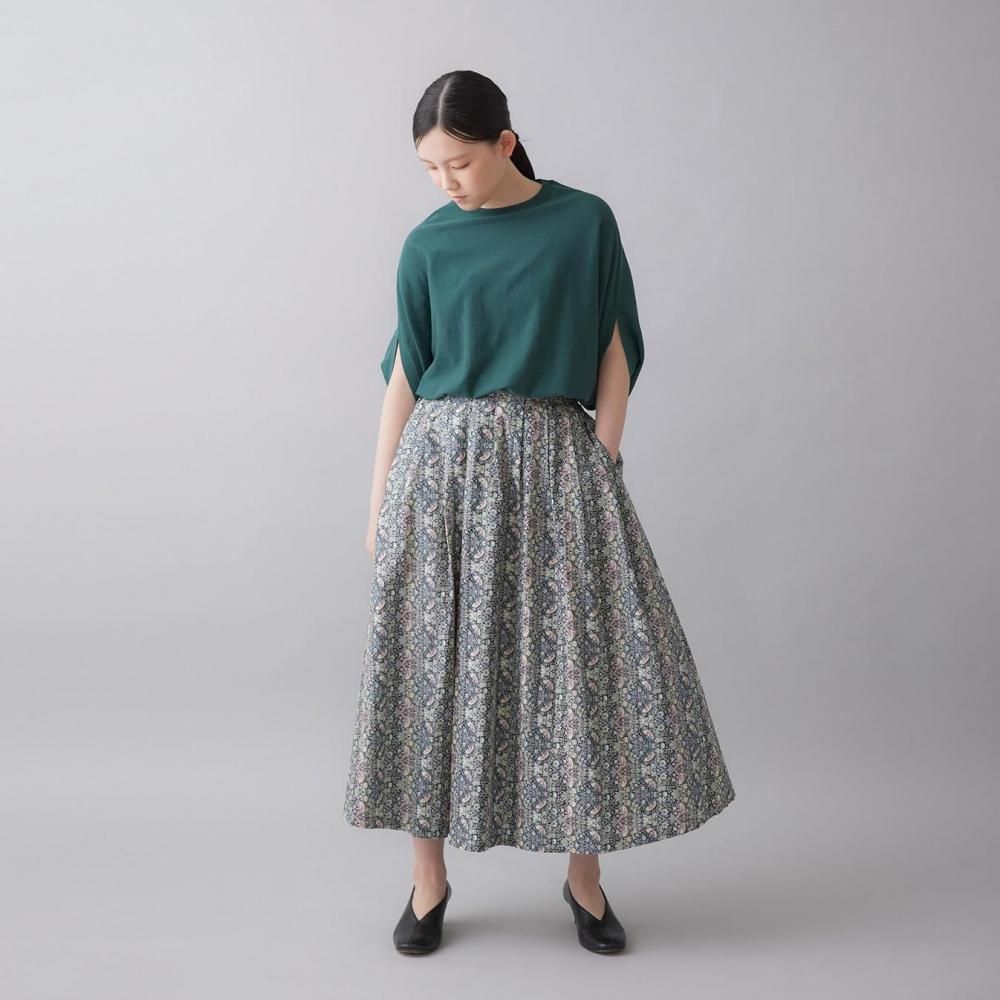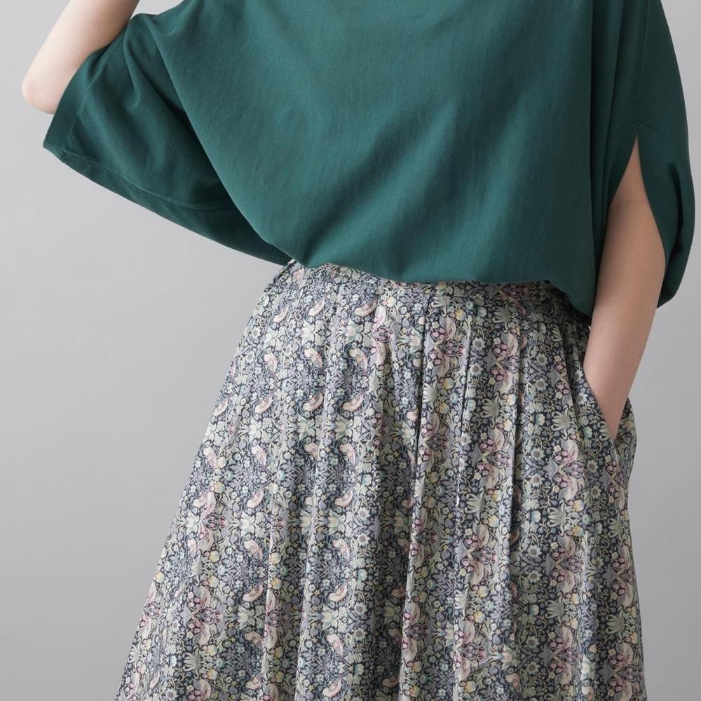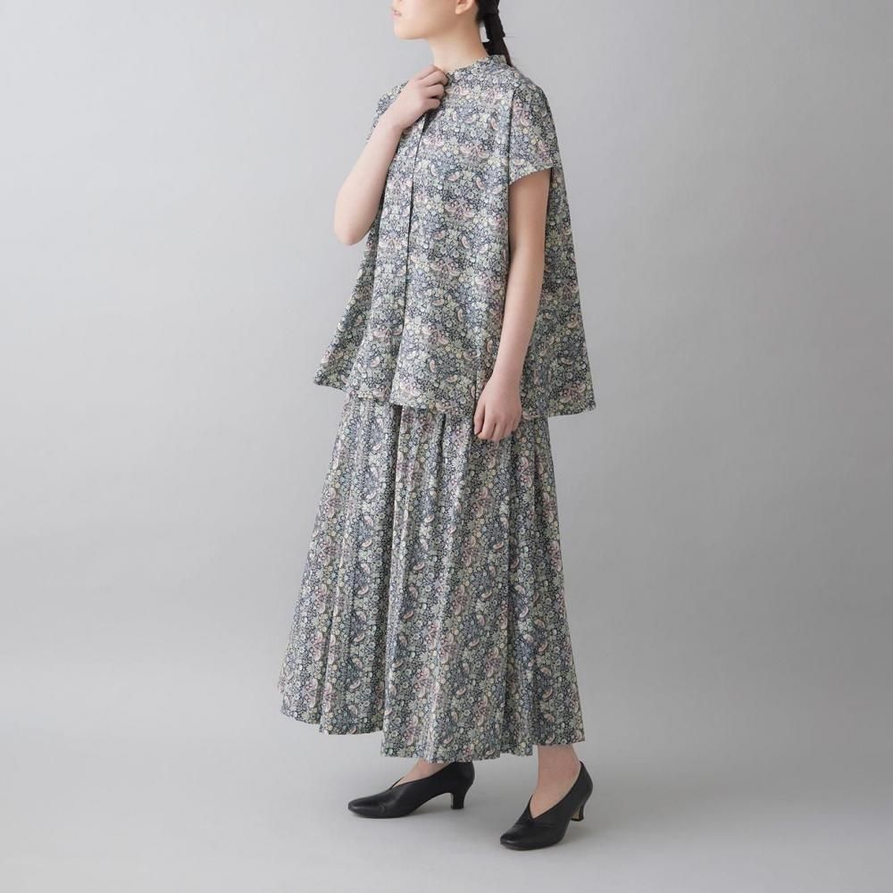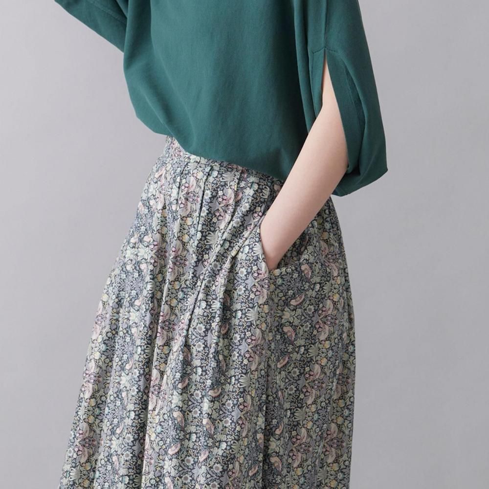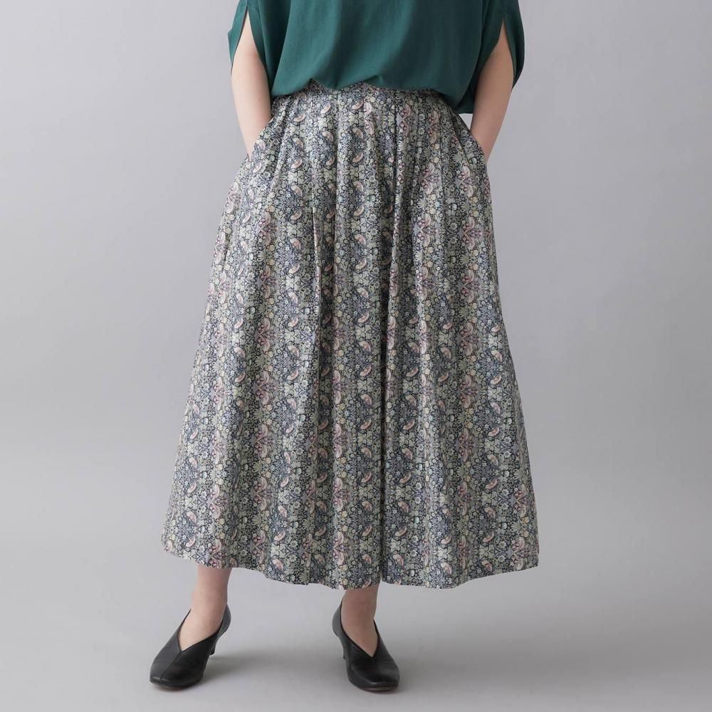 リバティプリントを大胆にあしらった、華やかさのあるロングタックスカート。
