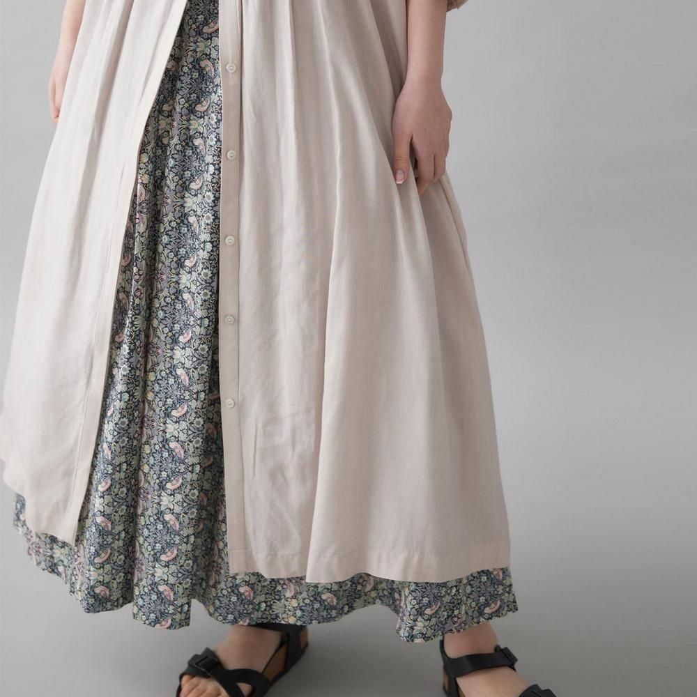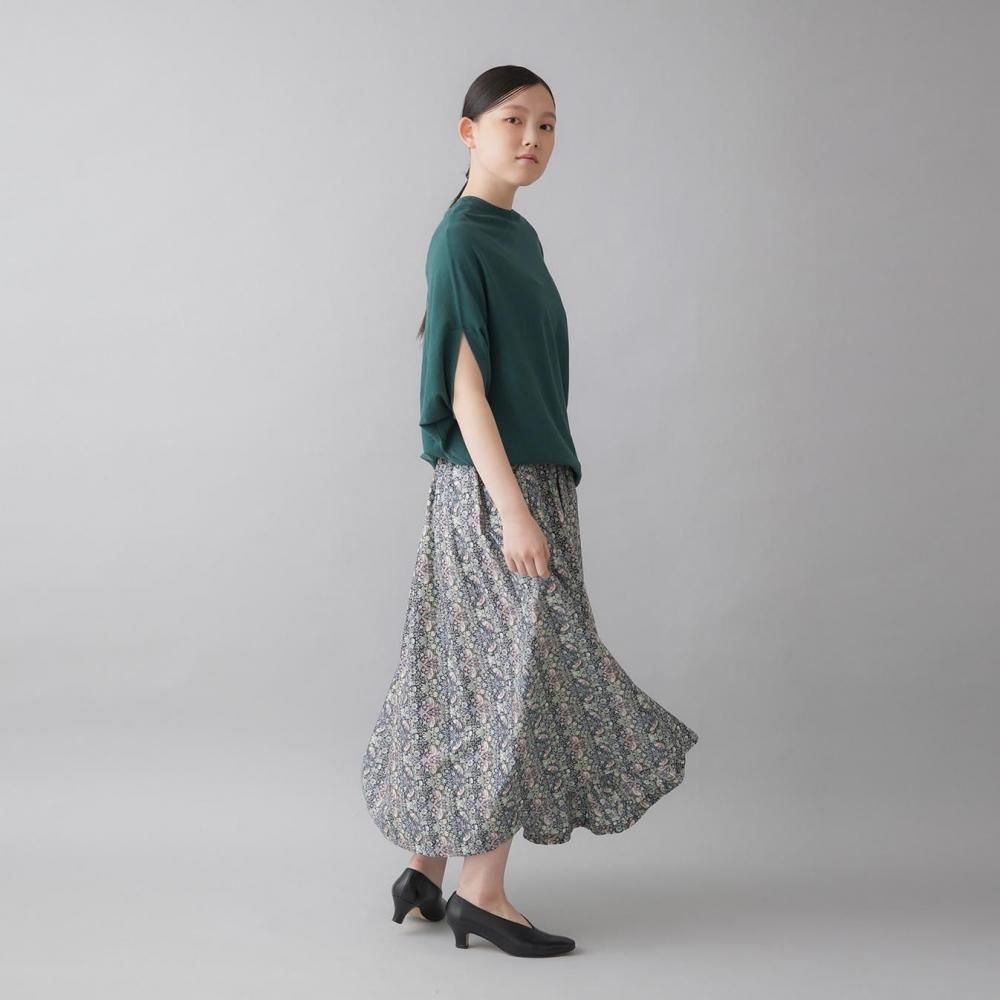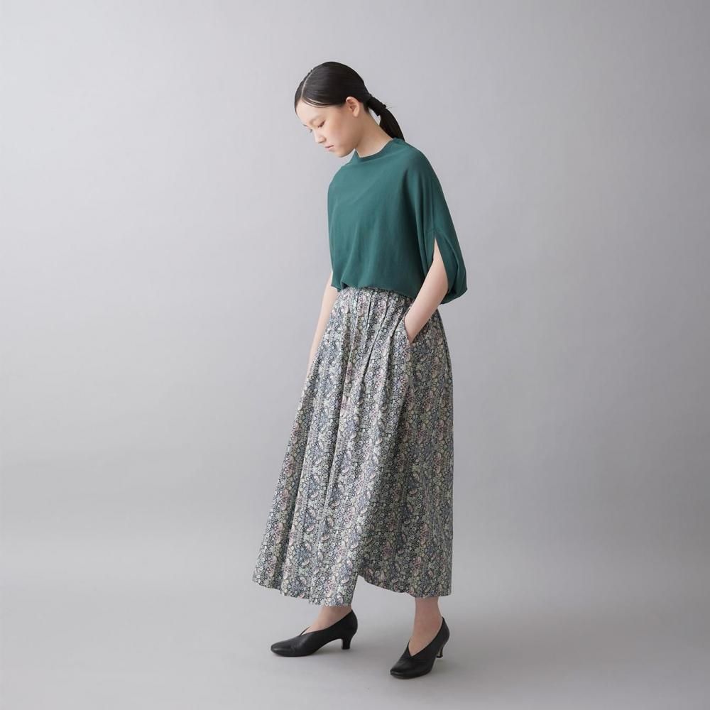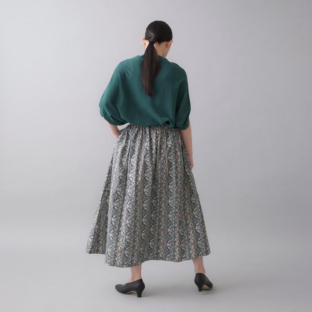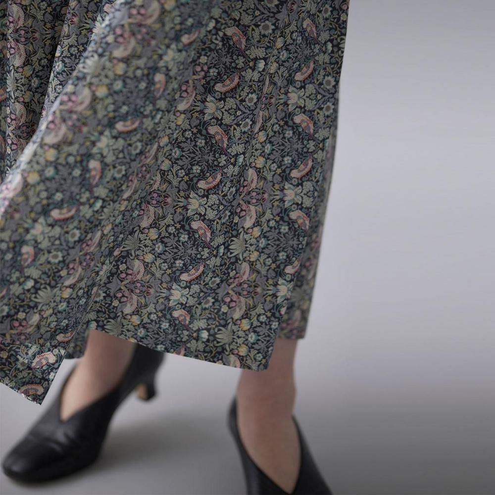 リバティプリントを大胆にあしらった、華やかさのあるロングタックスカート。