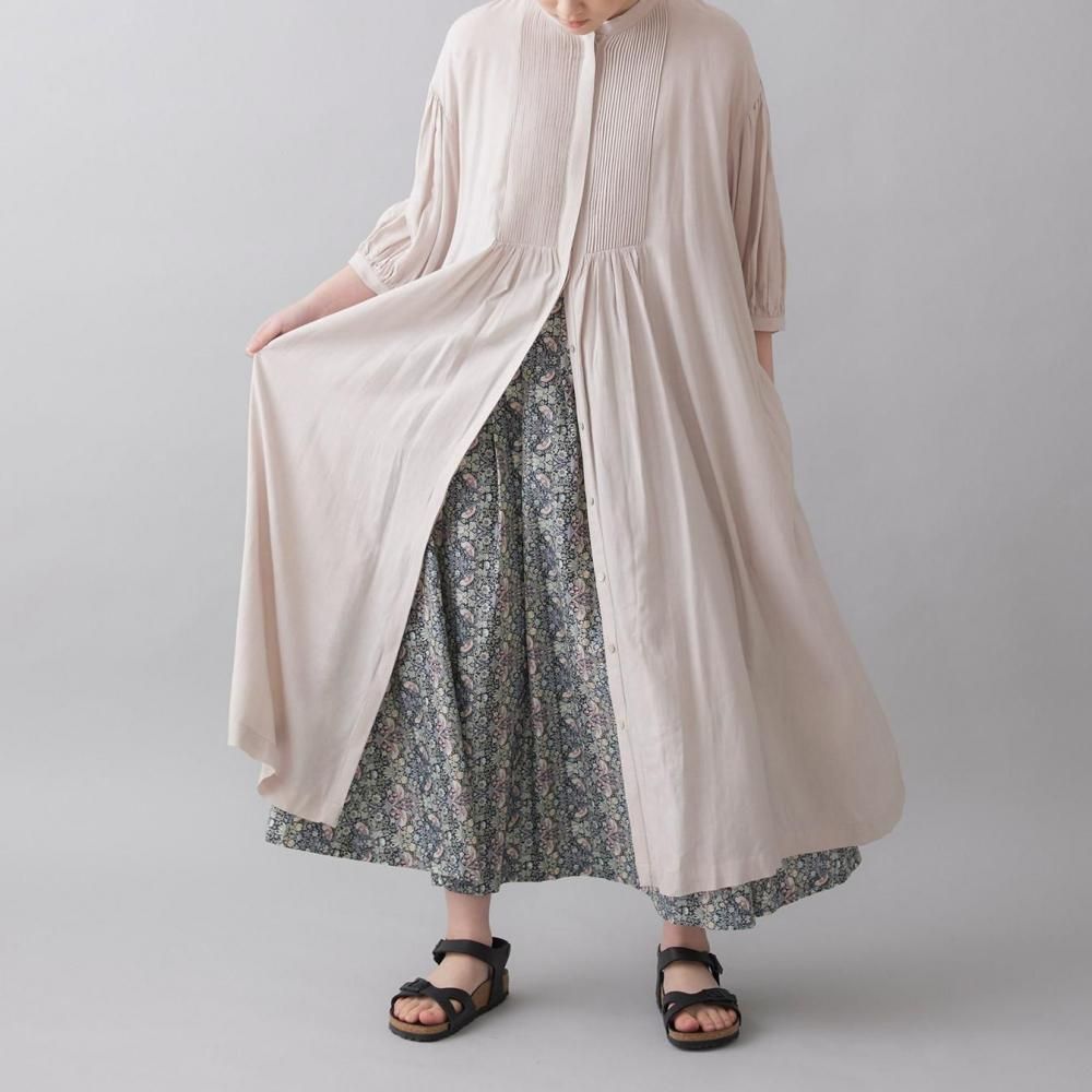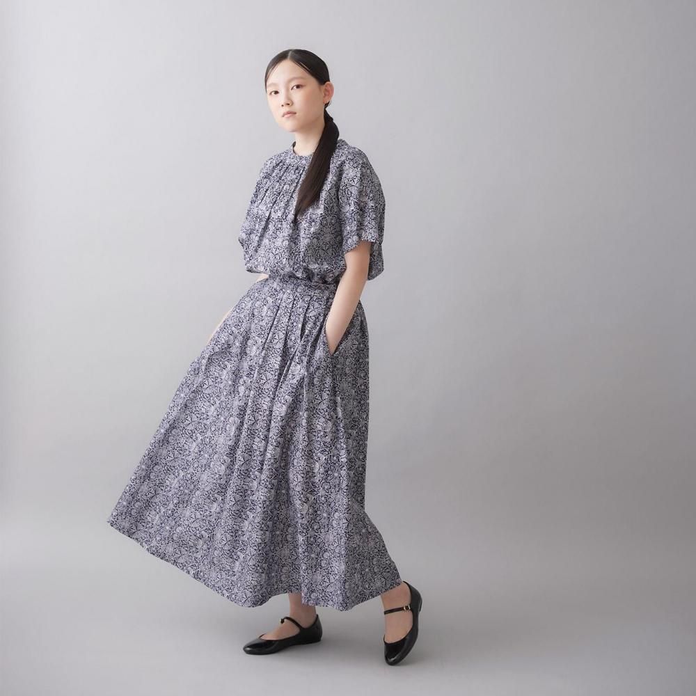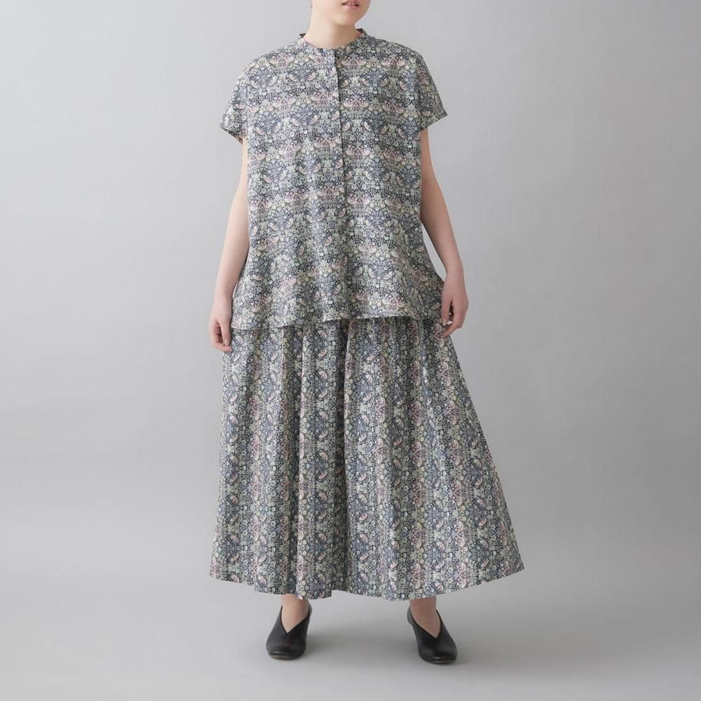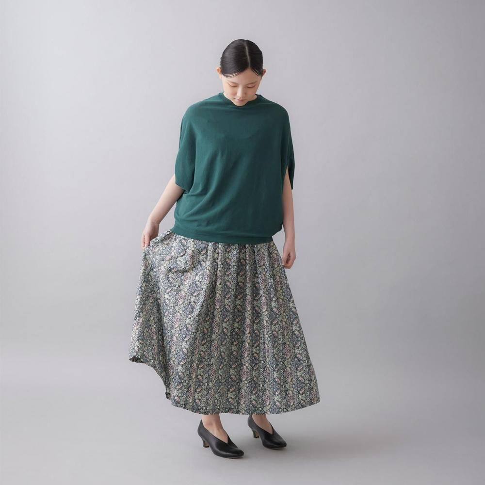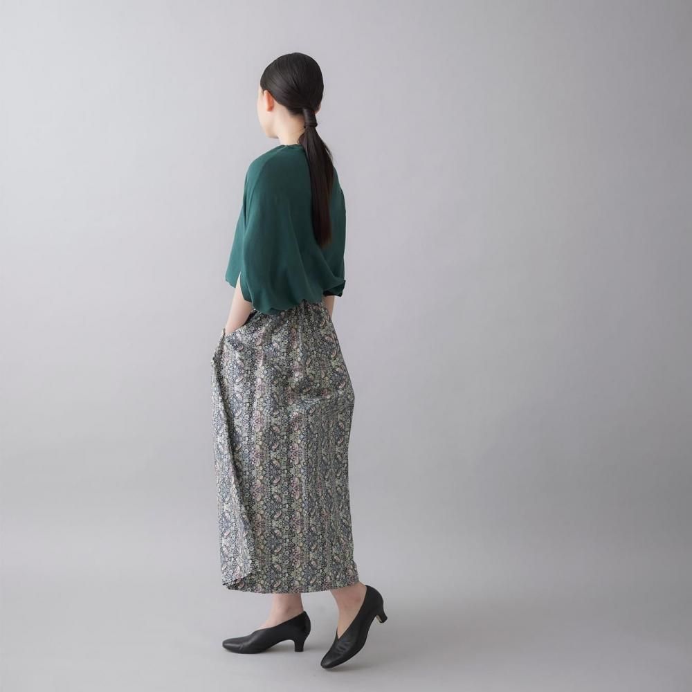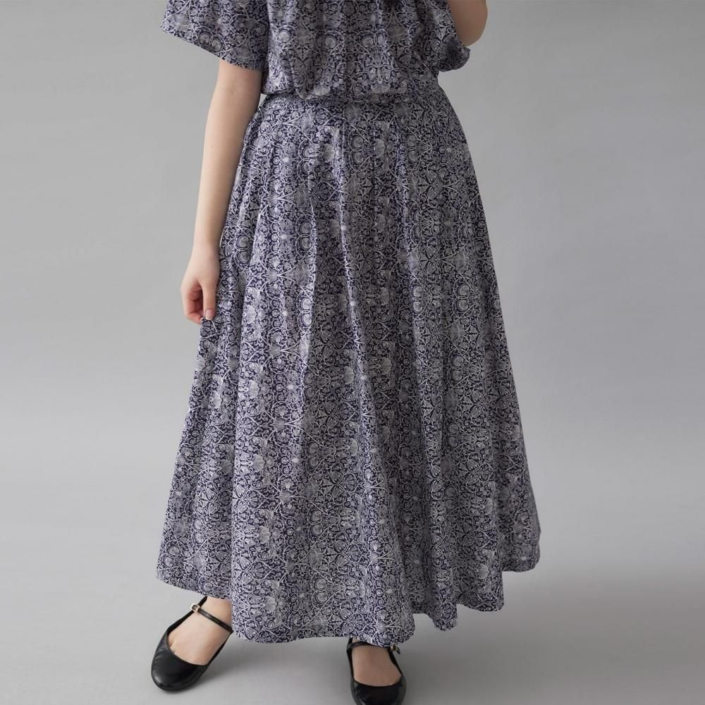 リバティプリントを大胆にあしらった、華やかさのあるロングタックスカート。