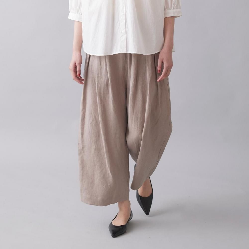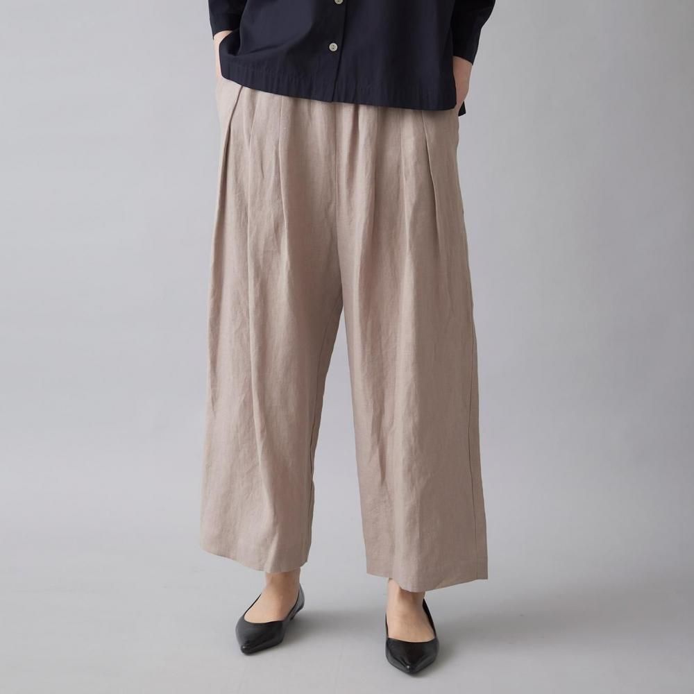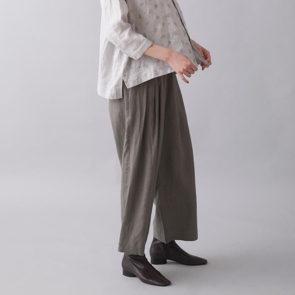 リネンならではのナチュラルな風合いと秋色の深みが、大人の着こなしを引き立てます。