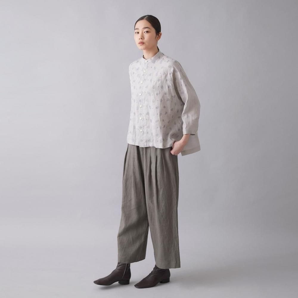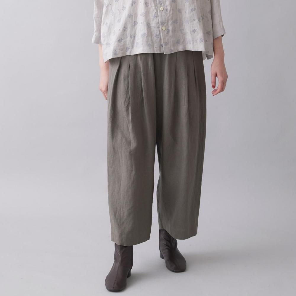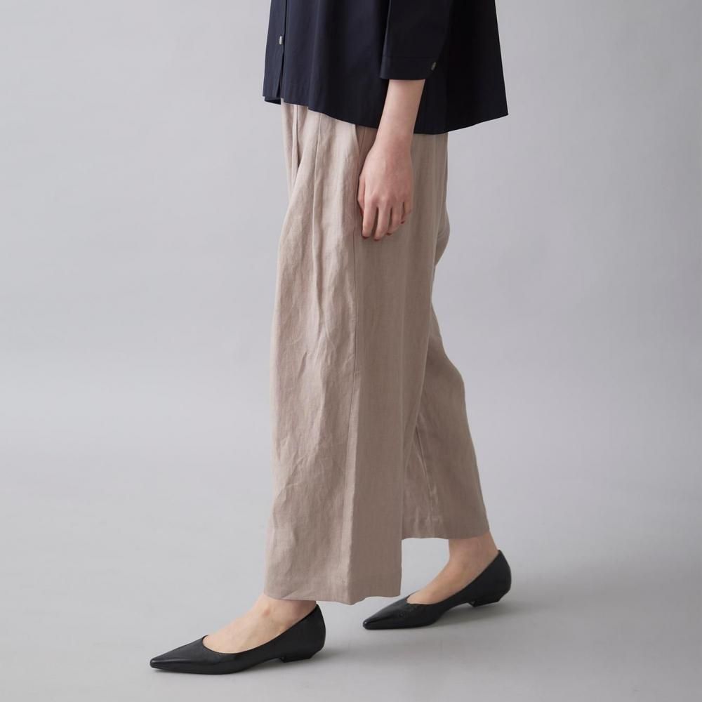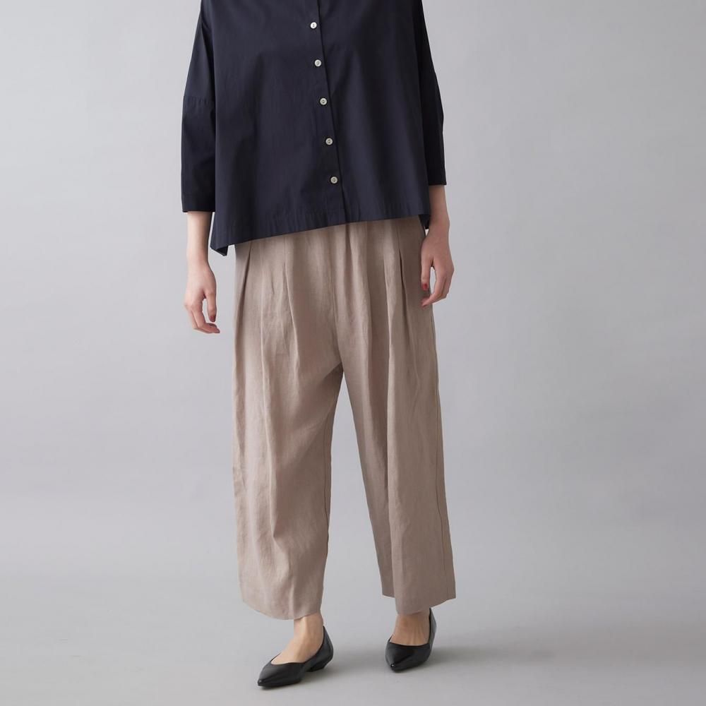 リネンならではのナチュラルな風合いと秋色の深みが、大人の着こなしを引き立てます。