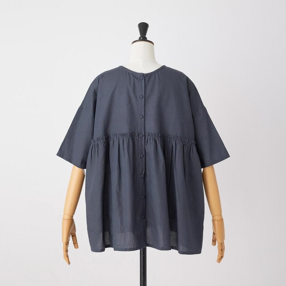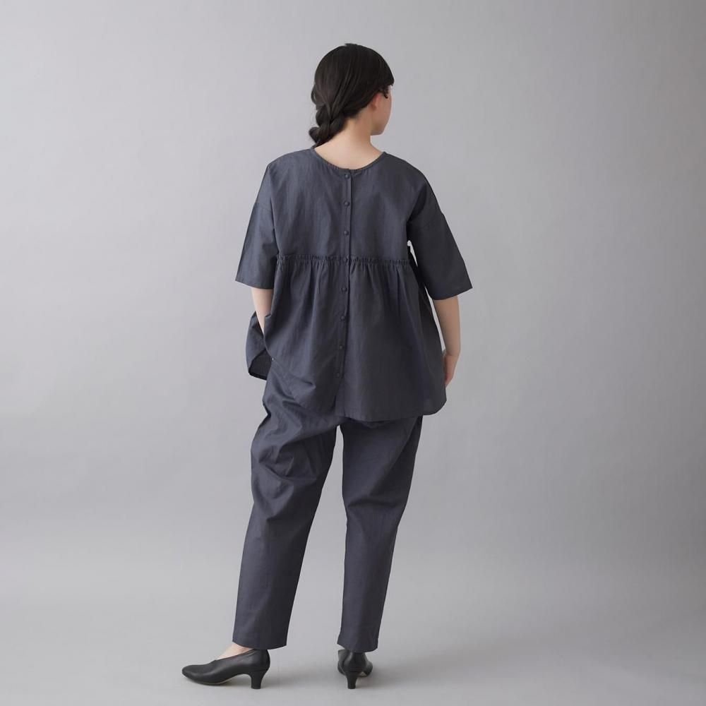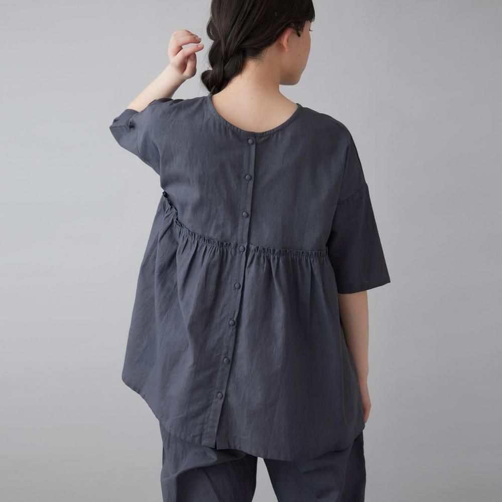 前後どちらを前にしても着られる2way仕様で、ボタンを前にすれば軽やかな羽織りとしても、後ろにすればすっきりとしたプルオーバーとして着用可能。