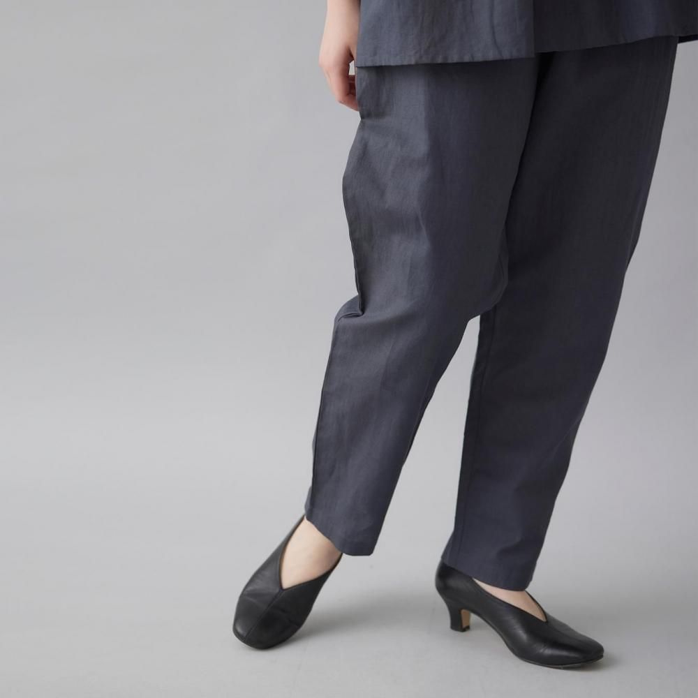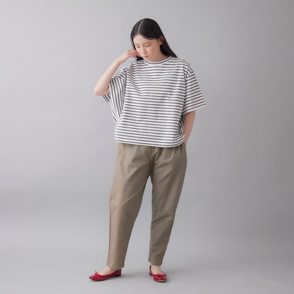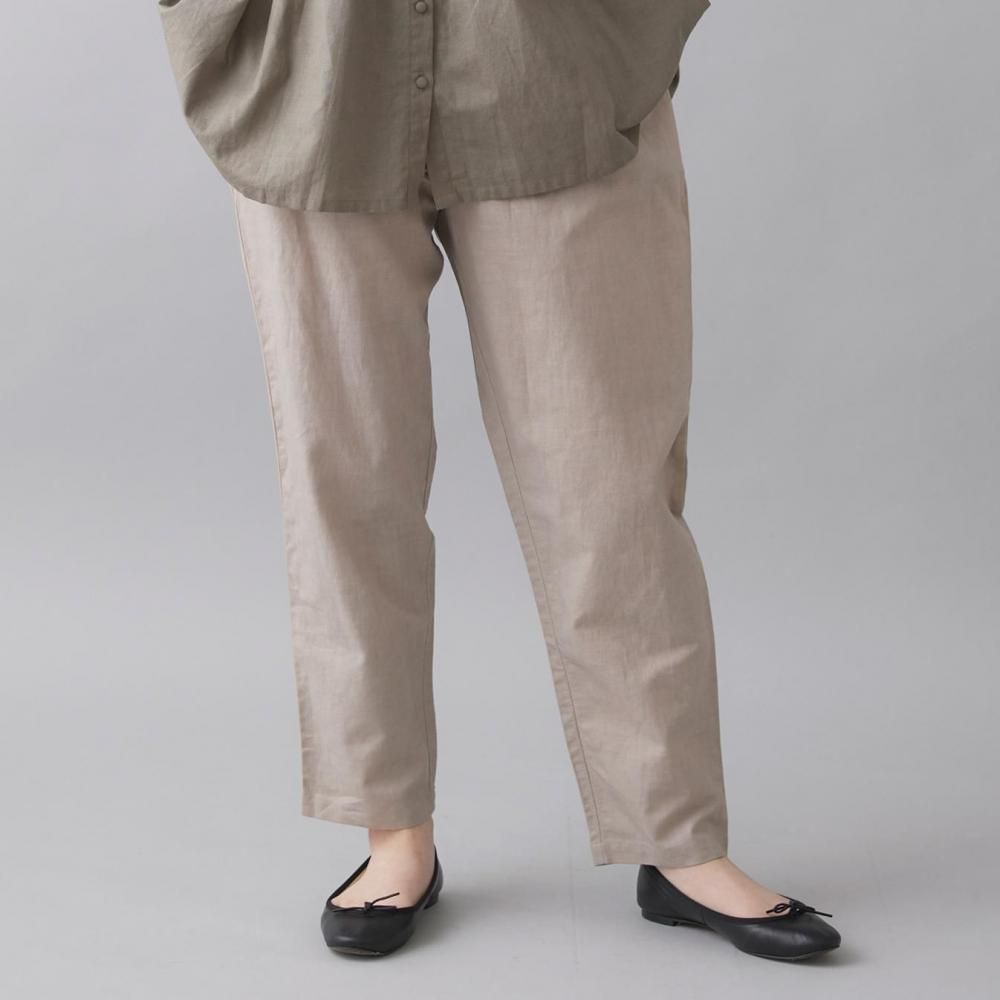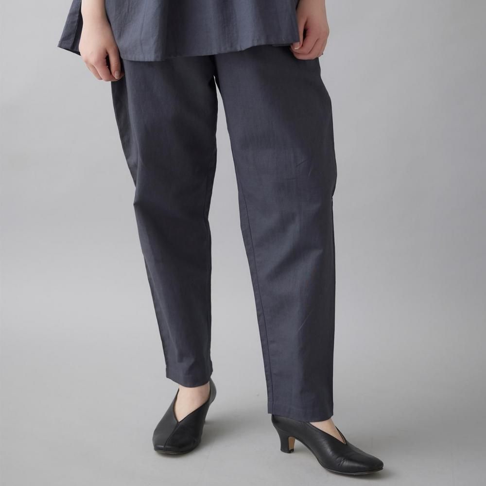 ウエストゴムで楽な履き心地ながらも、すっきりとしたシルエットで上品に見えるパンツです。