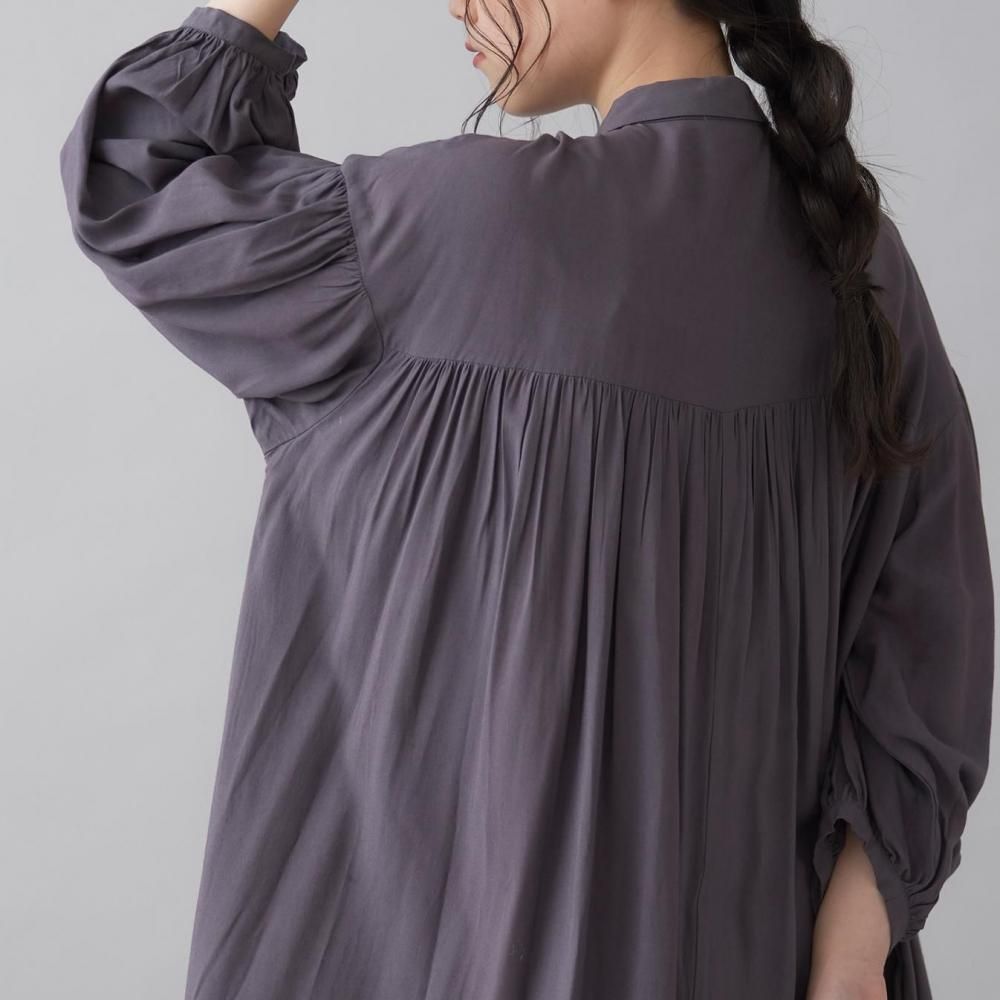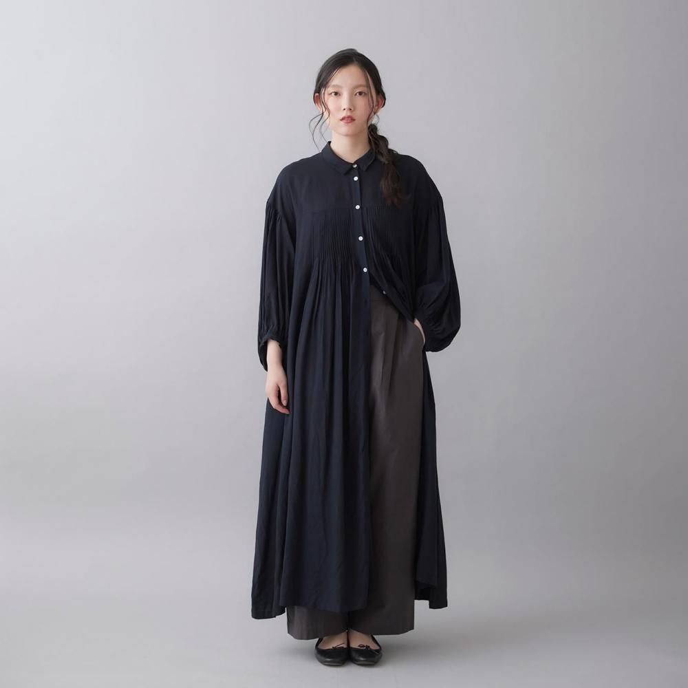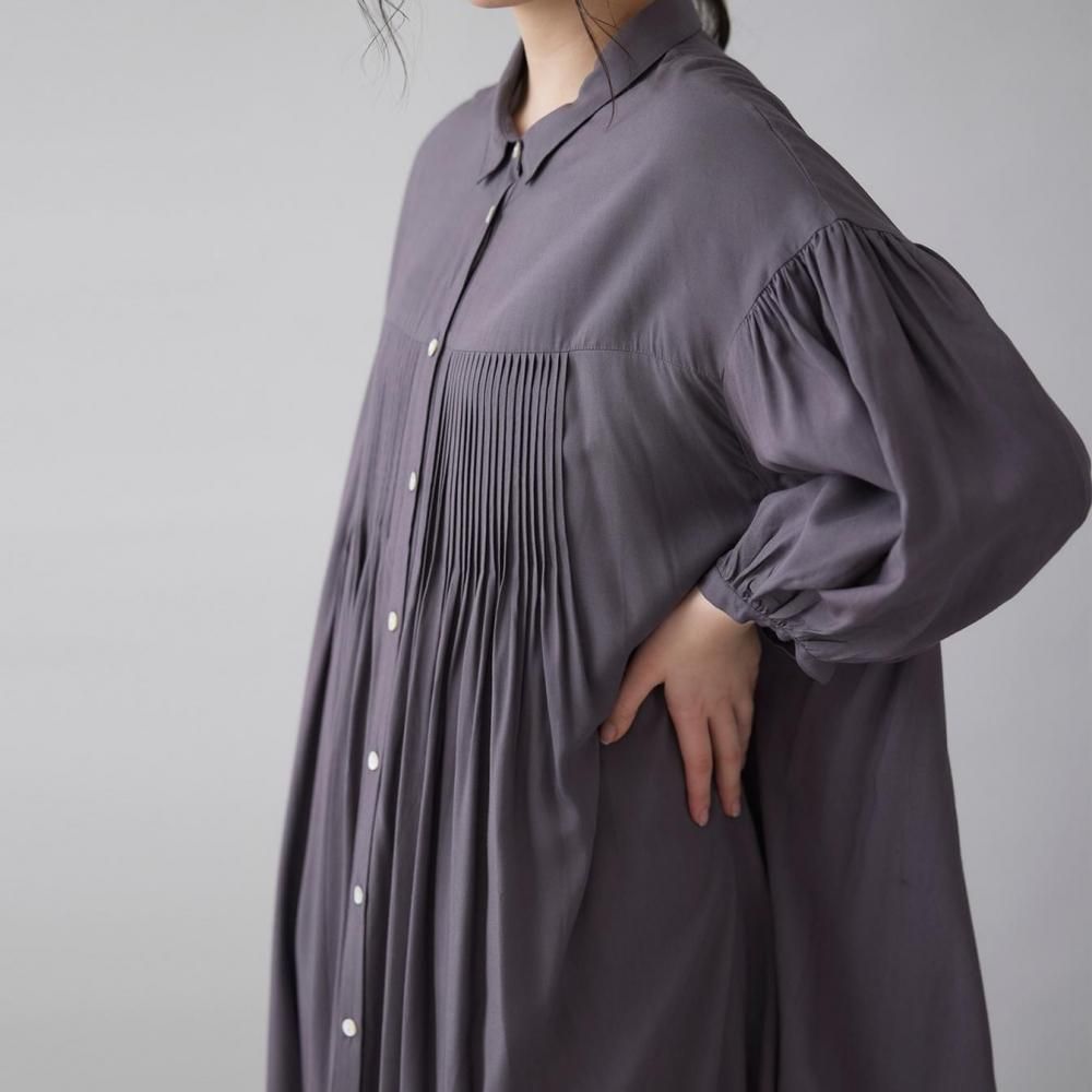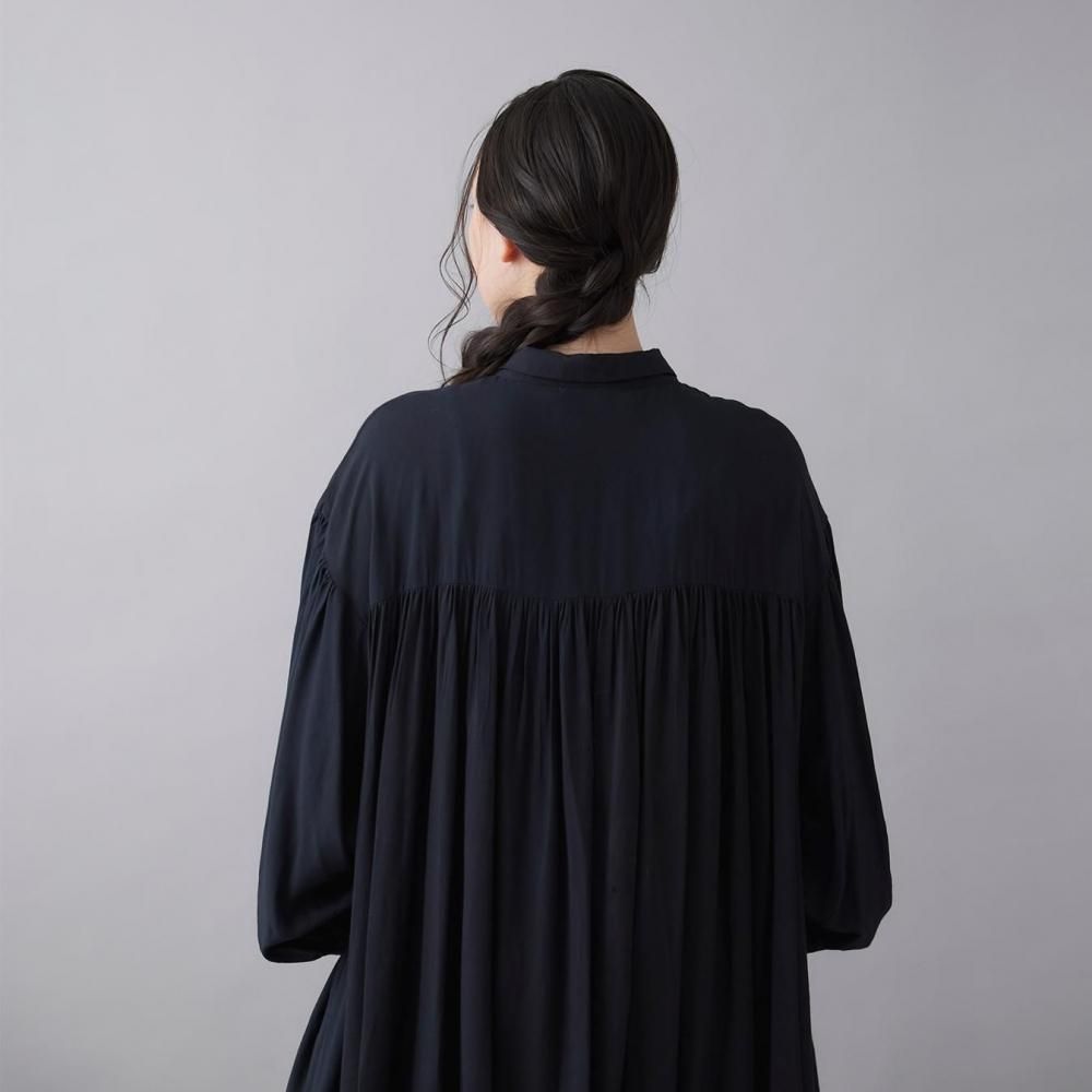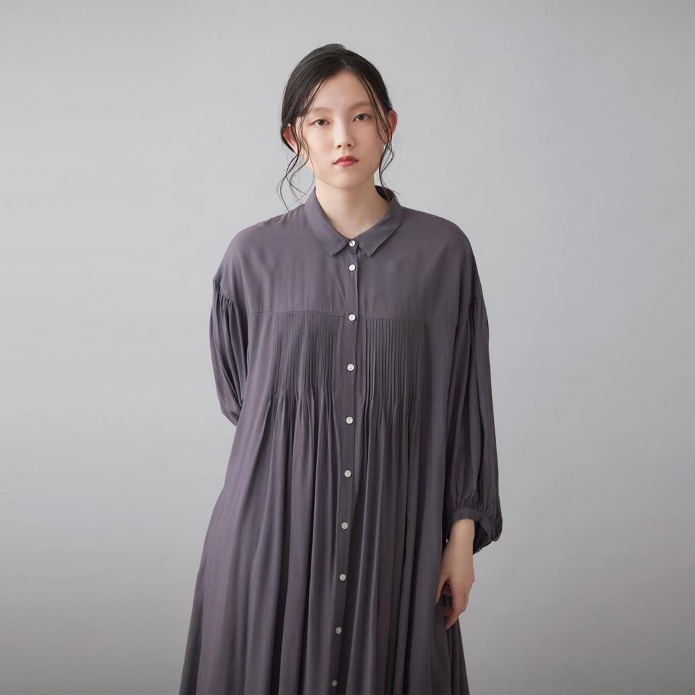 胸元のピンタックは凛とした表情を添え、背中のギャザーは動きに合わせてやわらかく揺れ、シンプルながらも奥行きのあるシルエットに仕上げています。