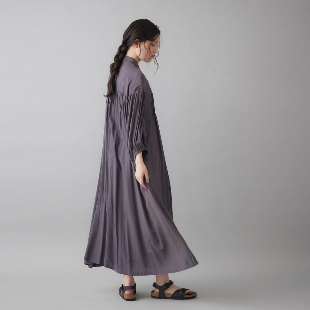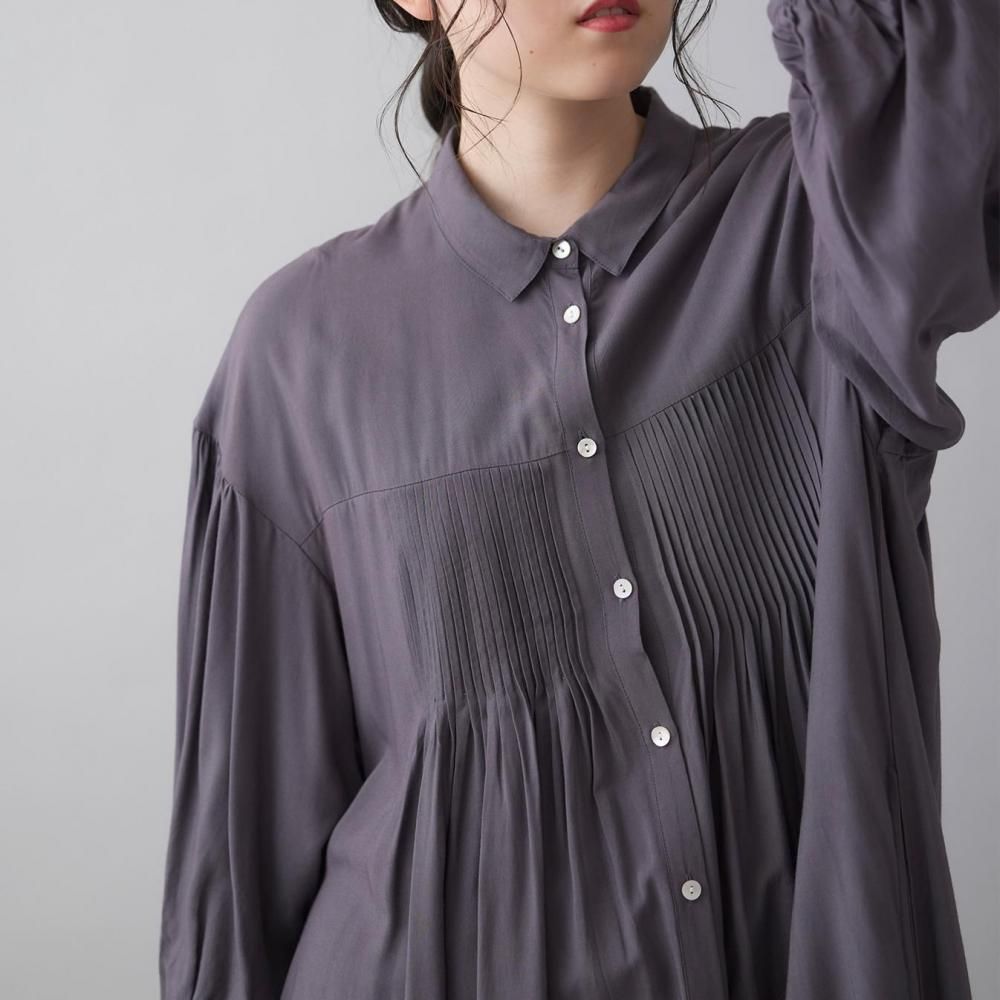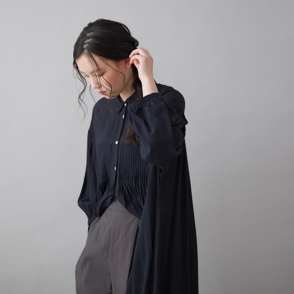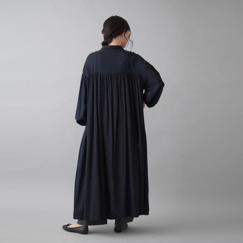 胸元のピンタックは凛とした表情を添え、背中のギャザーは動きに合わせてやわらかく揺れ、シンプルながらも奥行きのあるシルエットに仕上げています。