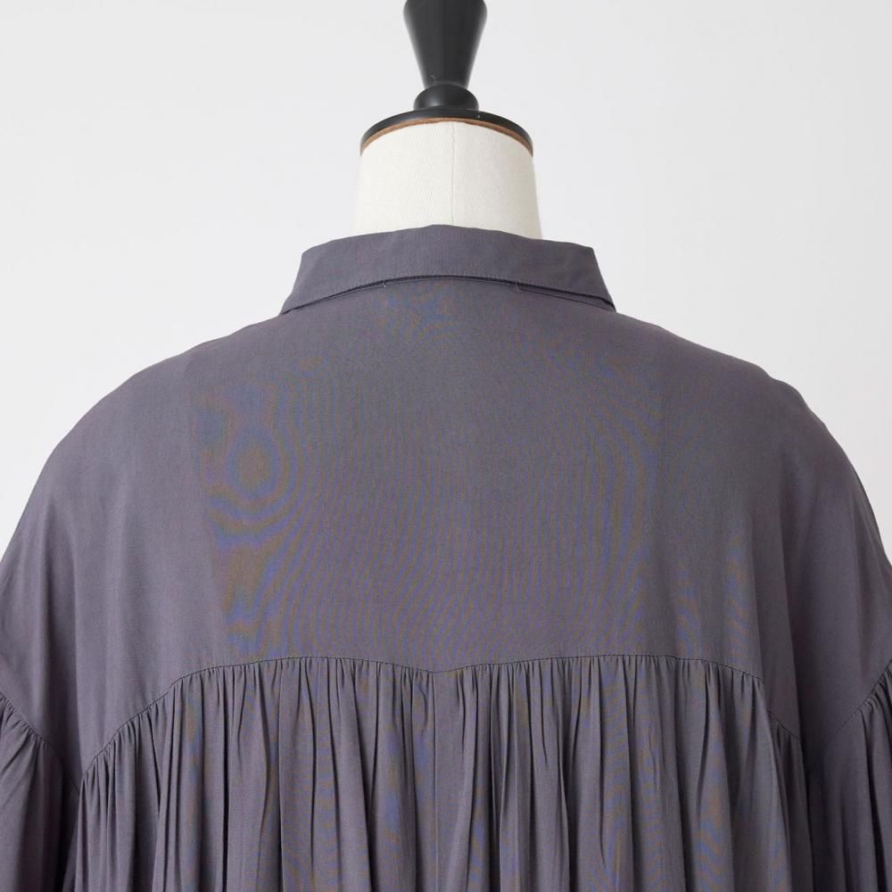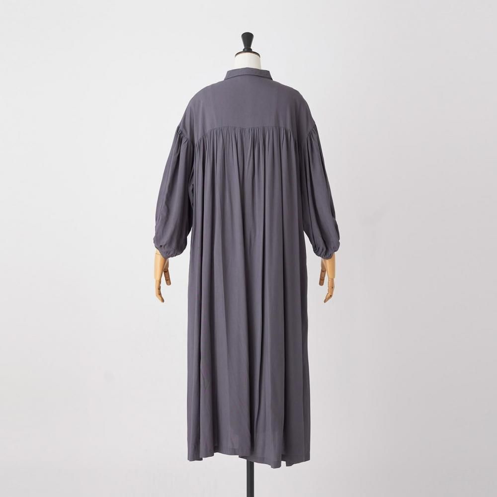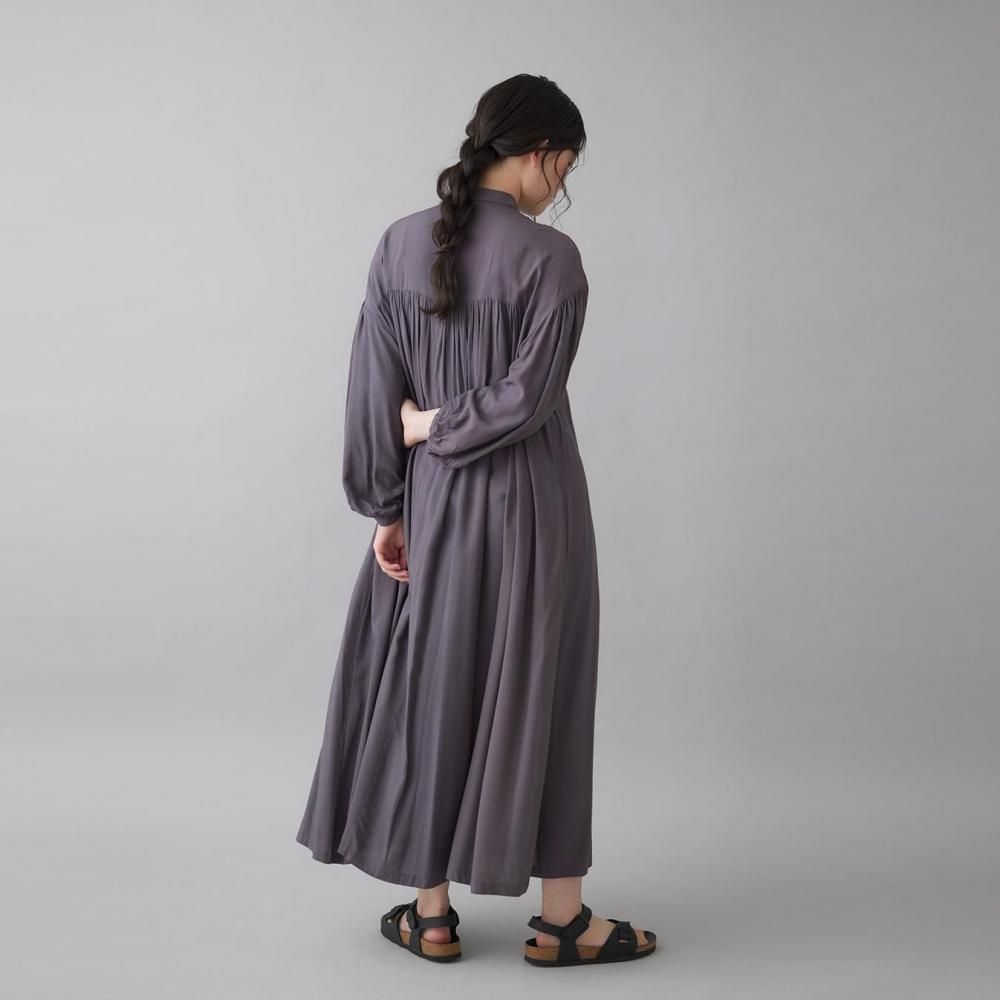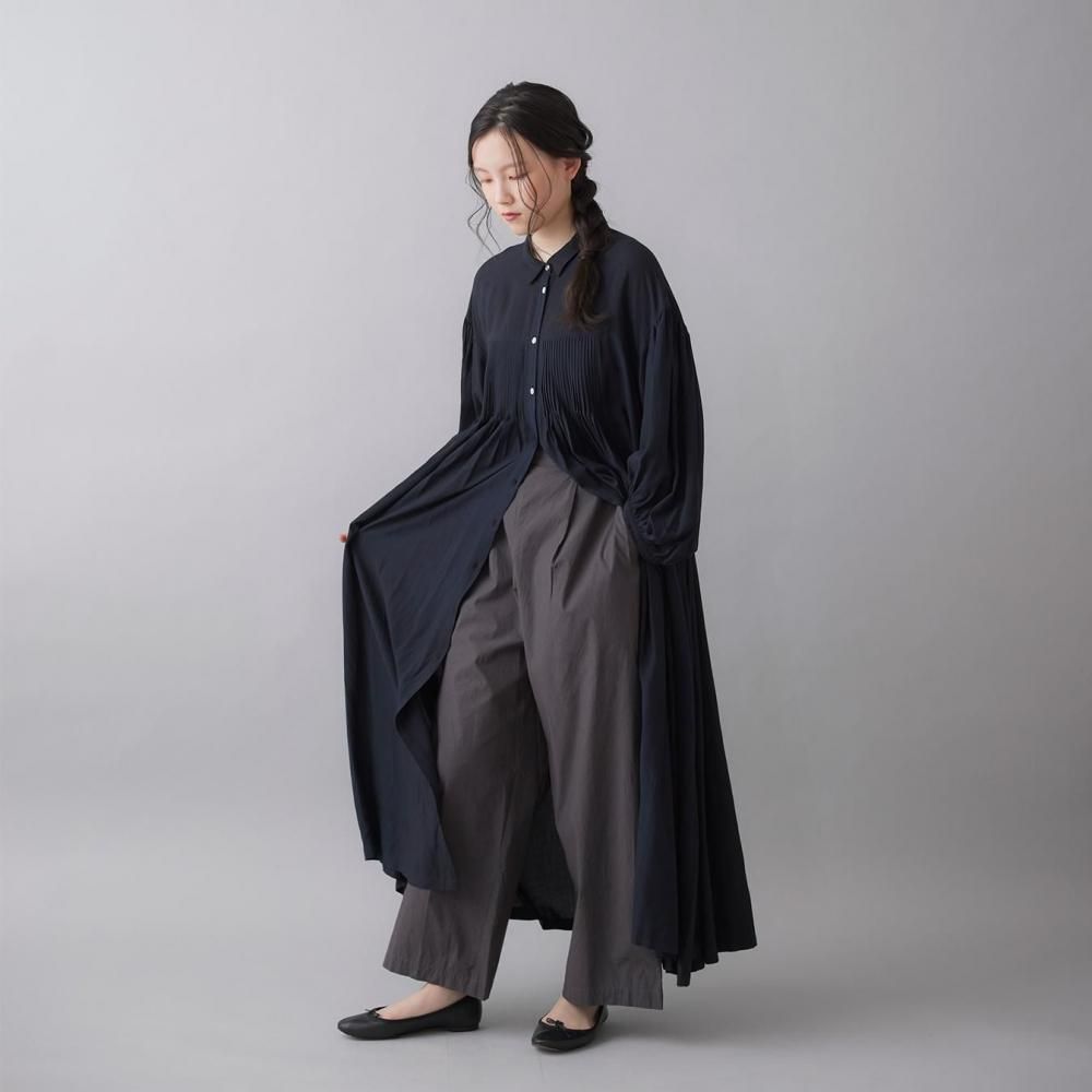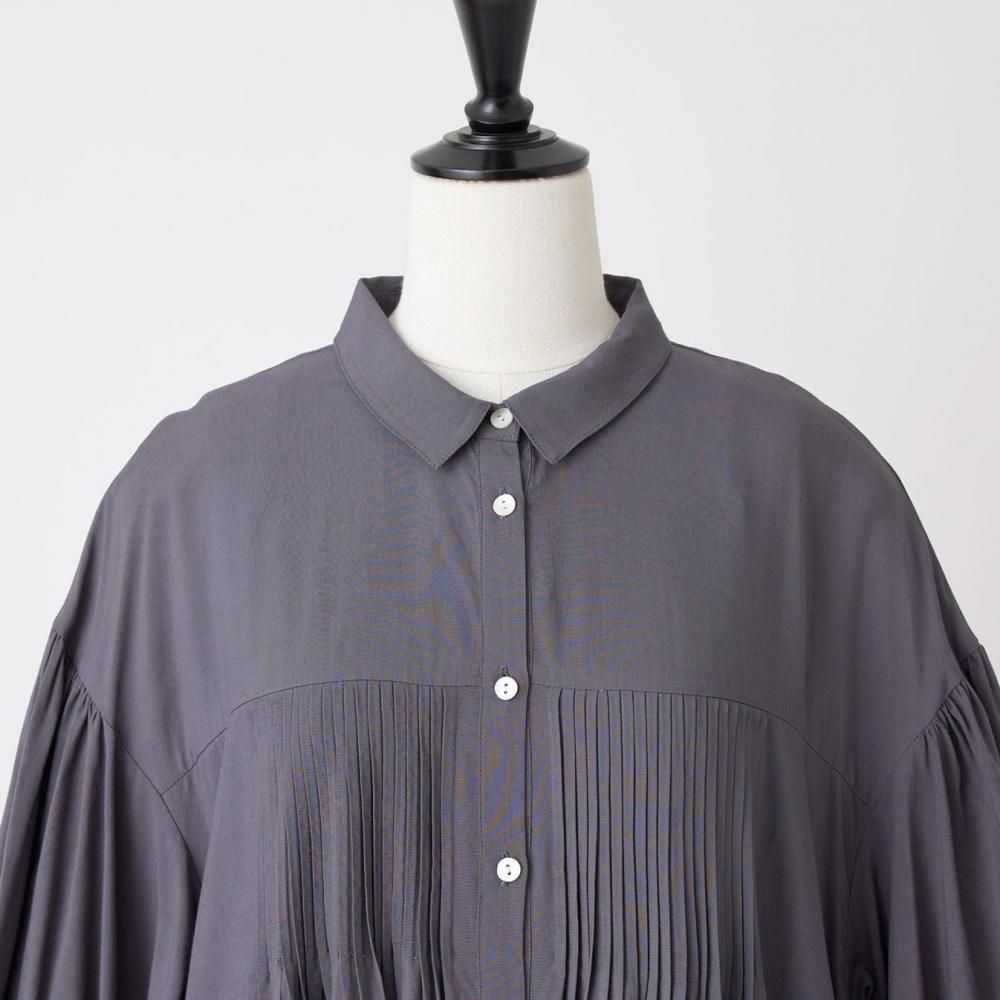 胸元のピンタックは凛とした表情を添え、背中のギャザーは動きに合わせてやわらかく揺れ、シンプルながらも奥行きのあるシルエットに仕上げています。