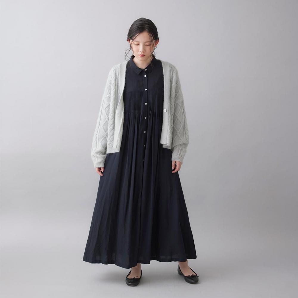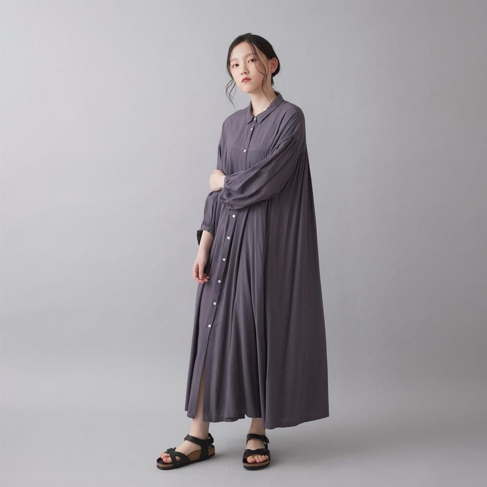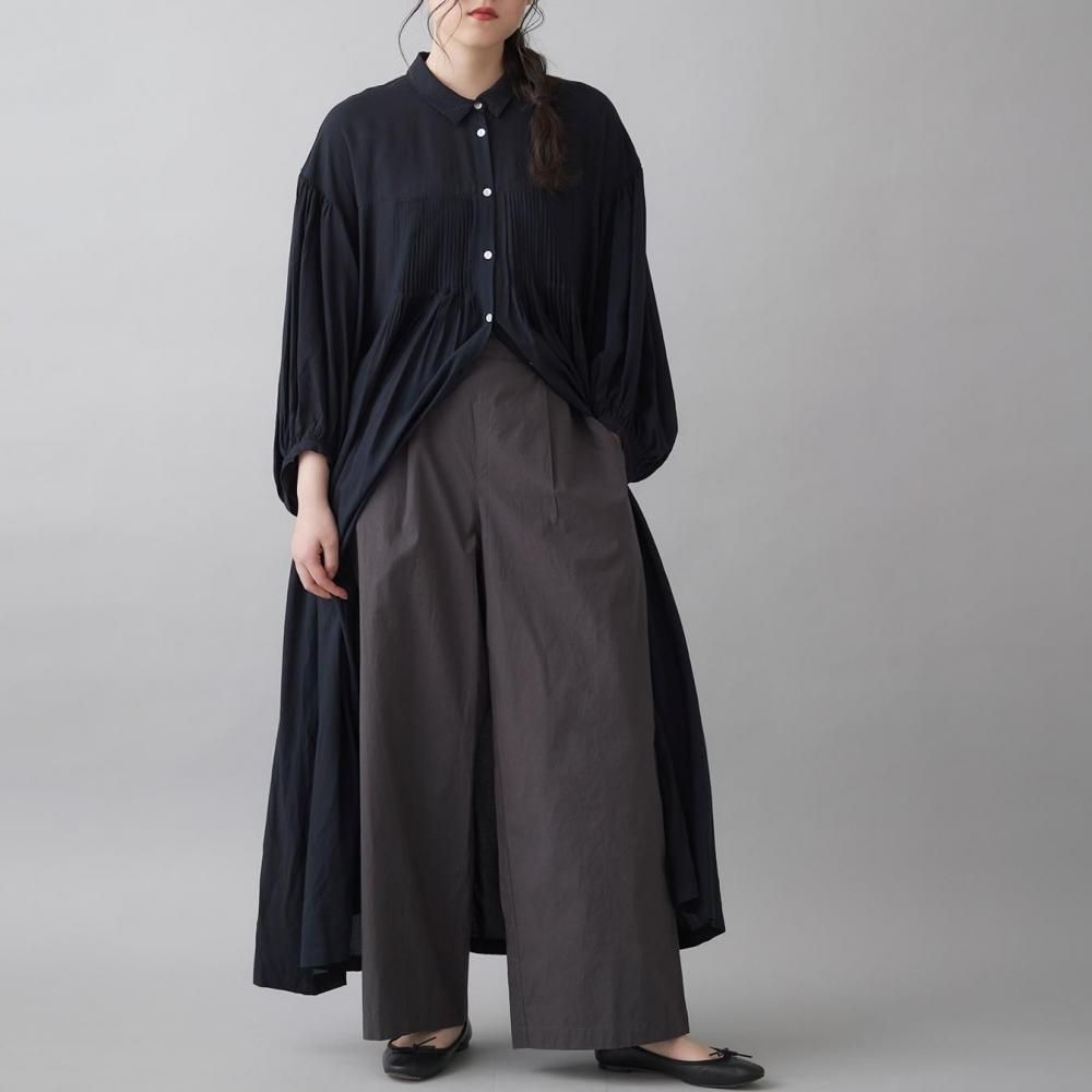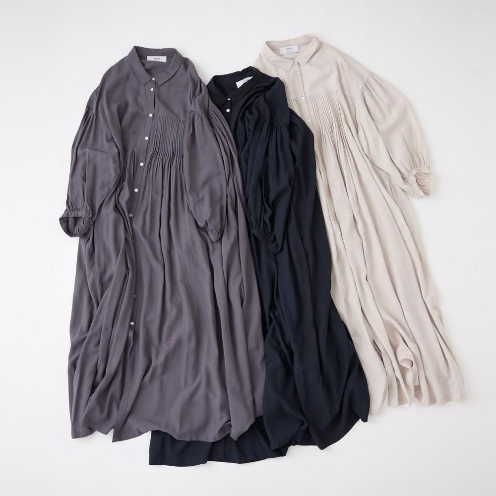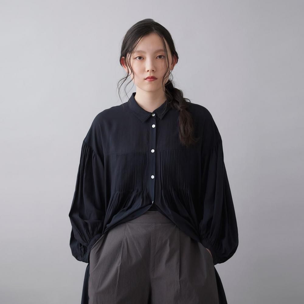 胸元のピンタックは凛とした表情を添え、背中のギャザーは動きに合わせてやわらかく揺れ、シンプルながらも奥行きのあるシルエットに仕上げています。
