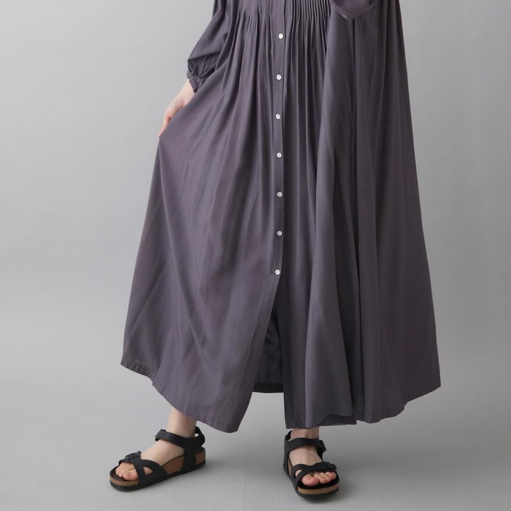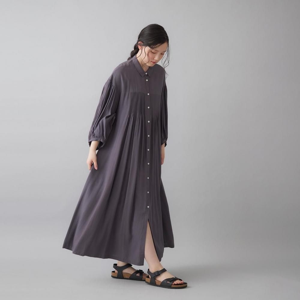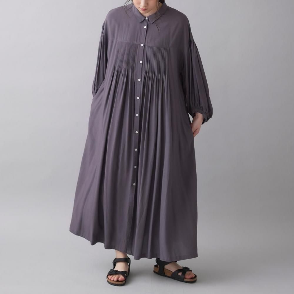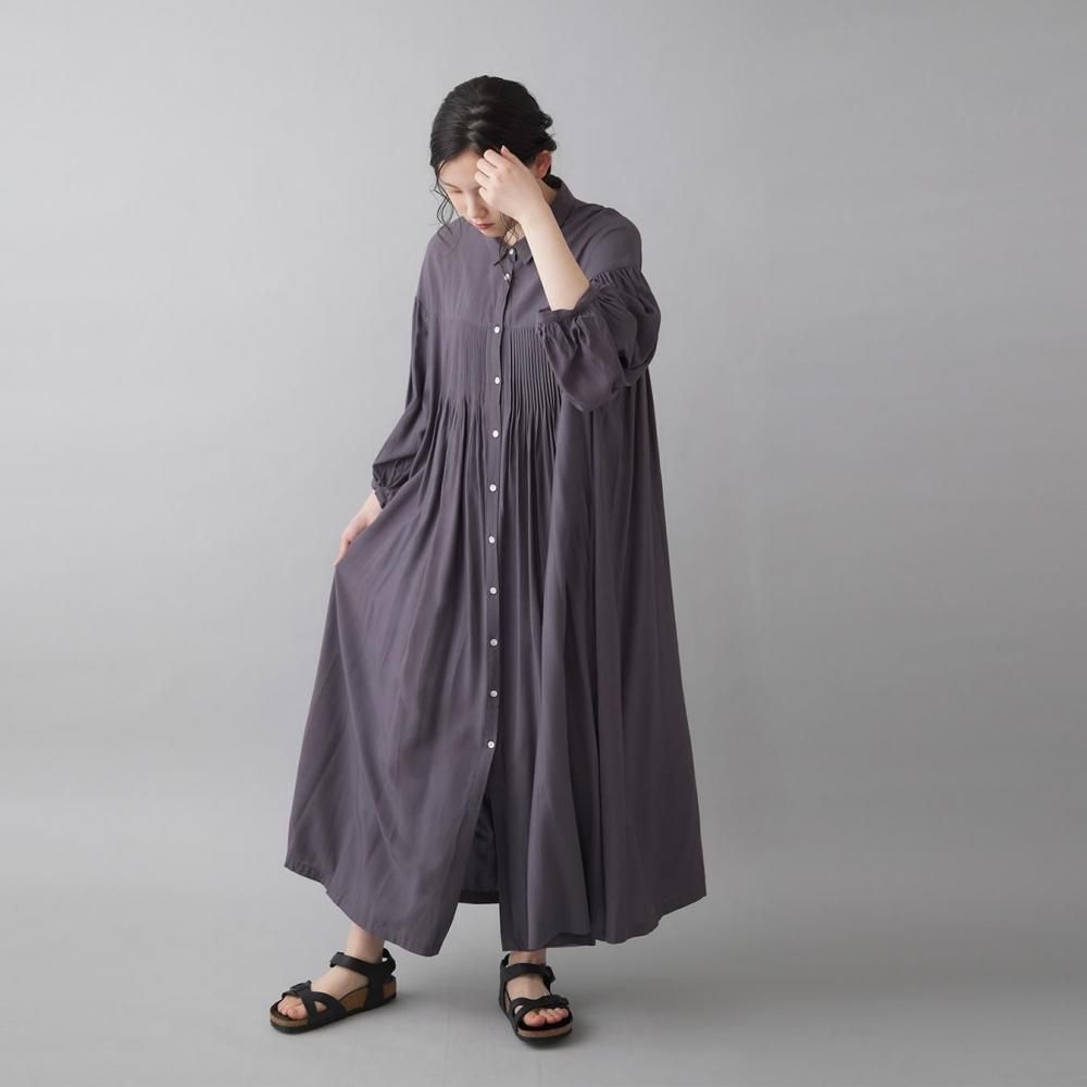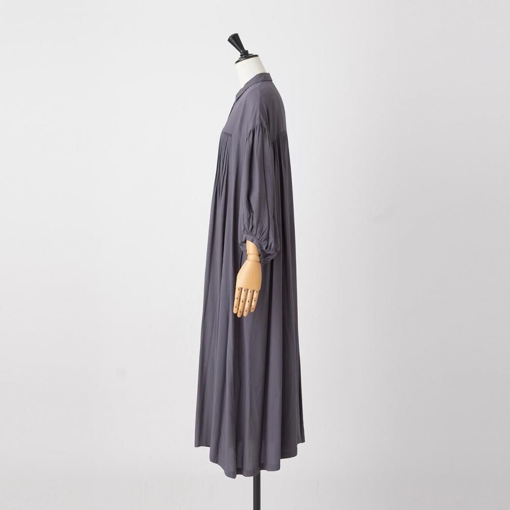 胸元からの繊細なピンタックと、背中にたっぷり寄せたギャザーが印象的な、襟付きのインド製モダールワンピース。