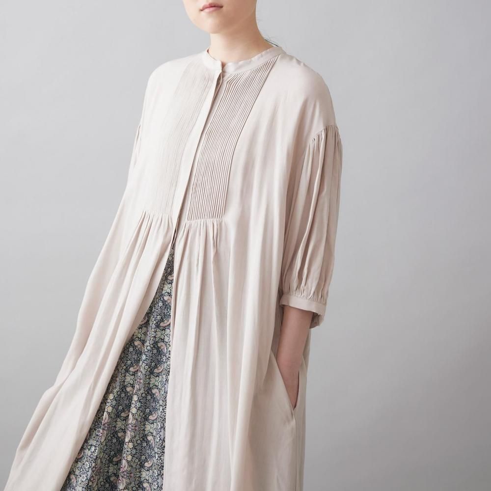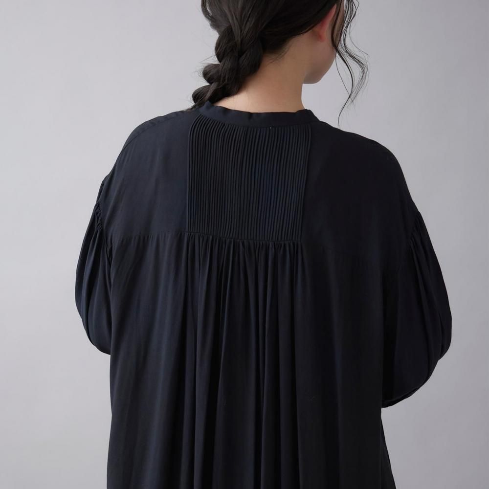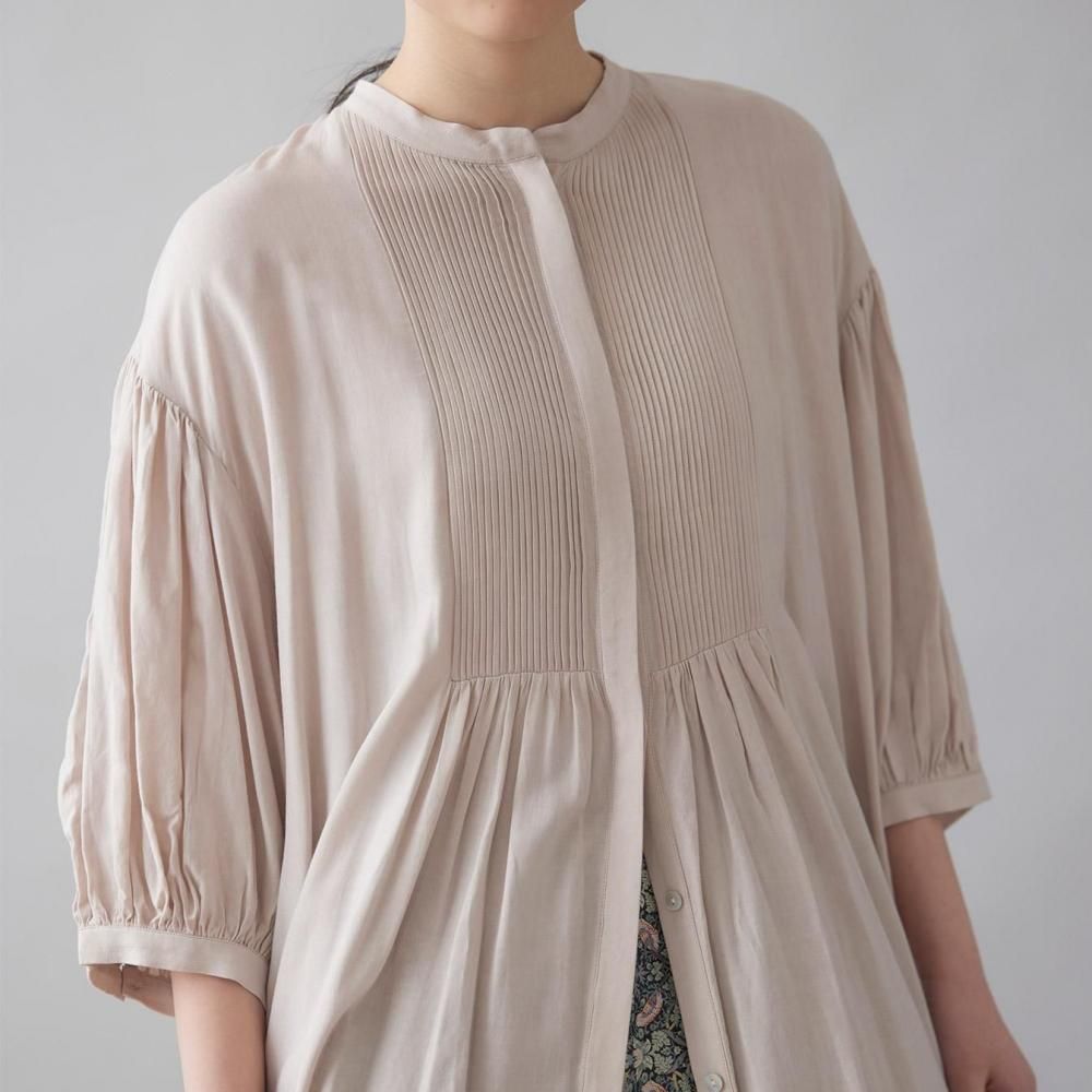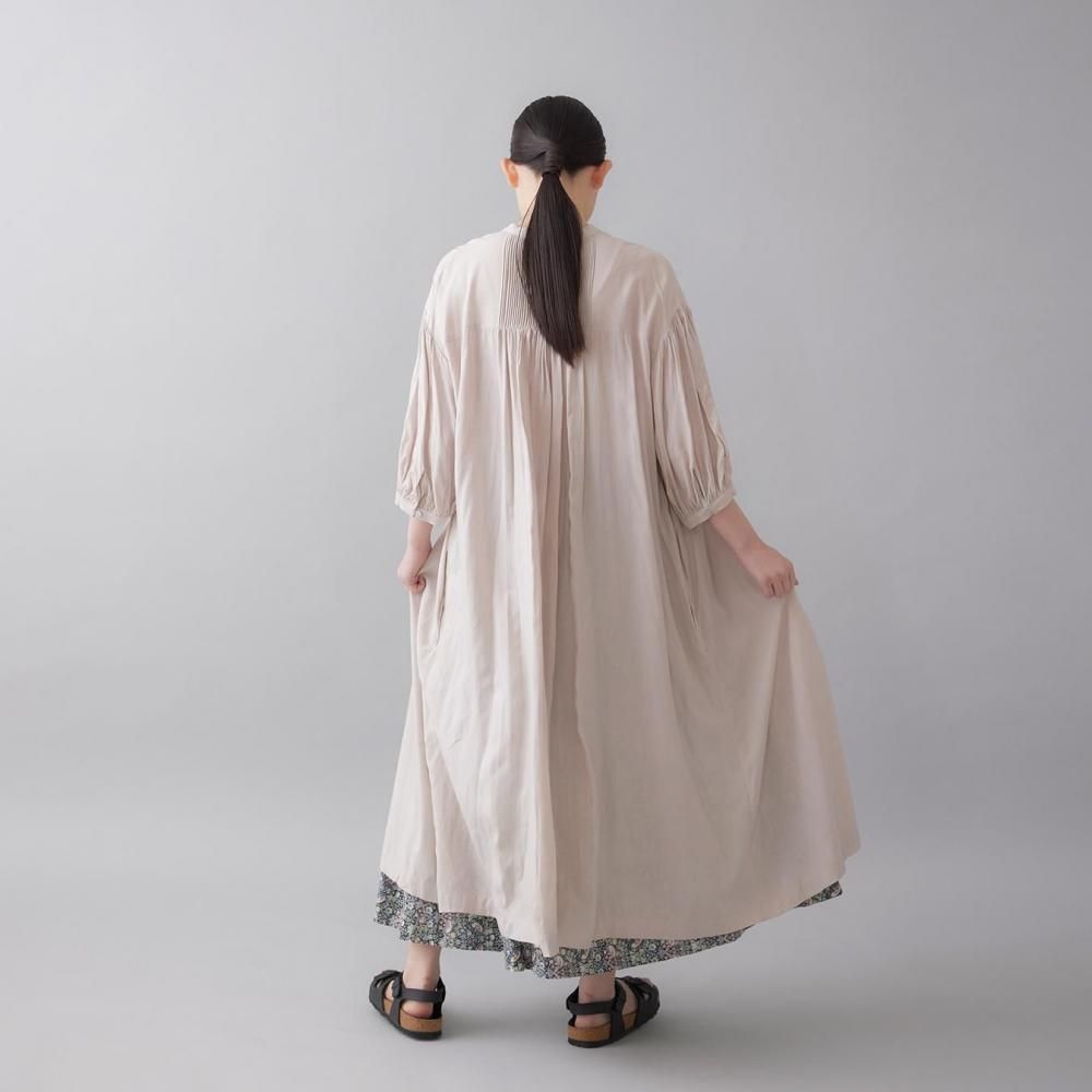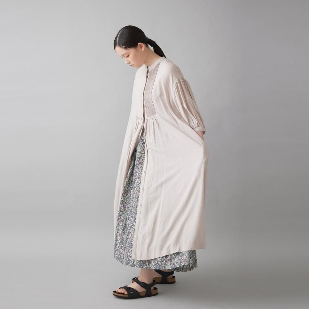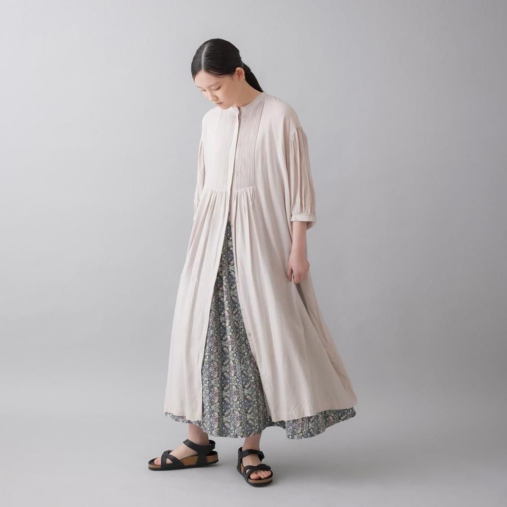 前後に施されたインドの職人による手仕事のピンタックがクラシカルな表情を添え、ピンタック下から生まれるたっぷりと入ったギャザーが動きに合わせて柔らかく揺れ、しっとりとした女性らしい雰囲気を演出します。