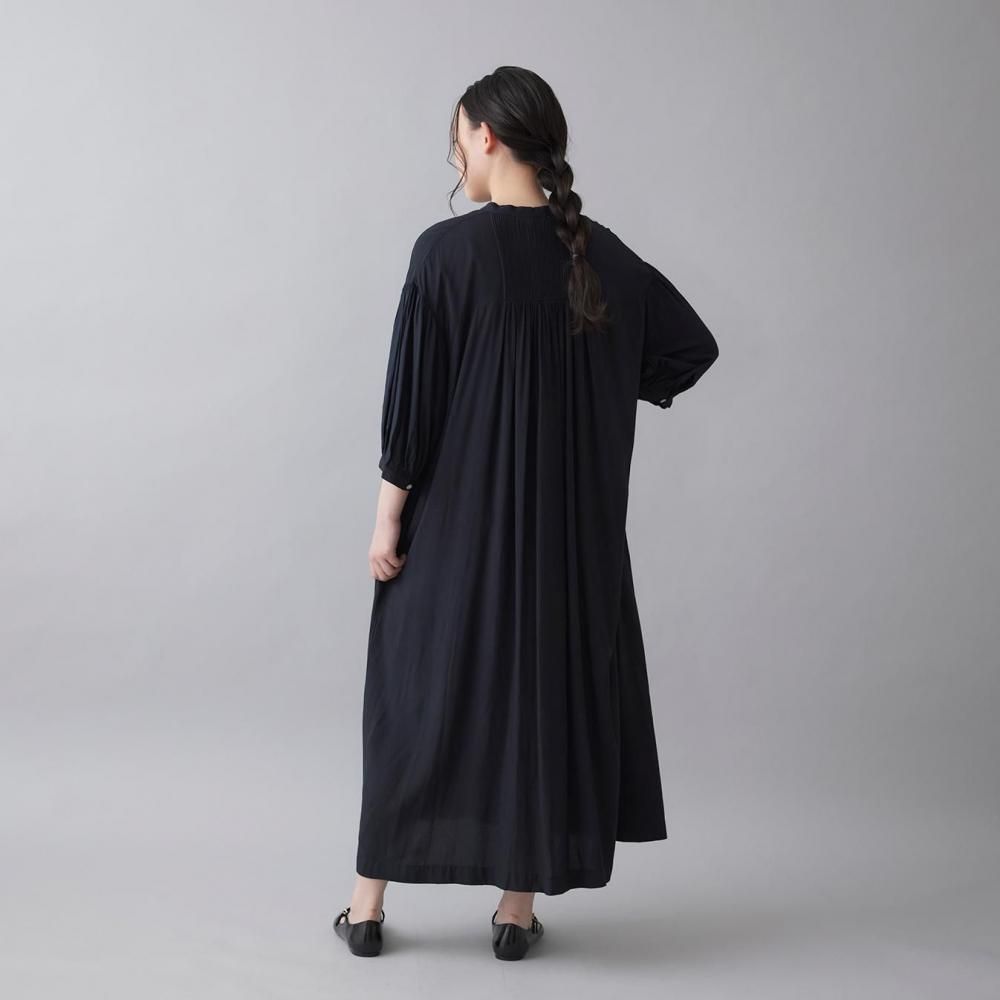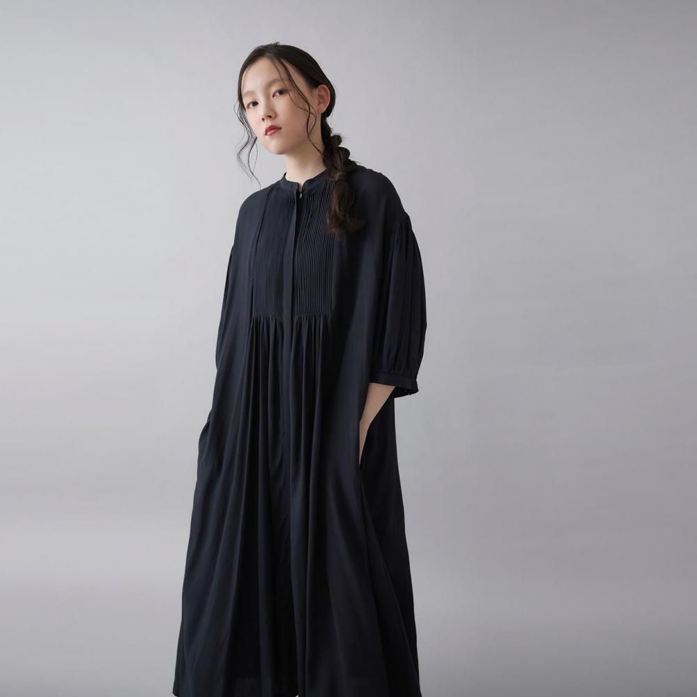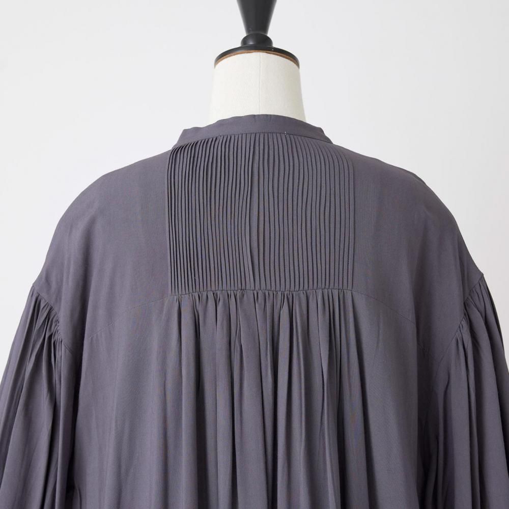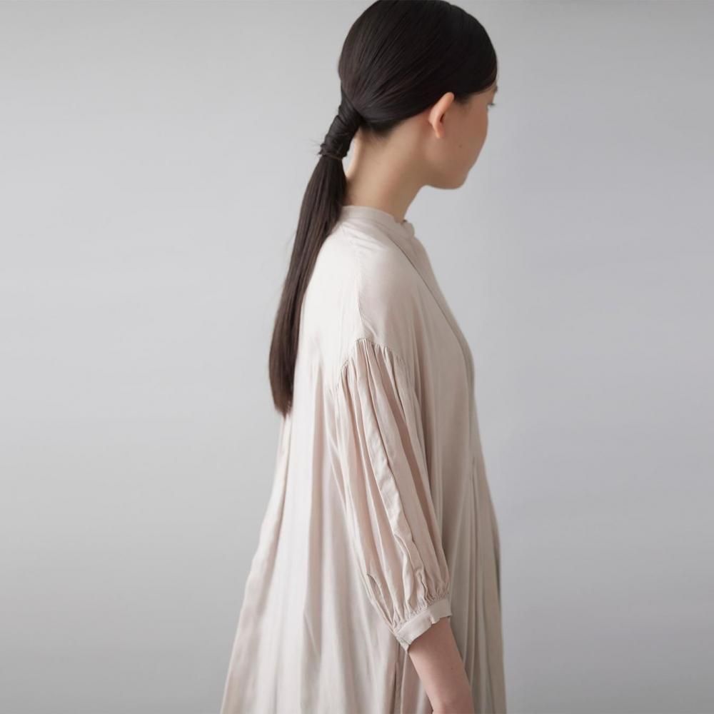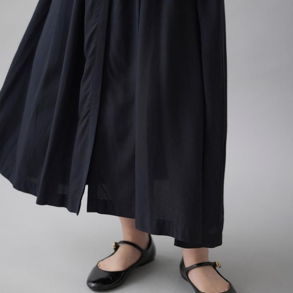 前後に施されたインドの職人による手仕事のピンタックがクラシカルな表情を添え、ピンタック下から生まれるたっぷりと入ったギャザーが動きに合わせて柔らかく揺れ、しっとりとした女性らしい雰囲気を演出します。