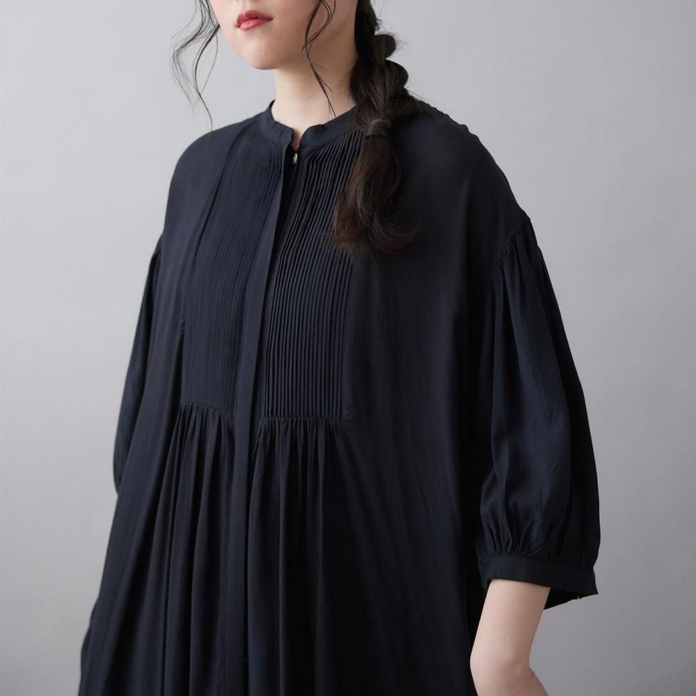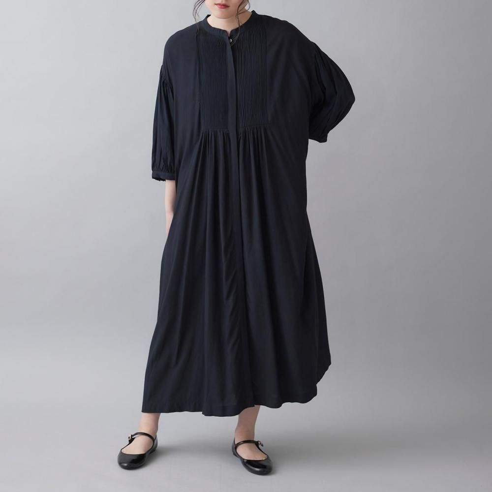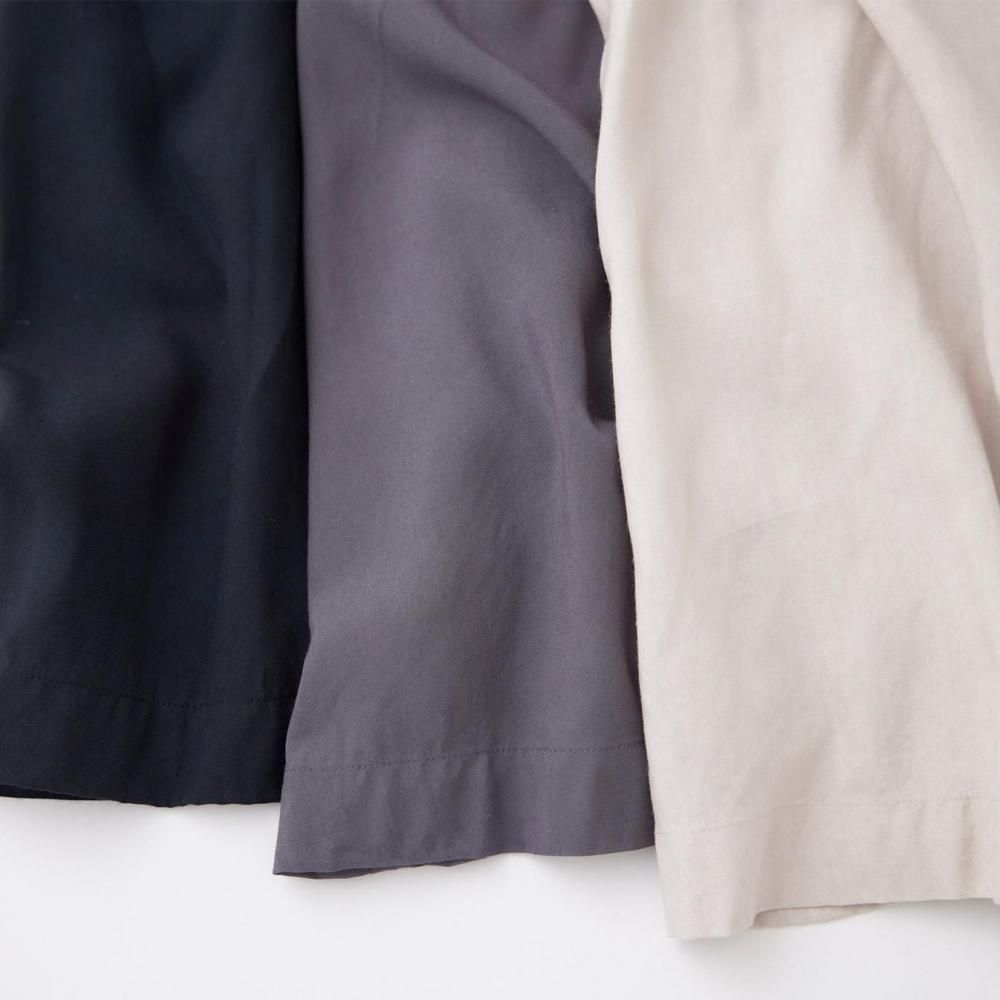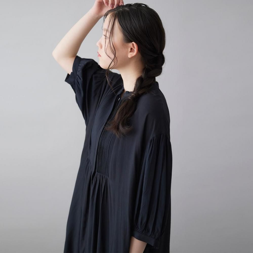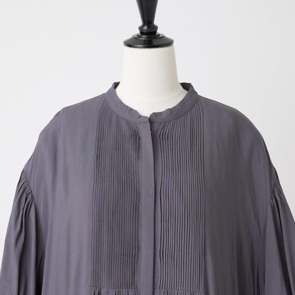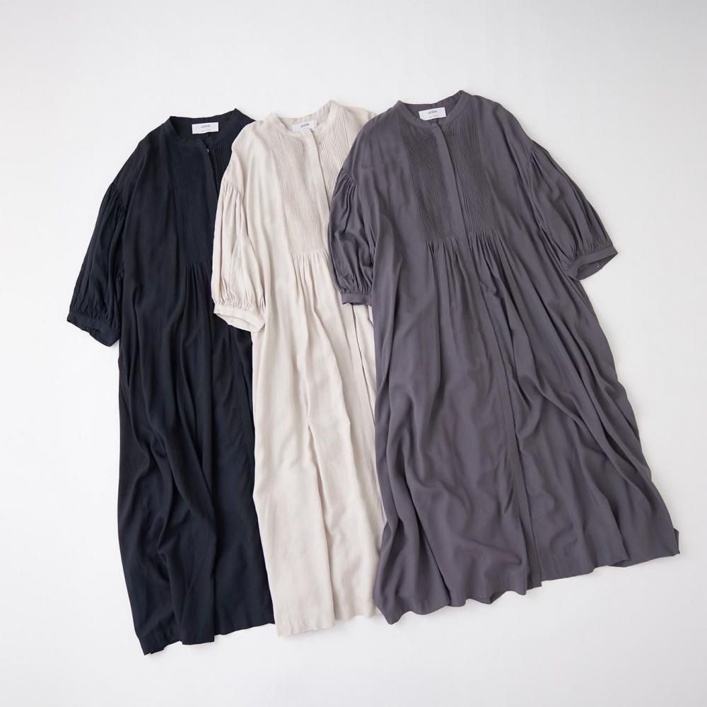 前後に施されたインドの職人による手仕事のピンタックがクラシカルな表情を添え、ピンタック下から生まれるたっぷりと入ったギャザーが動きに合わせて柔らかく揺れ、しっとりとした女性らしい雰囲気を演出します。