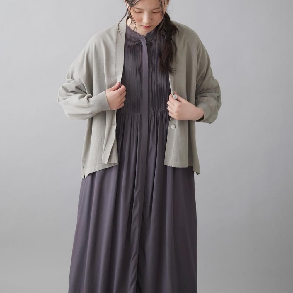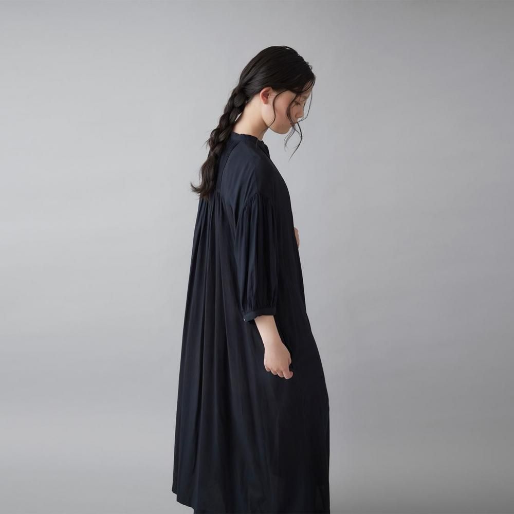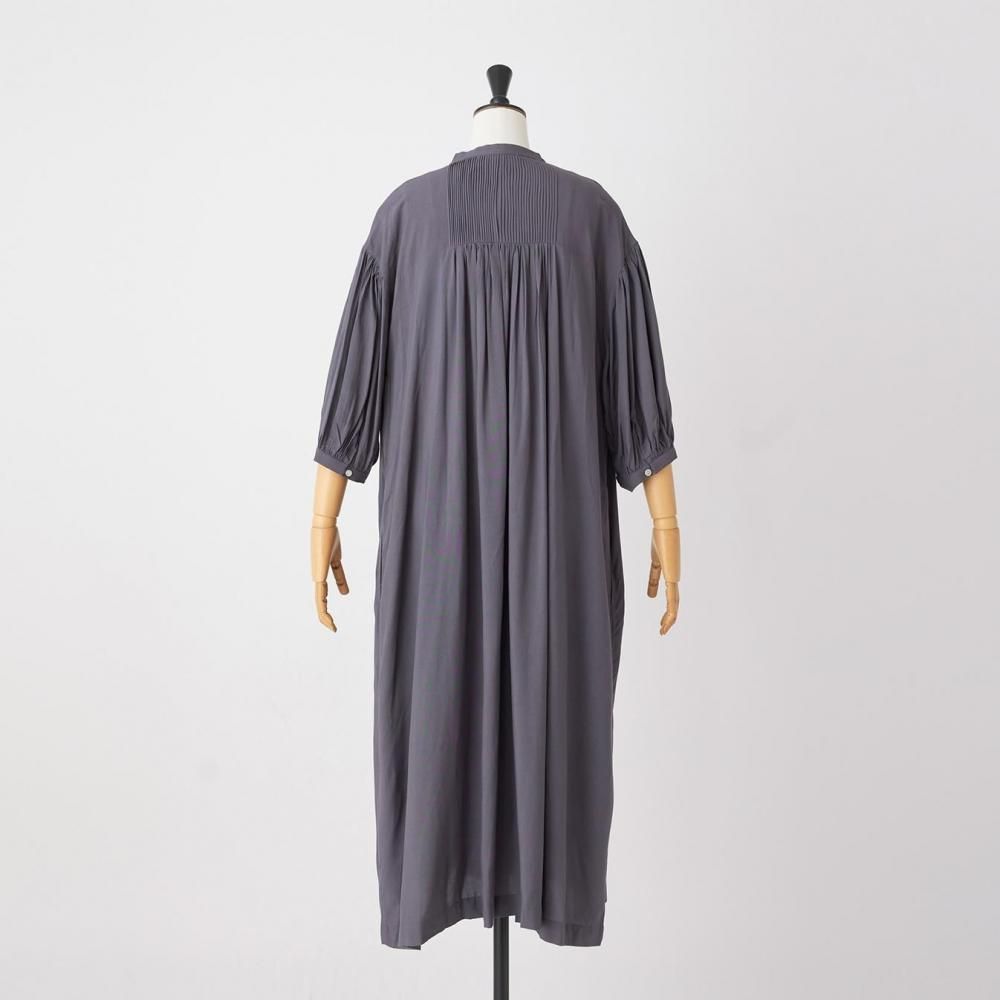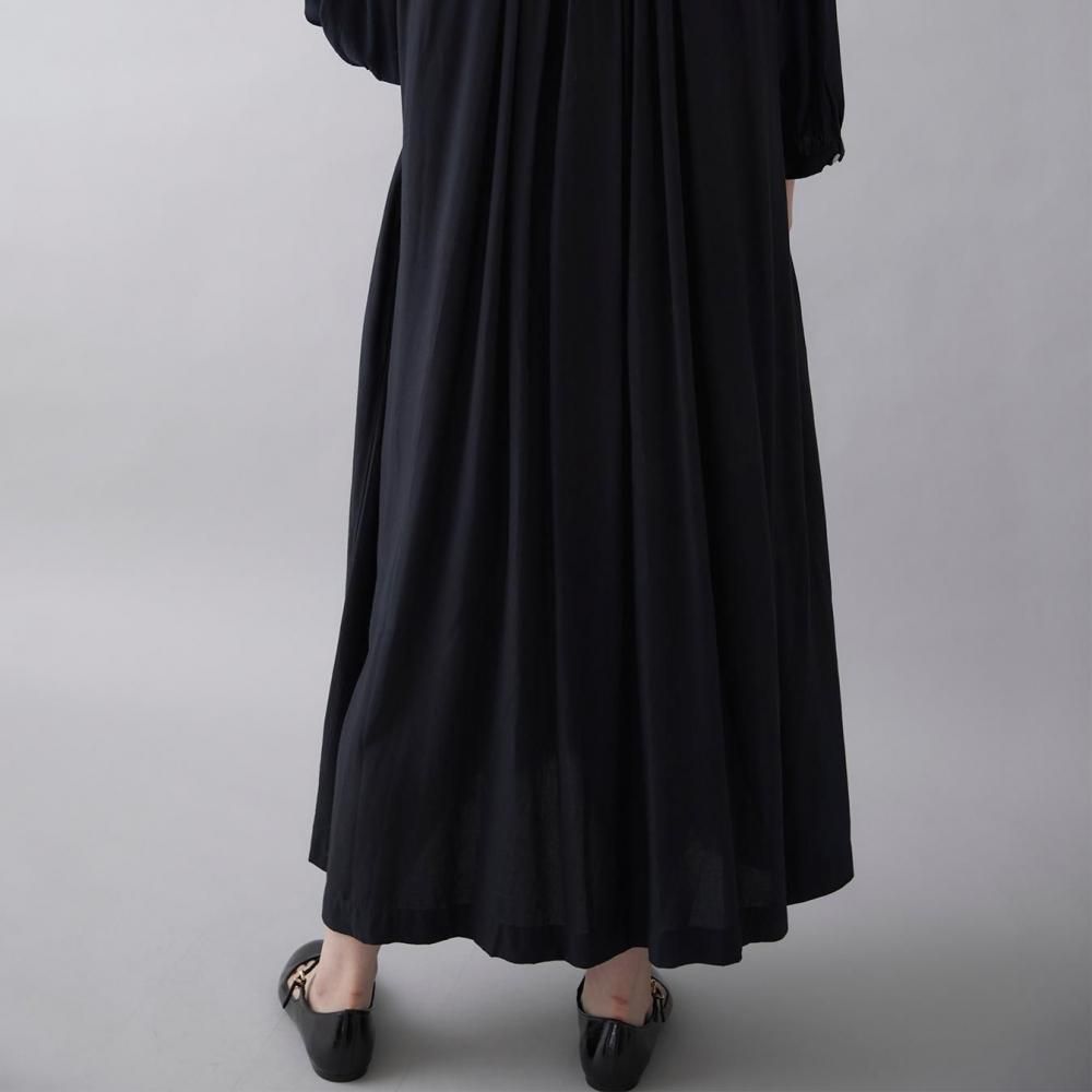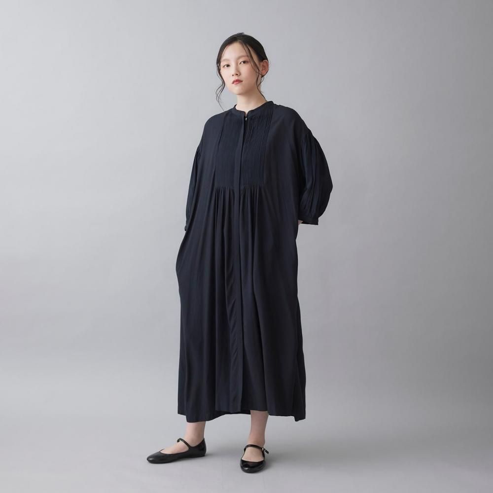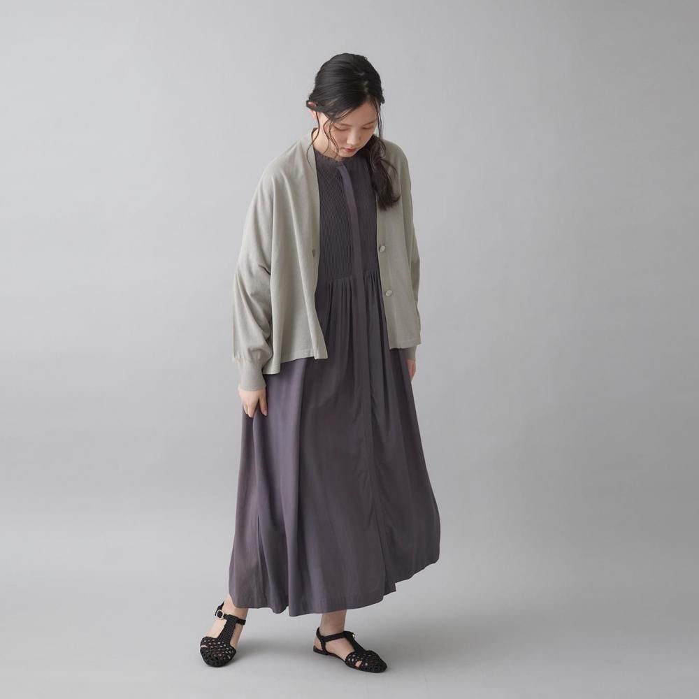 前後に施されたインドの職人による手仕事のピンタックがクラシカルな表情を添え、ピンタック下から生まれるたっぷりと入ったギャザーが動きに合わせて柔らかく揺れ、しっとりとした女性らしい雰囲気を演出します。