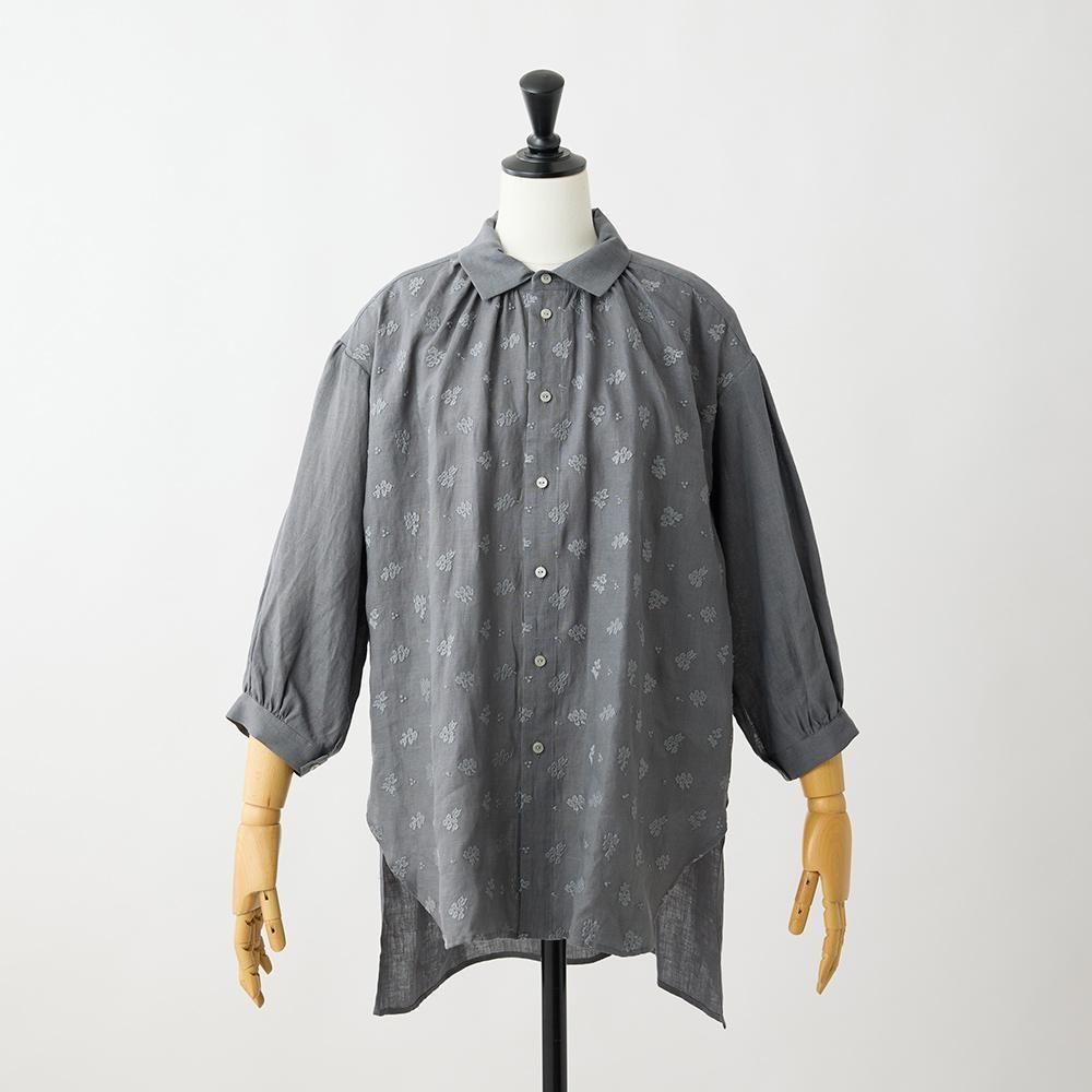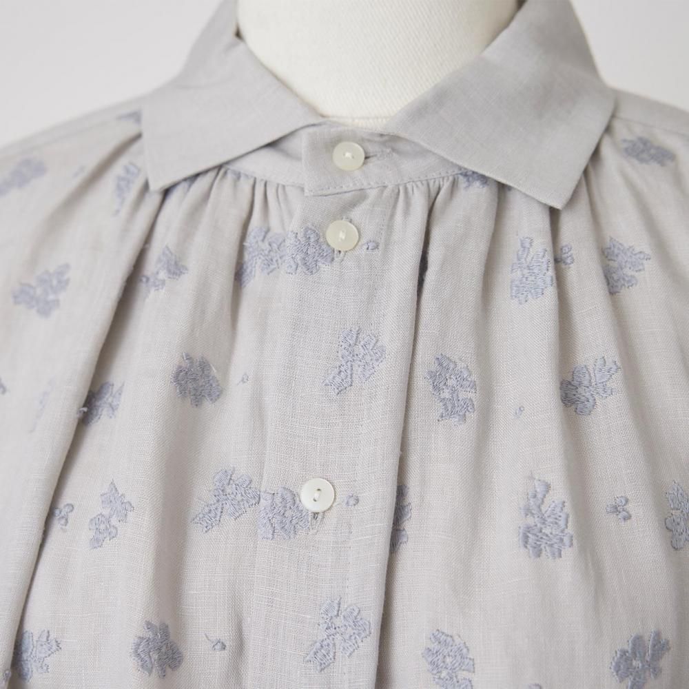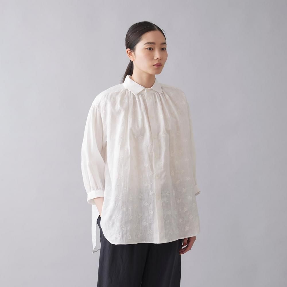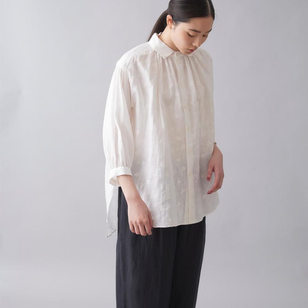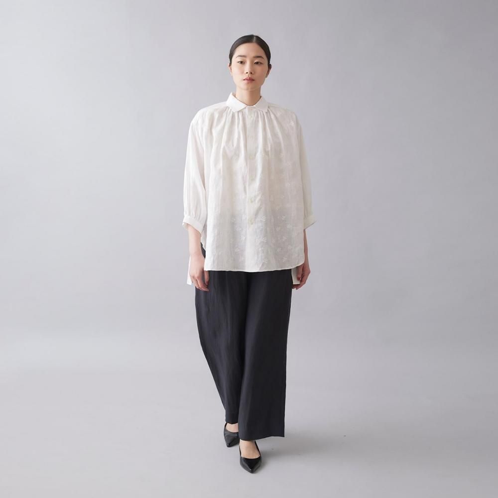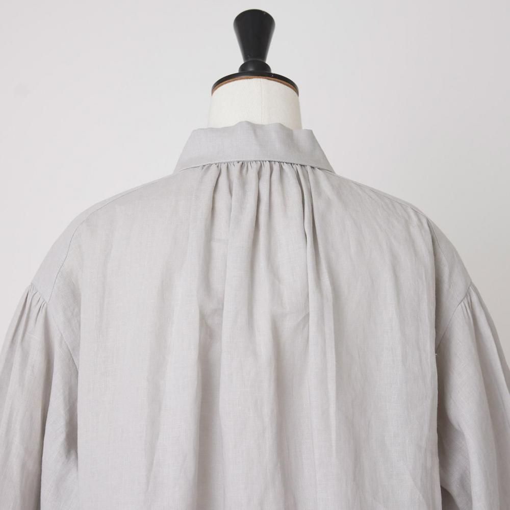 襟下から入ったギャザーがほどよいボリュームを生み、女性らしいやわらかな雰囲気を演出。