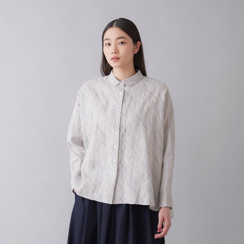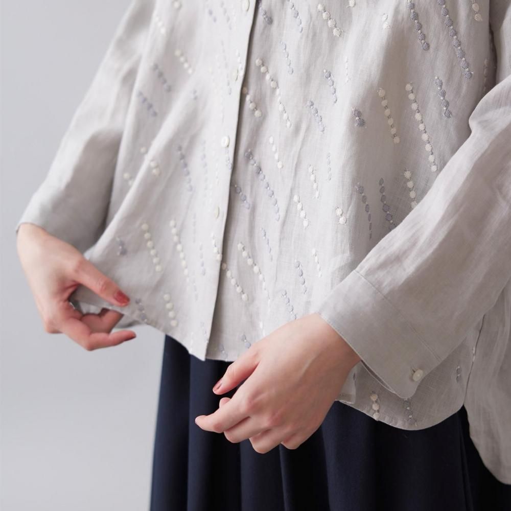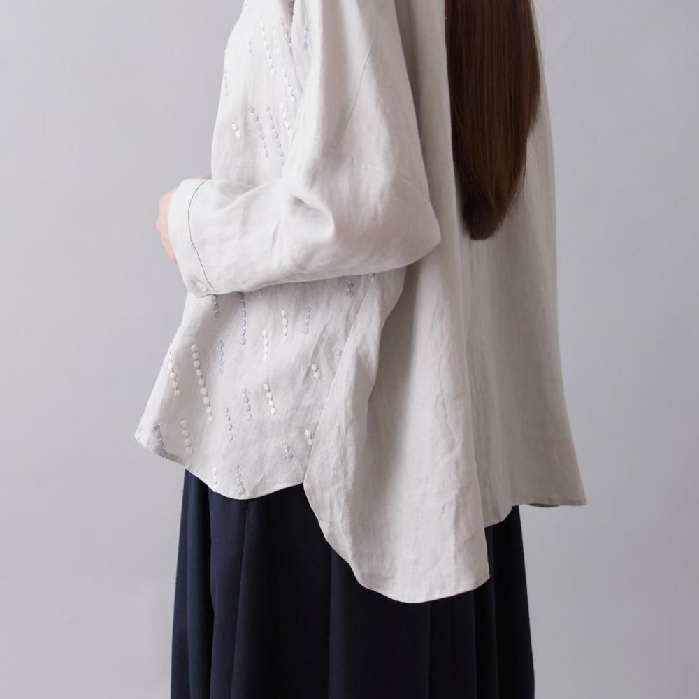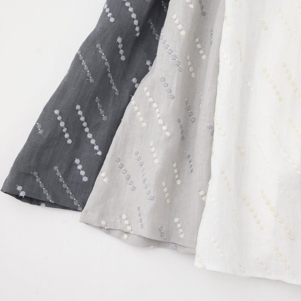自然な風合いと刺繍の繊細さが詩を紡ぐように響き合い、シンプルな装いの中に控えめな華やかさを添えます。