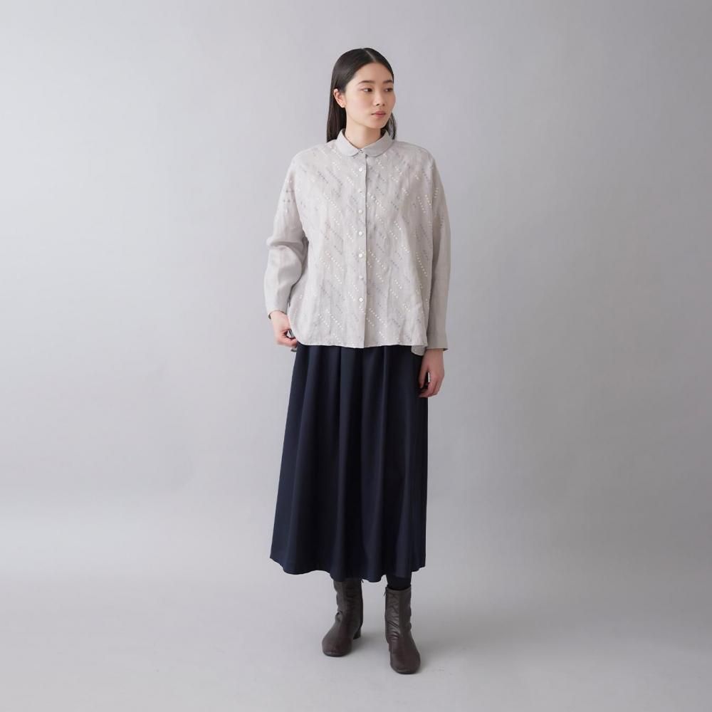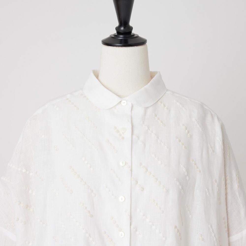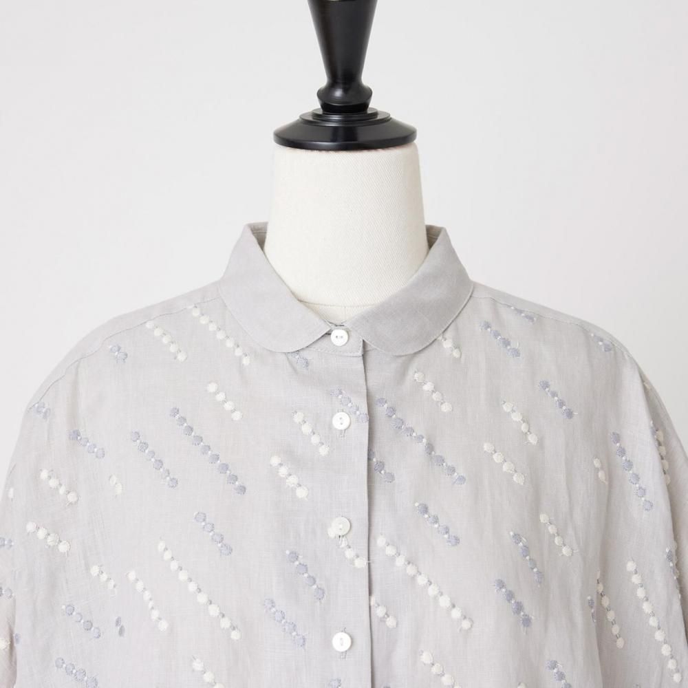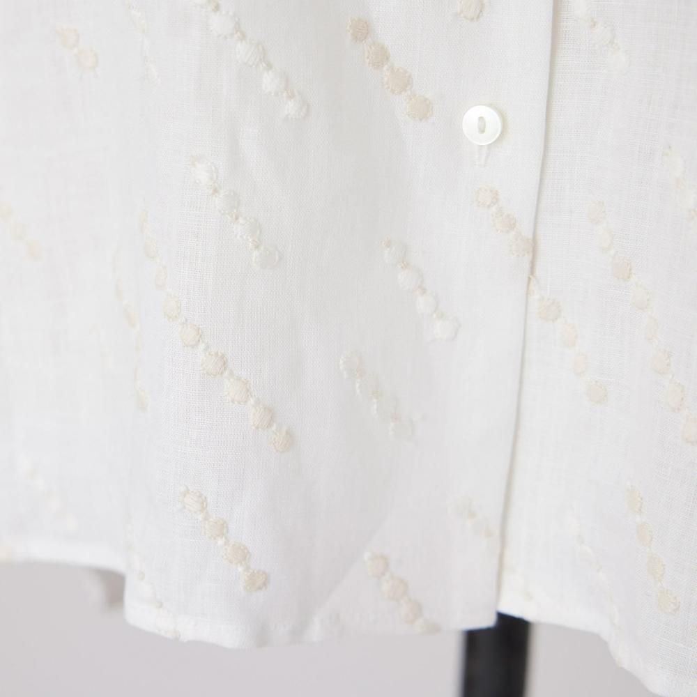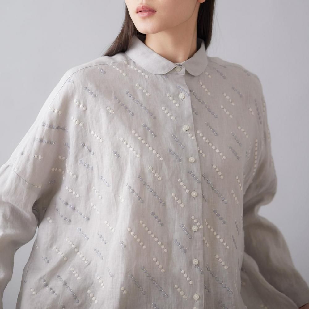 自然な風合いと刺繍の繊細さが詩を紡ぐように響き合い、シンプルな装いの中に控えめな華やかさを添えます。