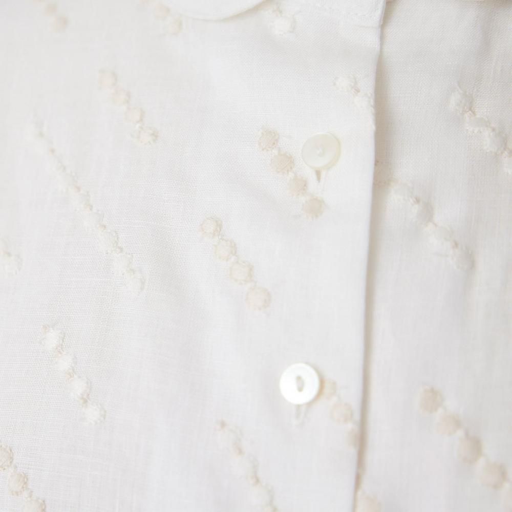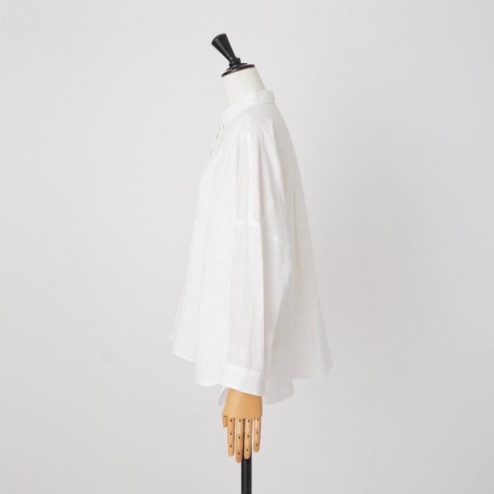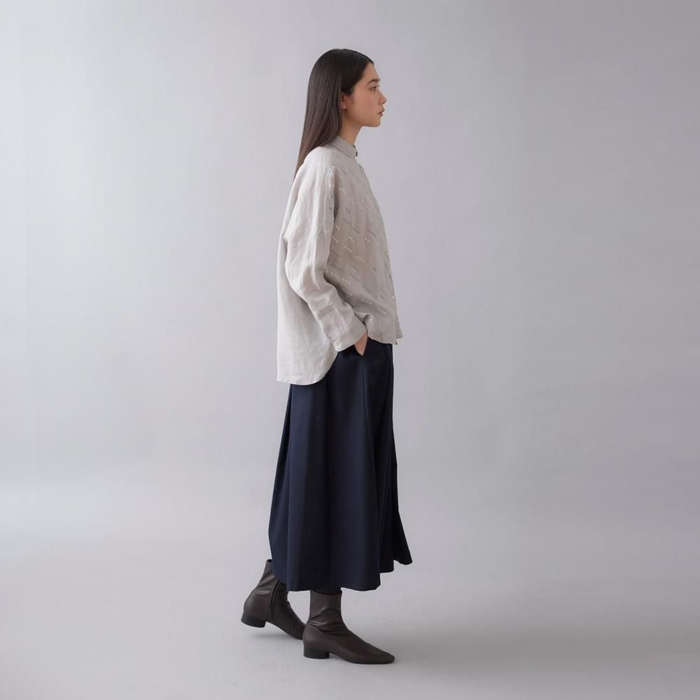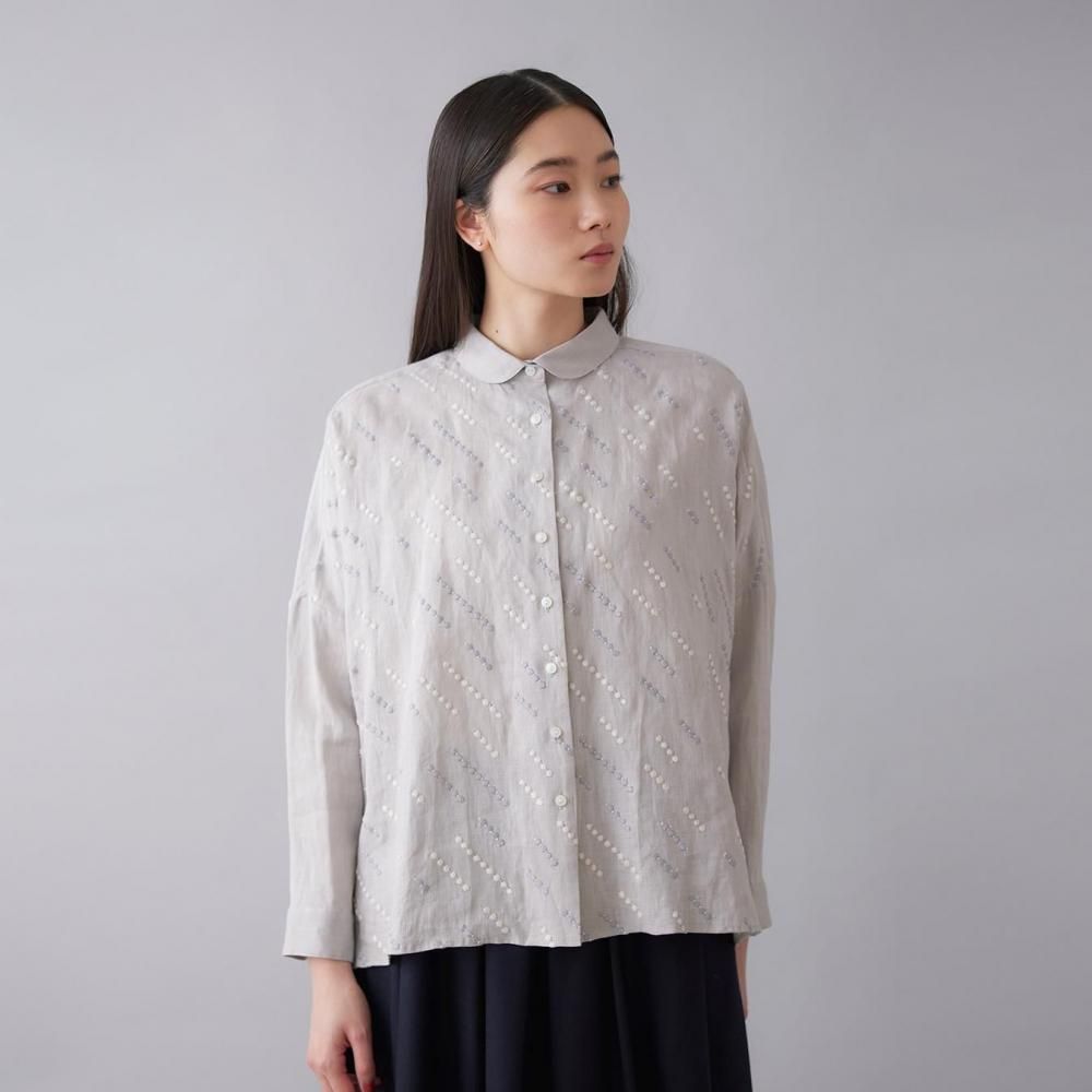 自然な風合いと刺繍の繊細さが詩を紡ぐように響き合い、シンプルな装いの中に控えめな華やかさを添えます。
