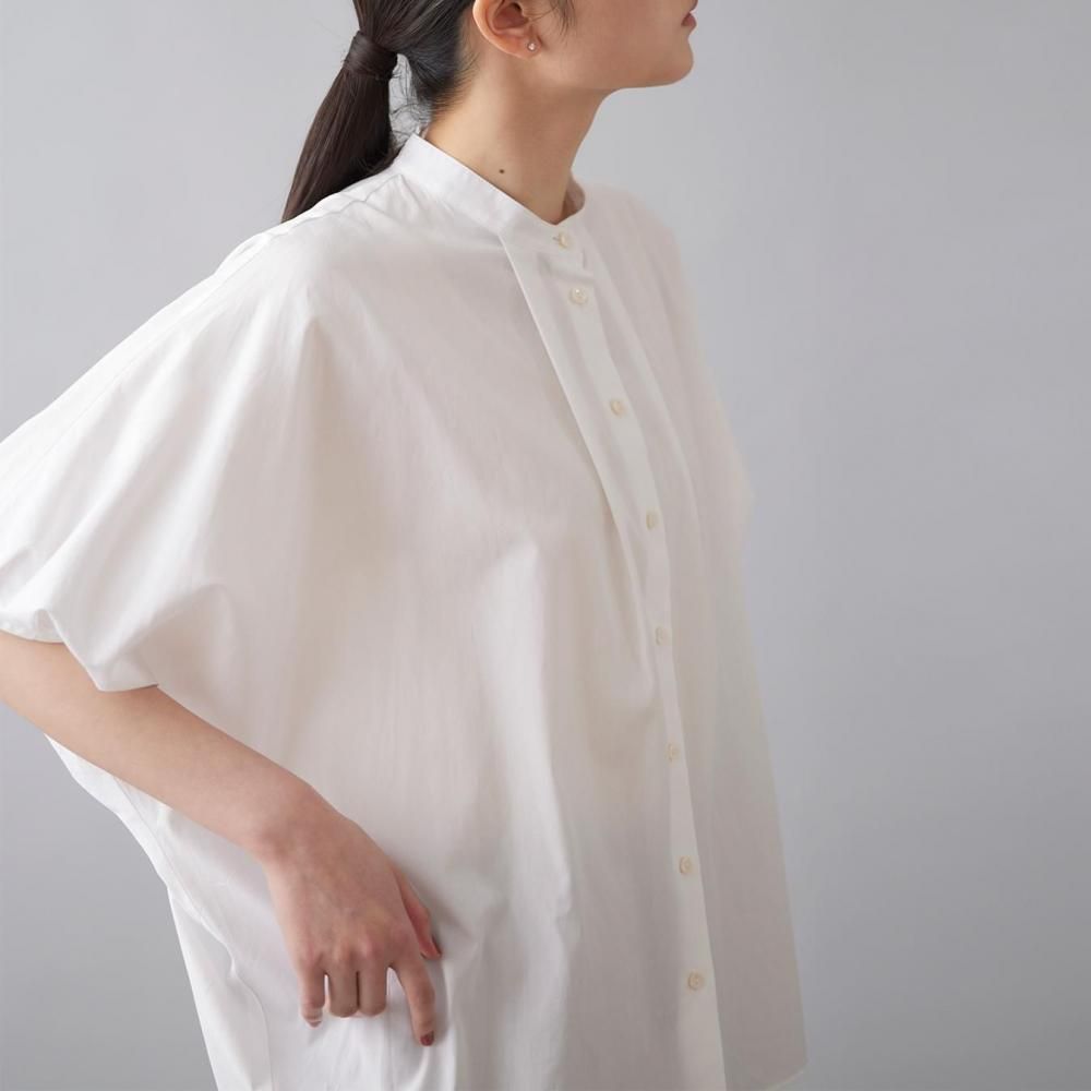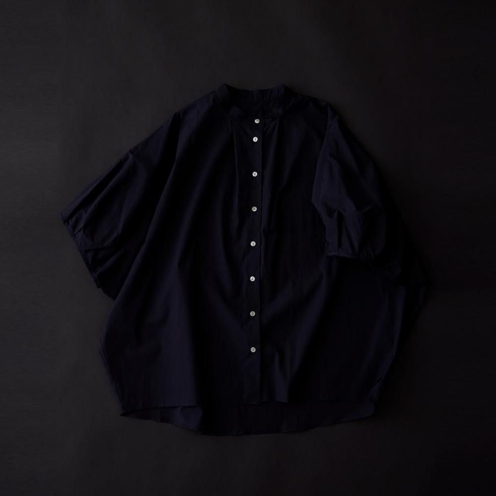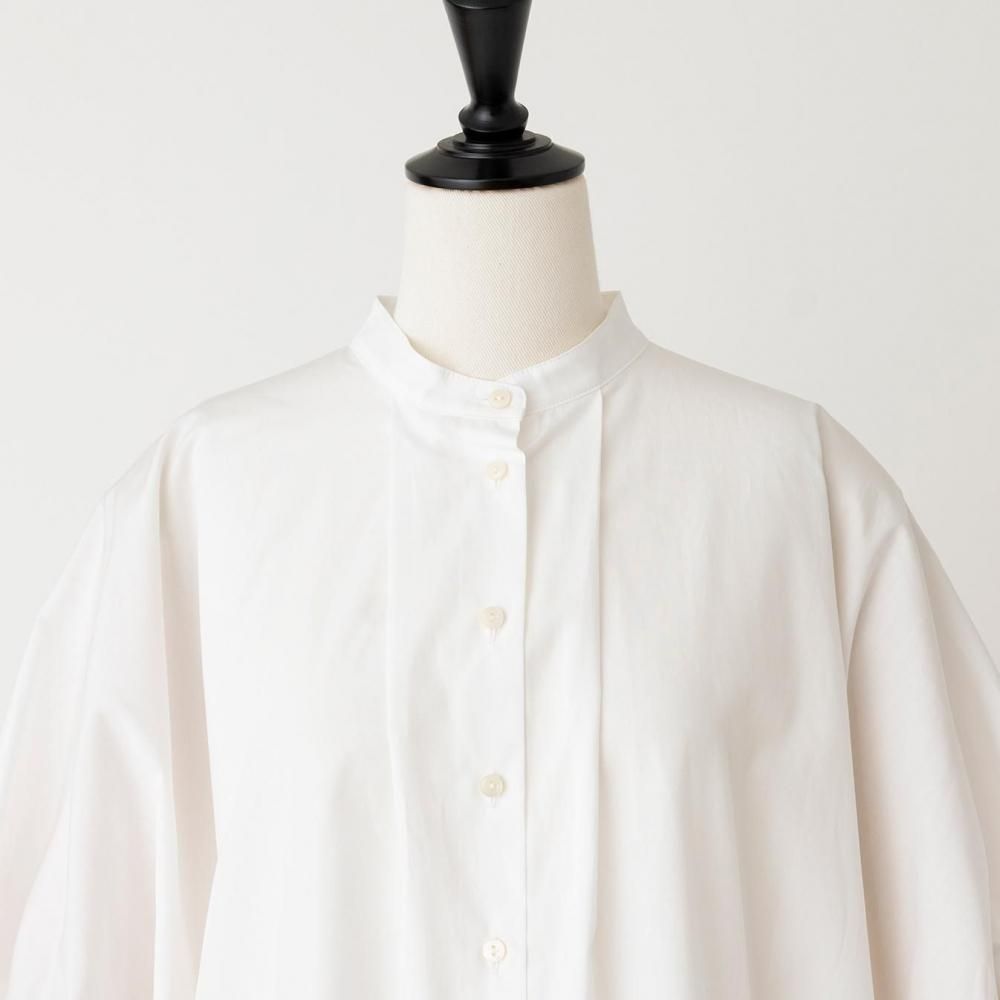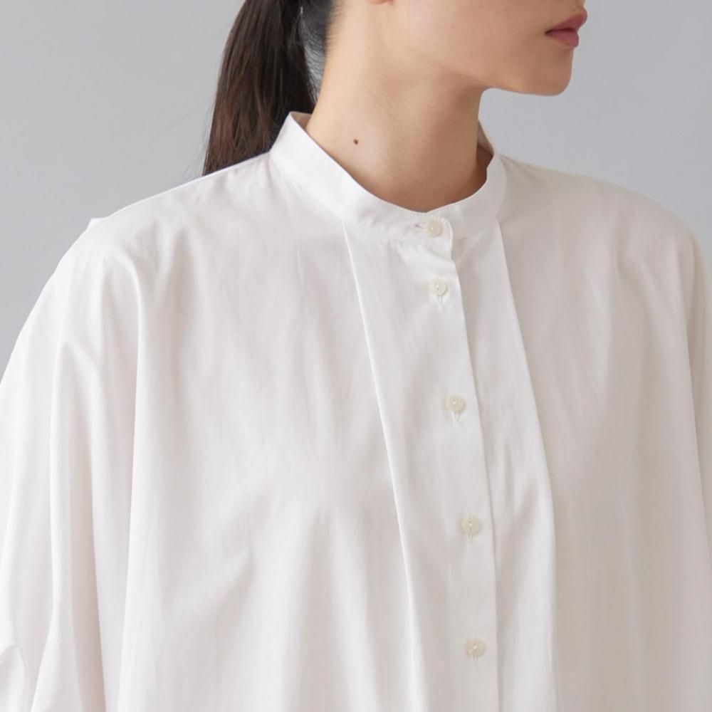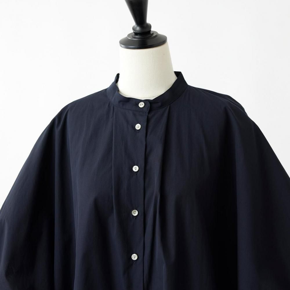 たっぷりとした身幅と直線的なラインがリラックス感を演出しつつ、すっきりとしたスタンドカラーとフロントボタンが全体を引き締め、上品なバランスに仕上げています。