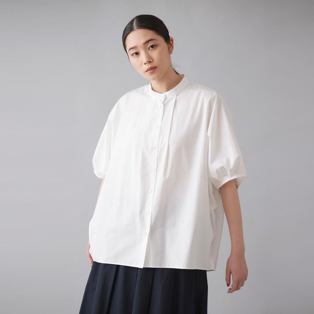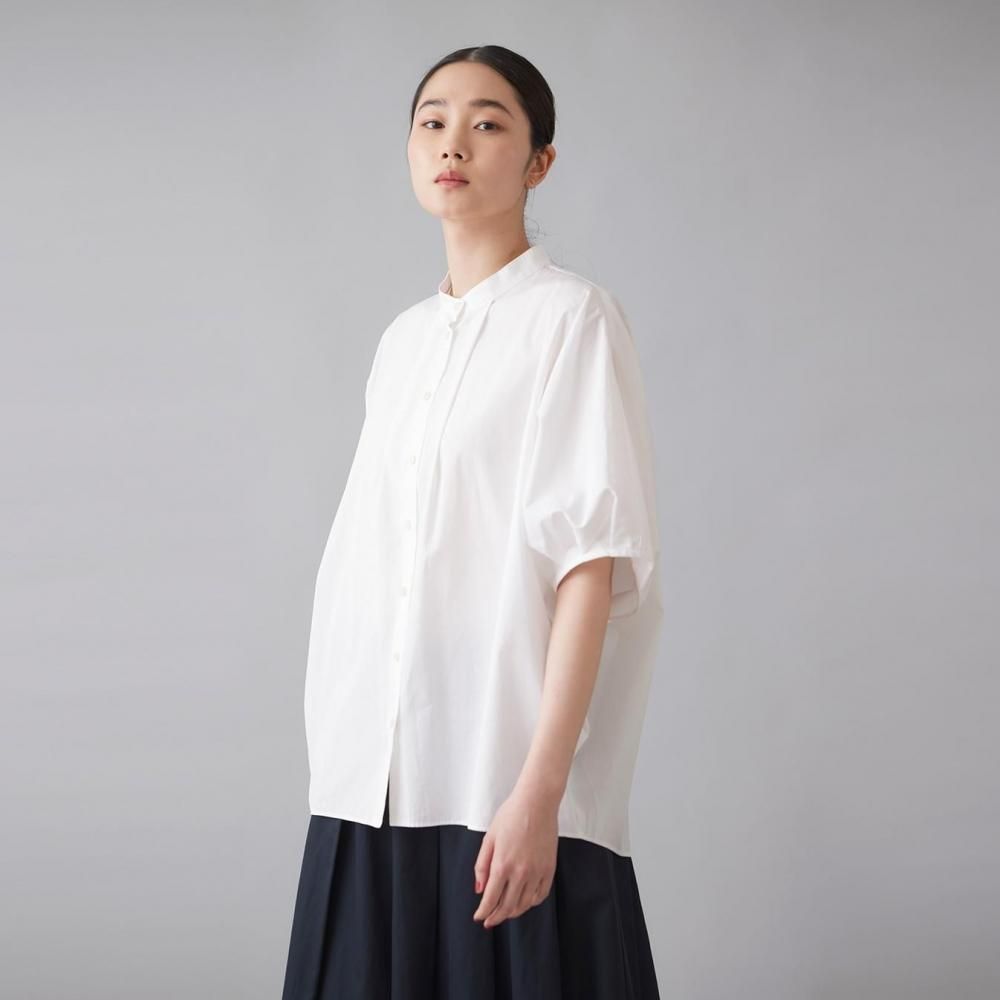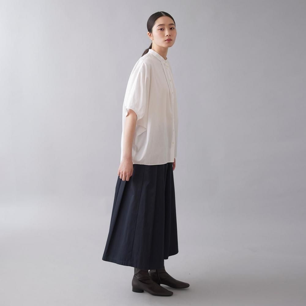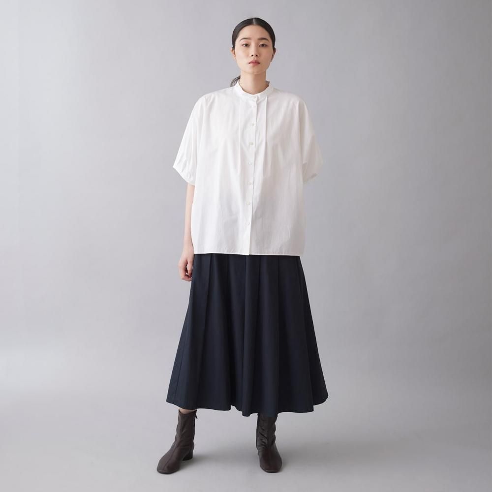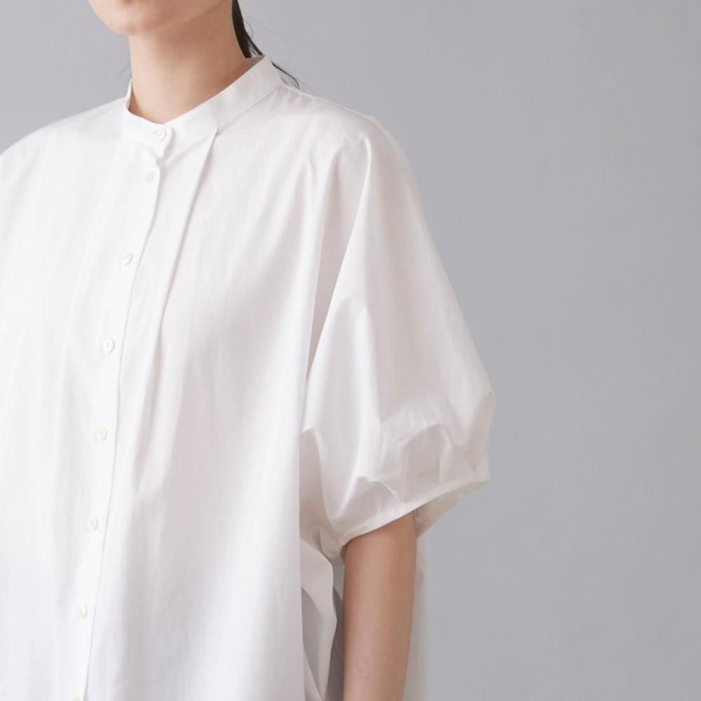 たっぷりとした身幅と直線的なラインがリラックス感を演出しつつ、すっきりとしたスタンドカラーとフロントボタンが全体を引き締め、上品なバランスに仕上げています。