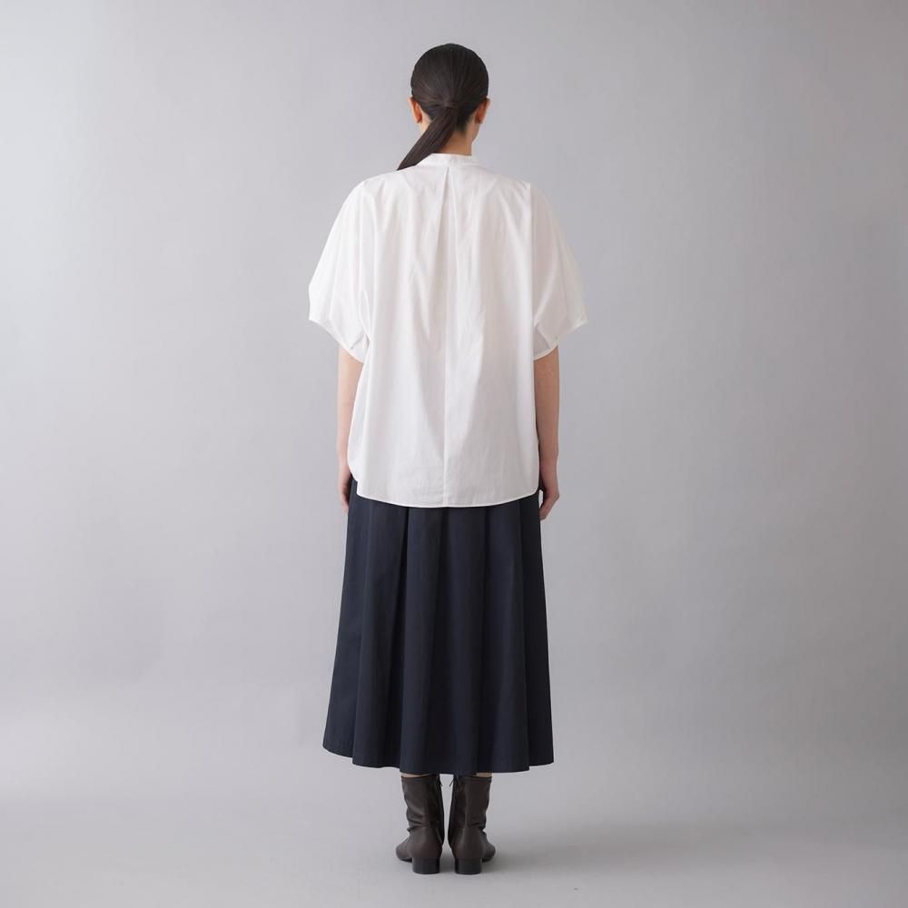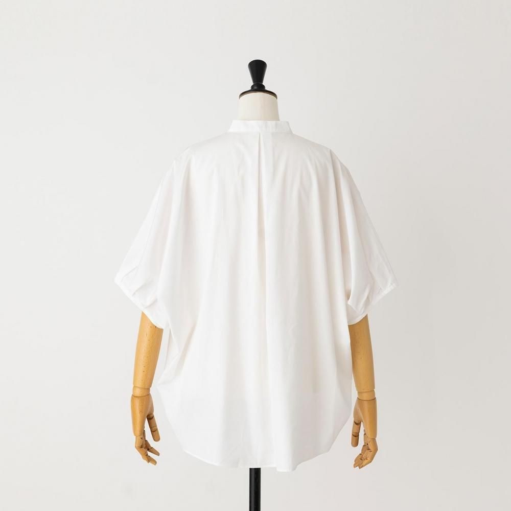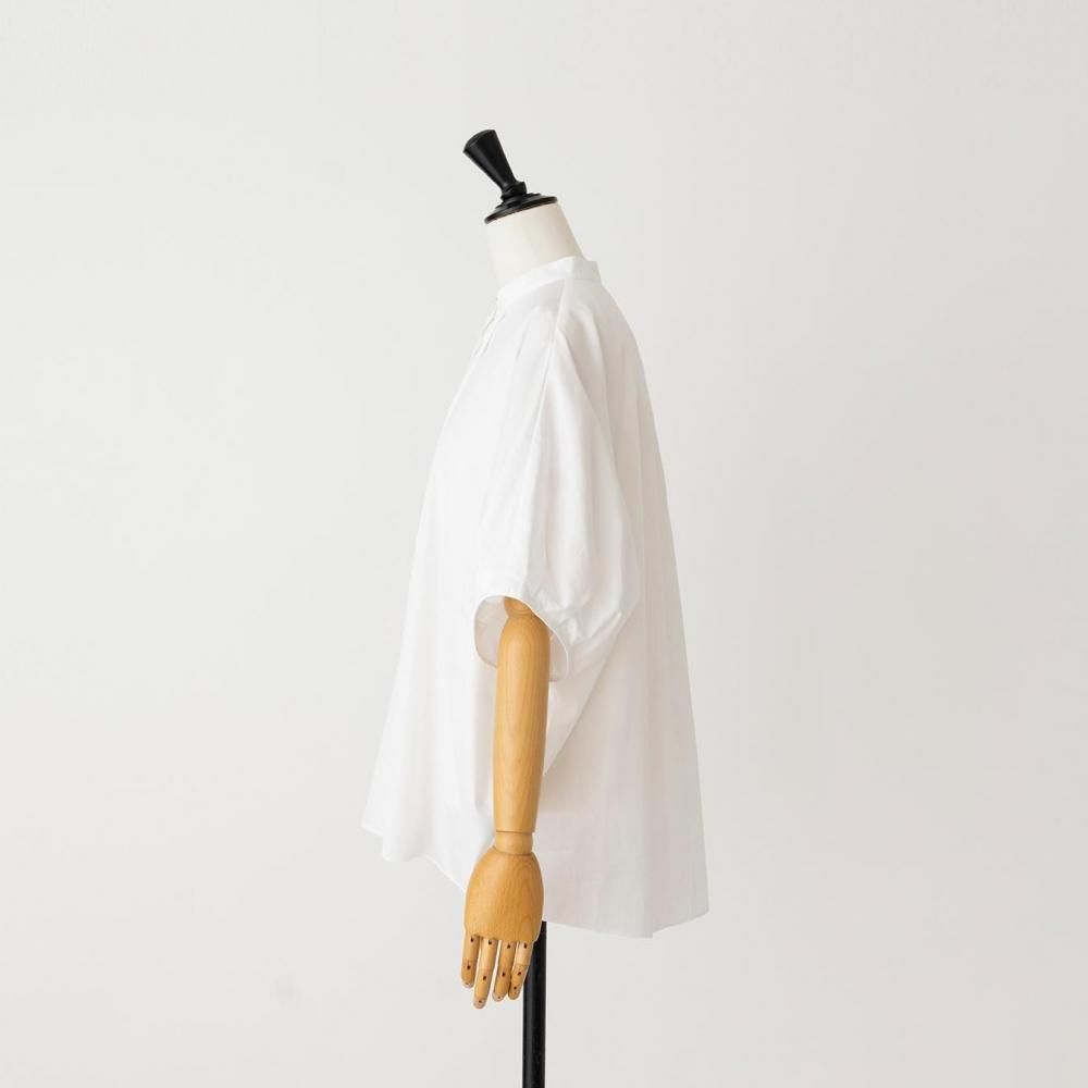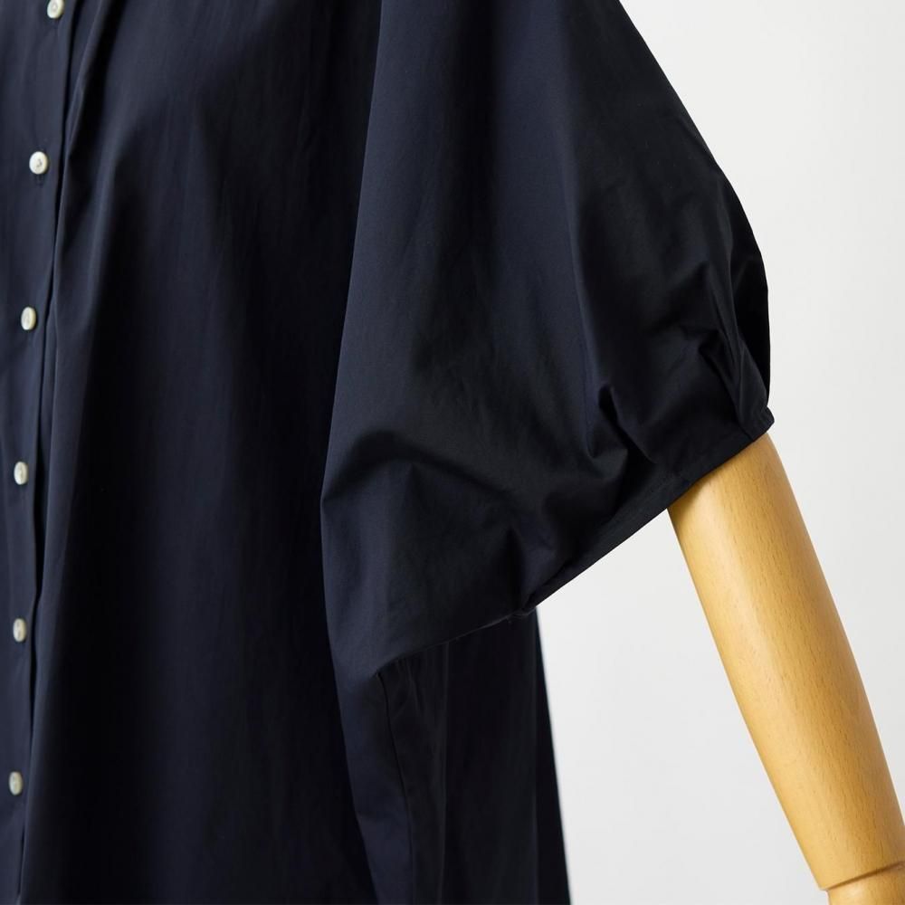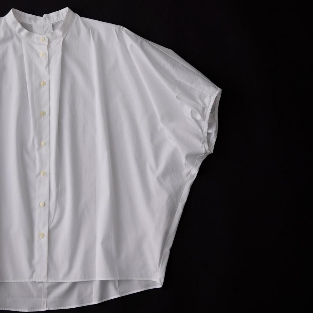 たっぷりとした身幅と直線的なラインがリラックス感を演出しつつ、すっきりとしたスタンドカラーとフロントボタンが全体を引き締め、上品なバランスに仕上げています。