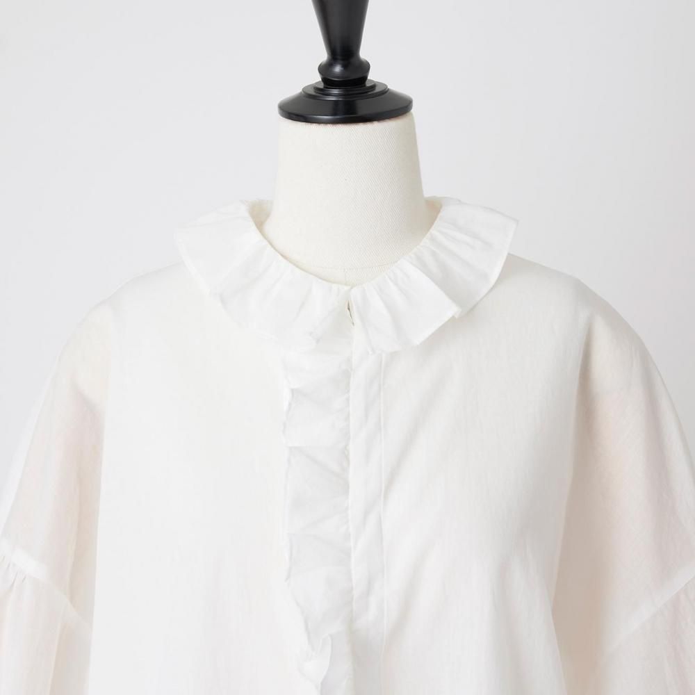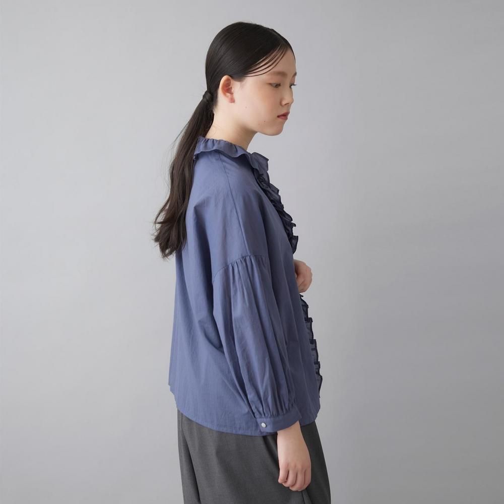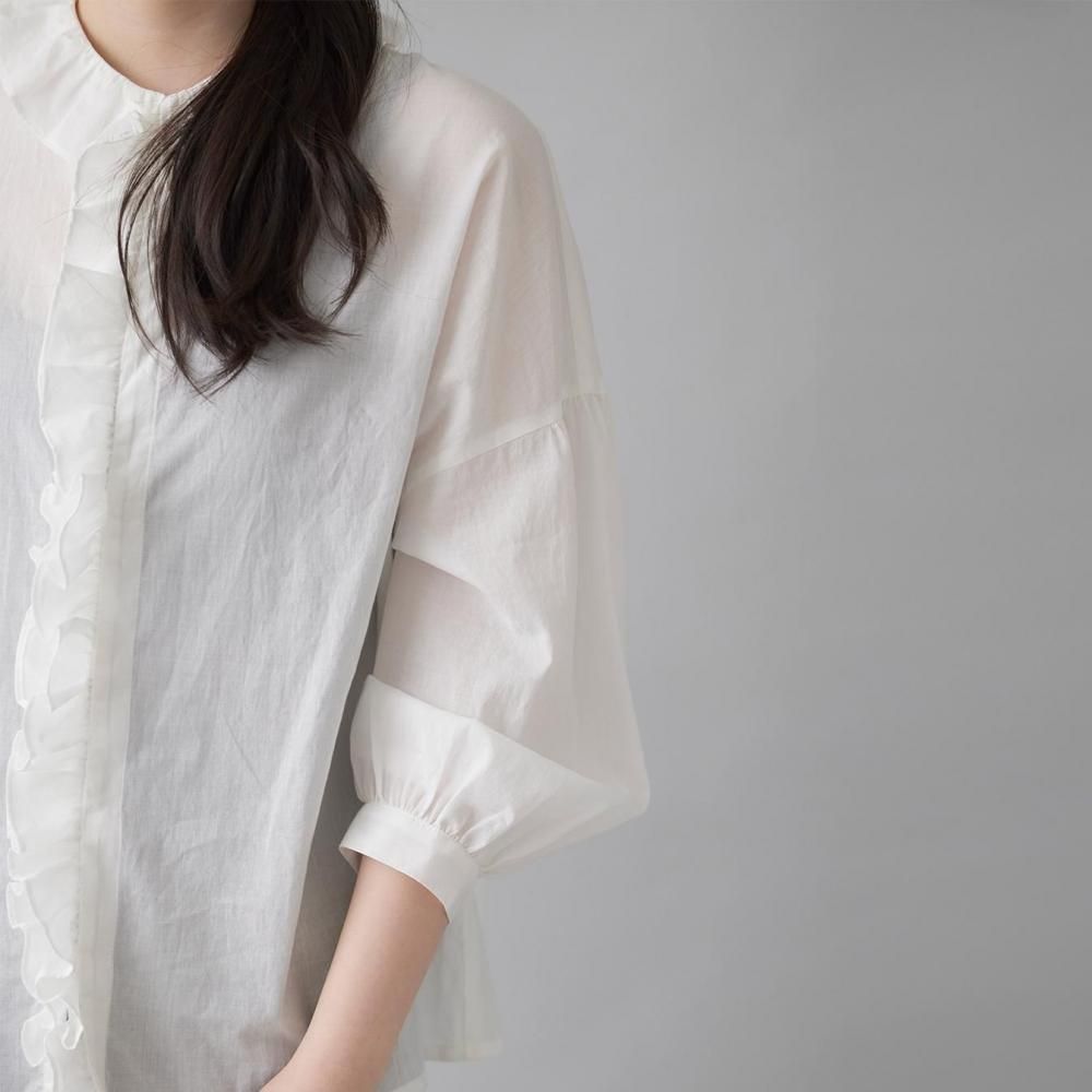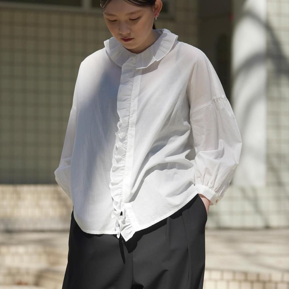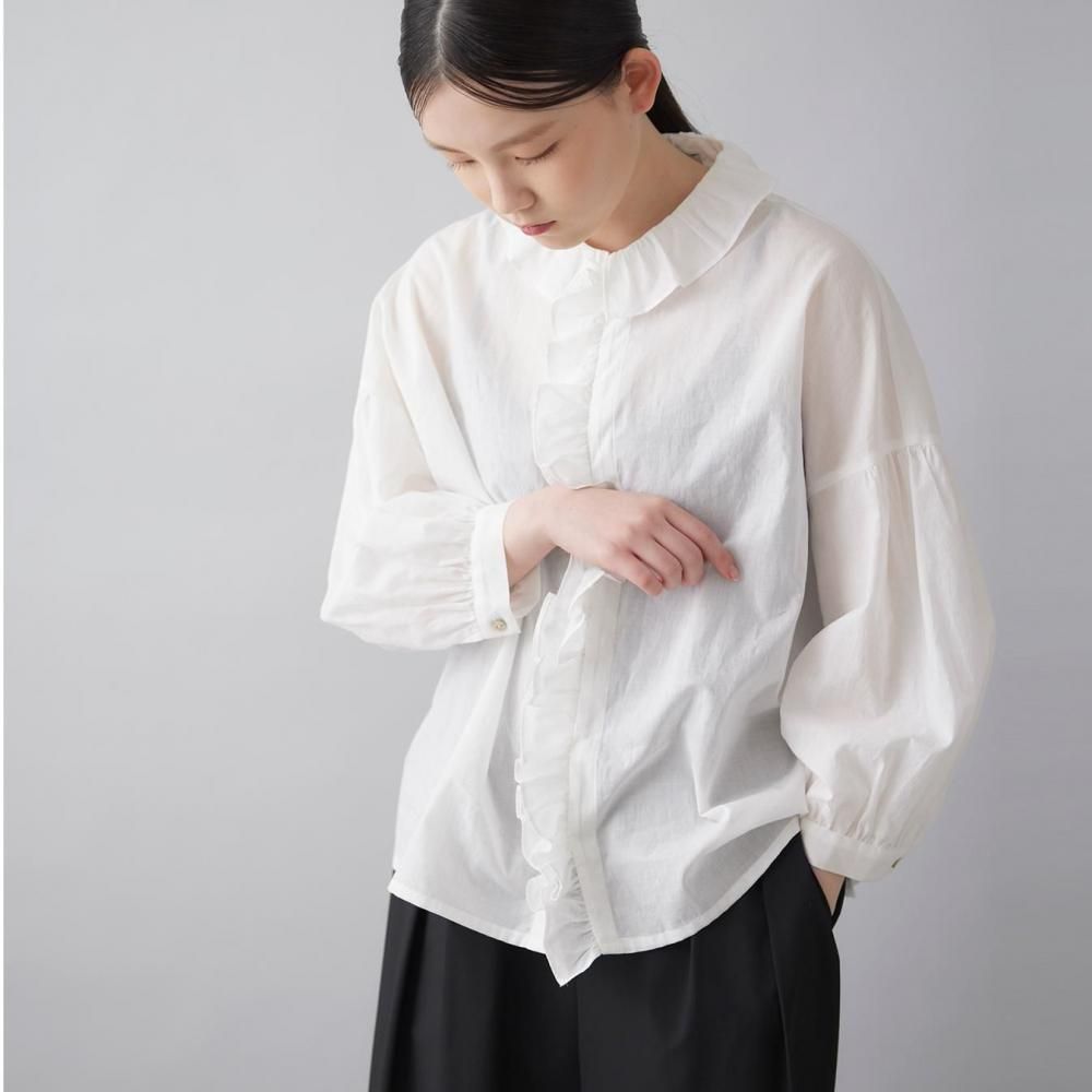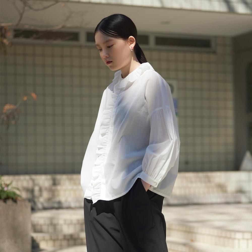 襟元からフロントにかけて施されたフリルが、動くたびに軽やかな表情を添え、袖には細かなギャザーを入れて立体感をプラス。