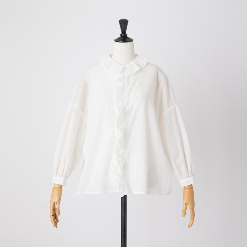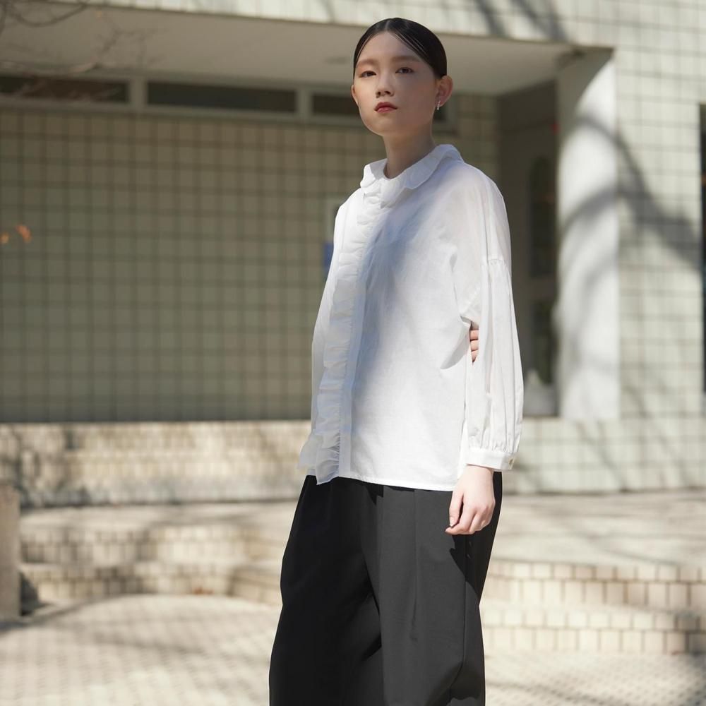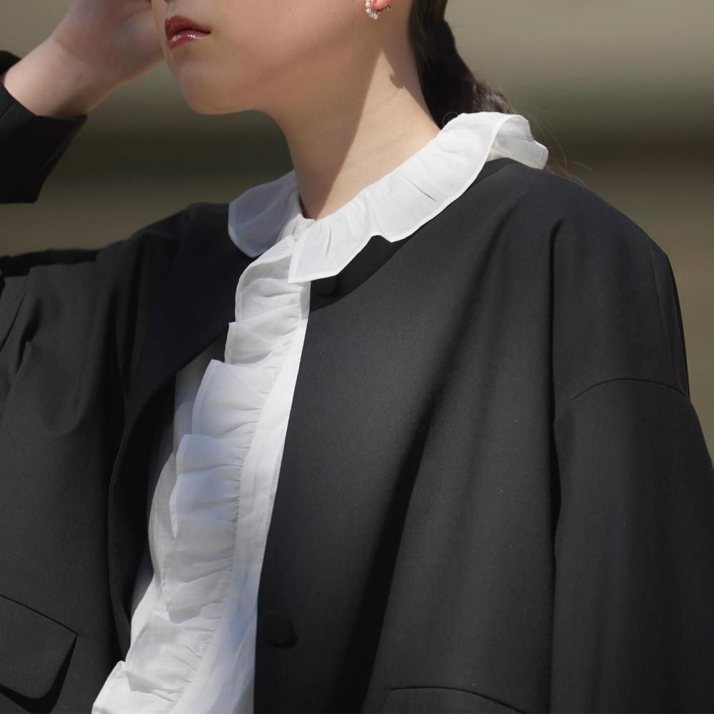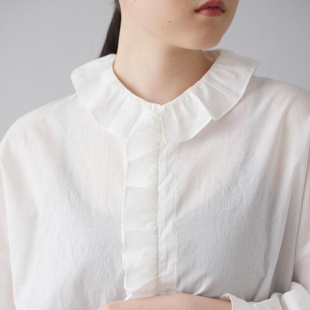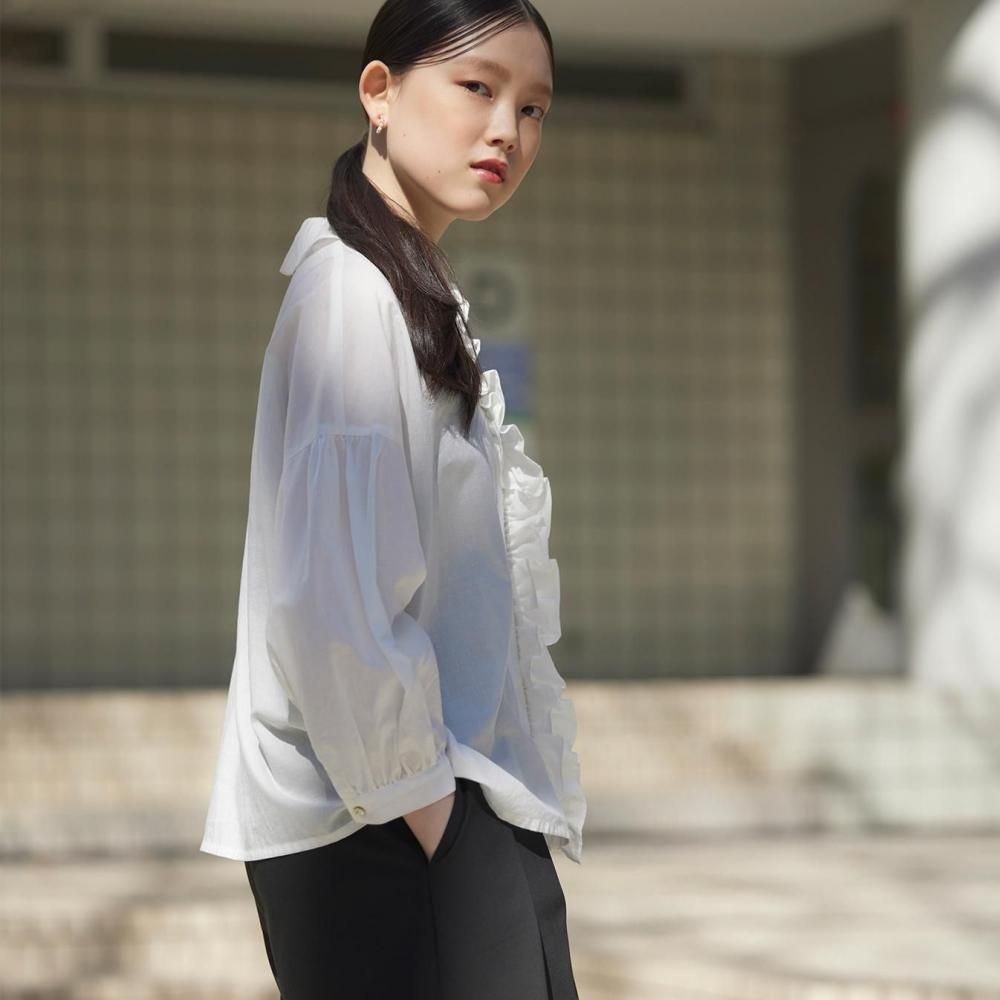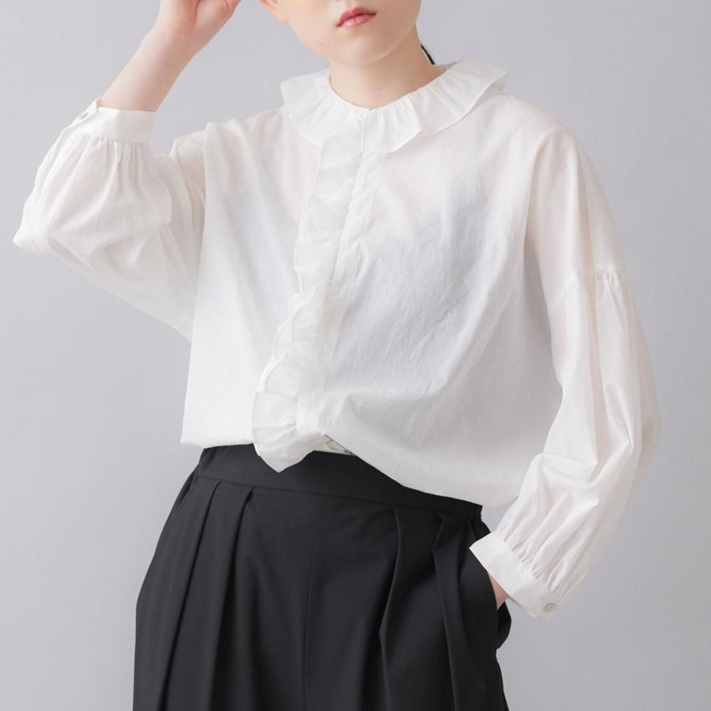 襟元からフロントにかけて施されたフリルが、動くたびに軽やかな表情を添え、袖には細かなギャザーを入れて立体感をプラス。