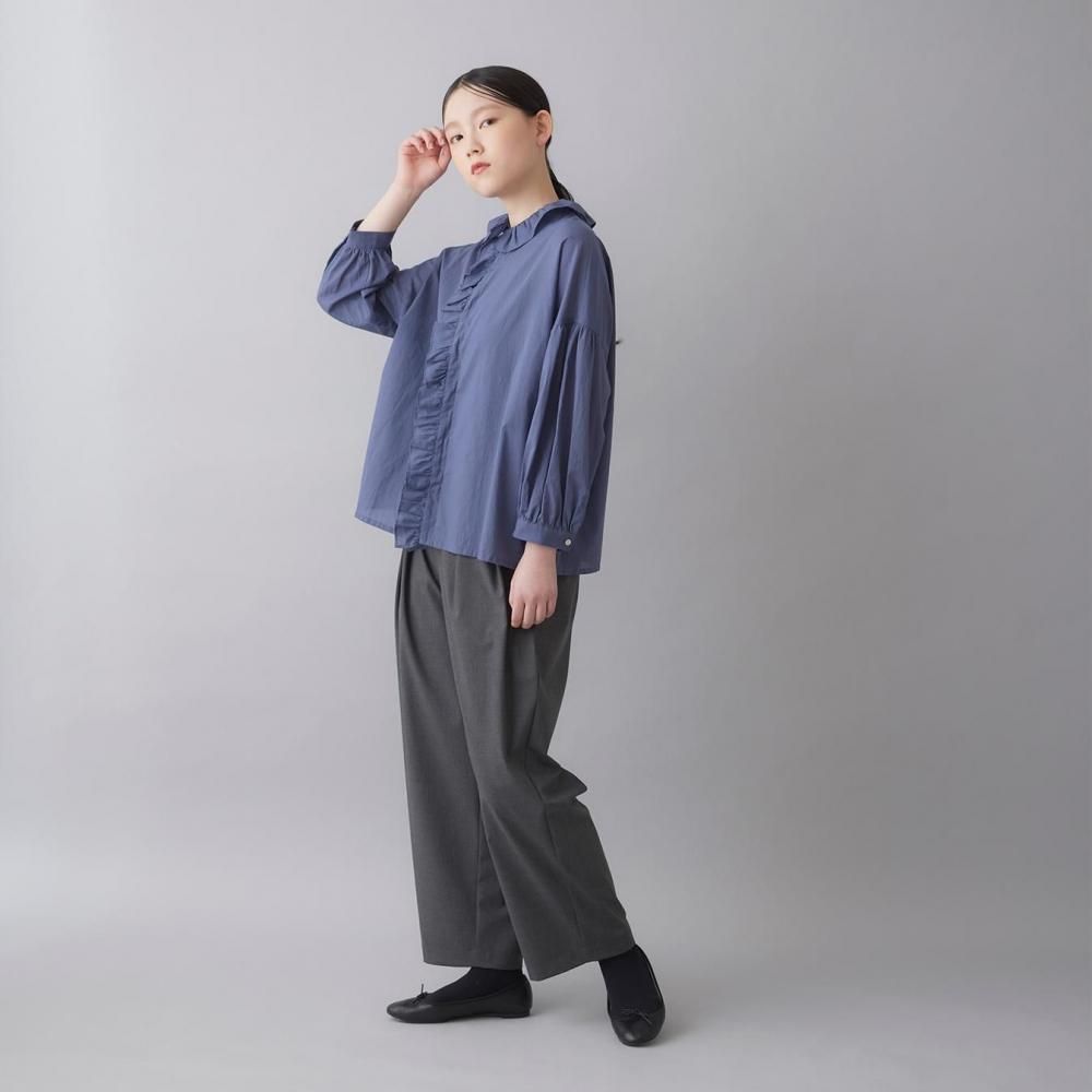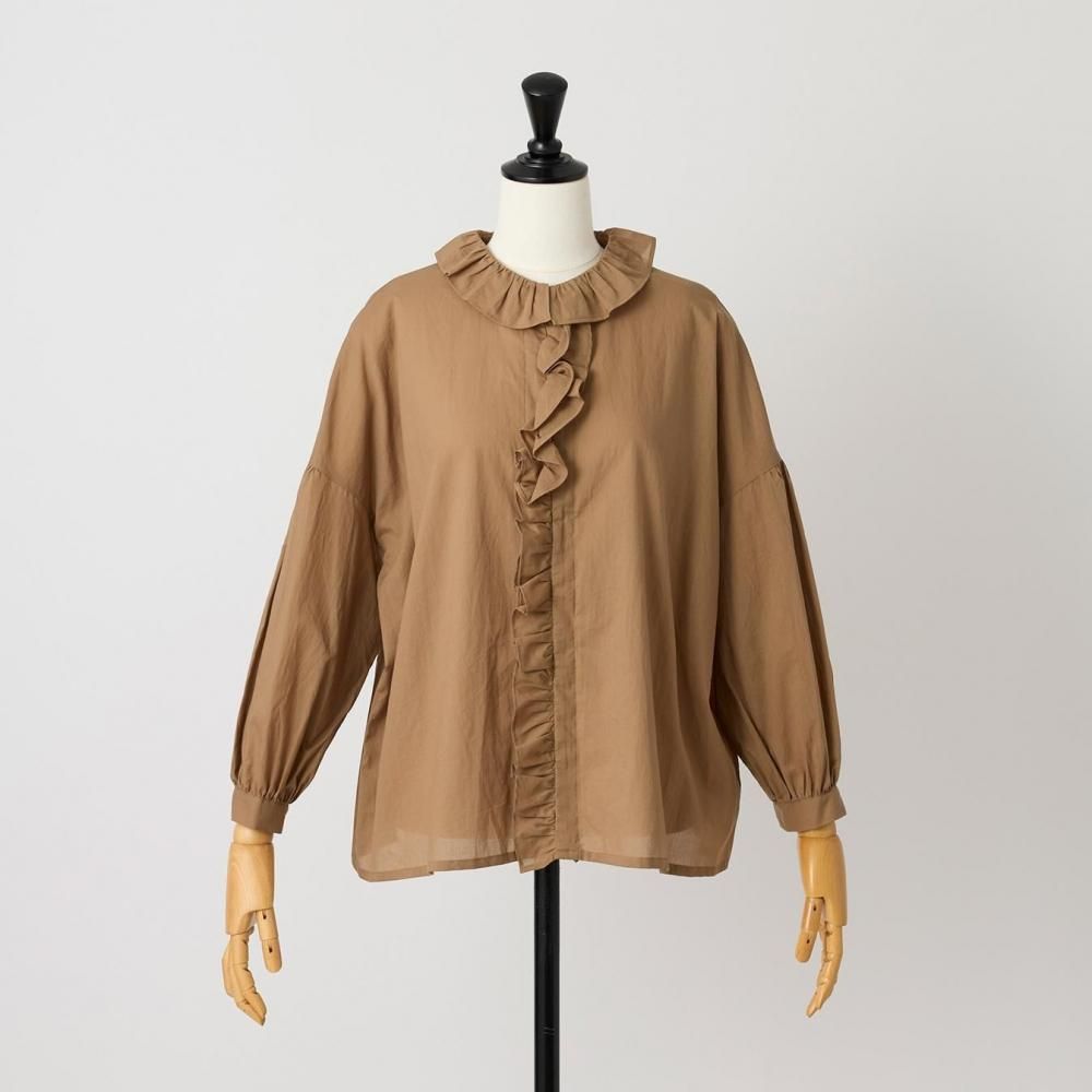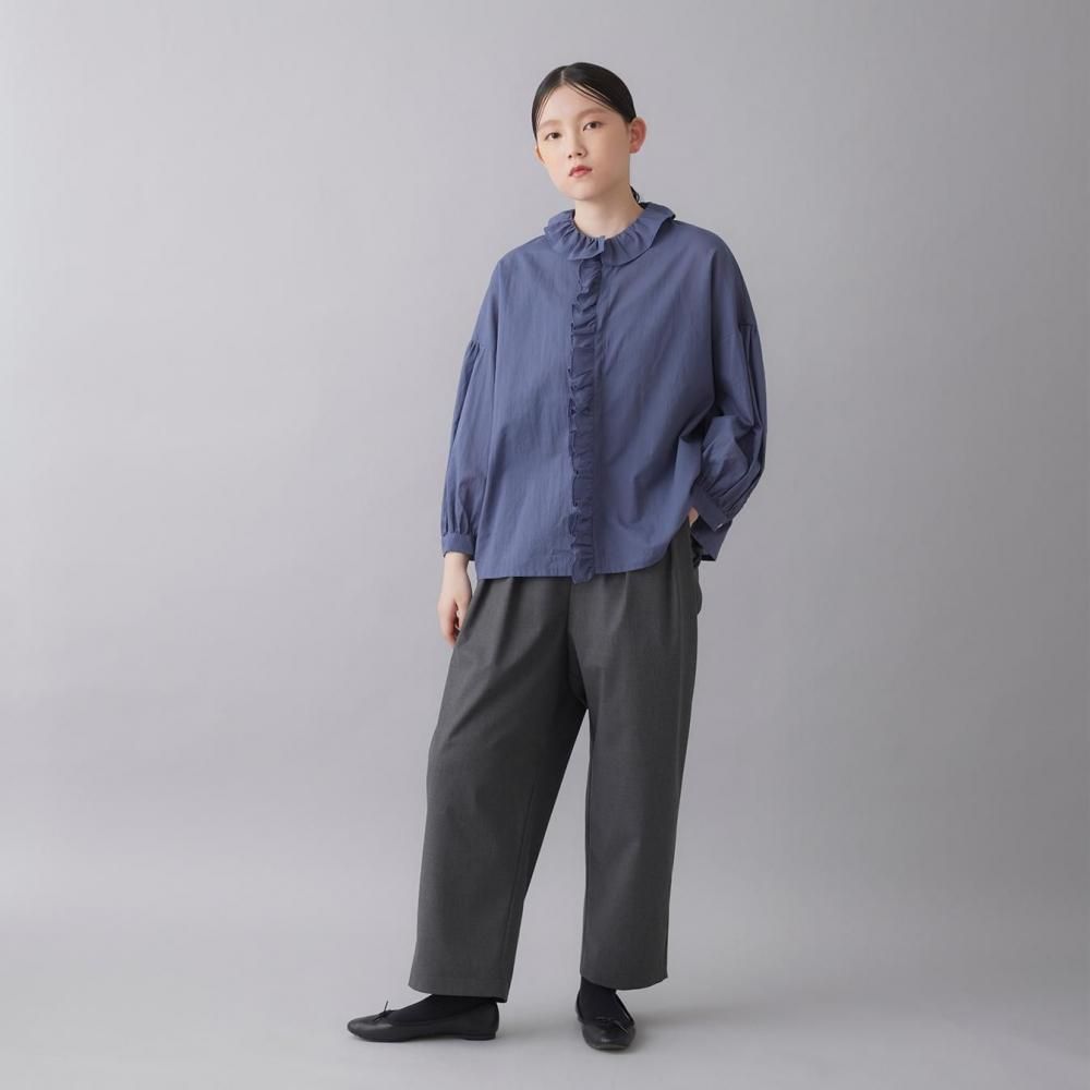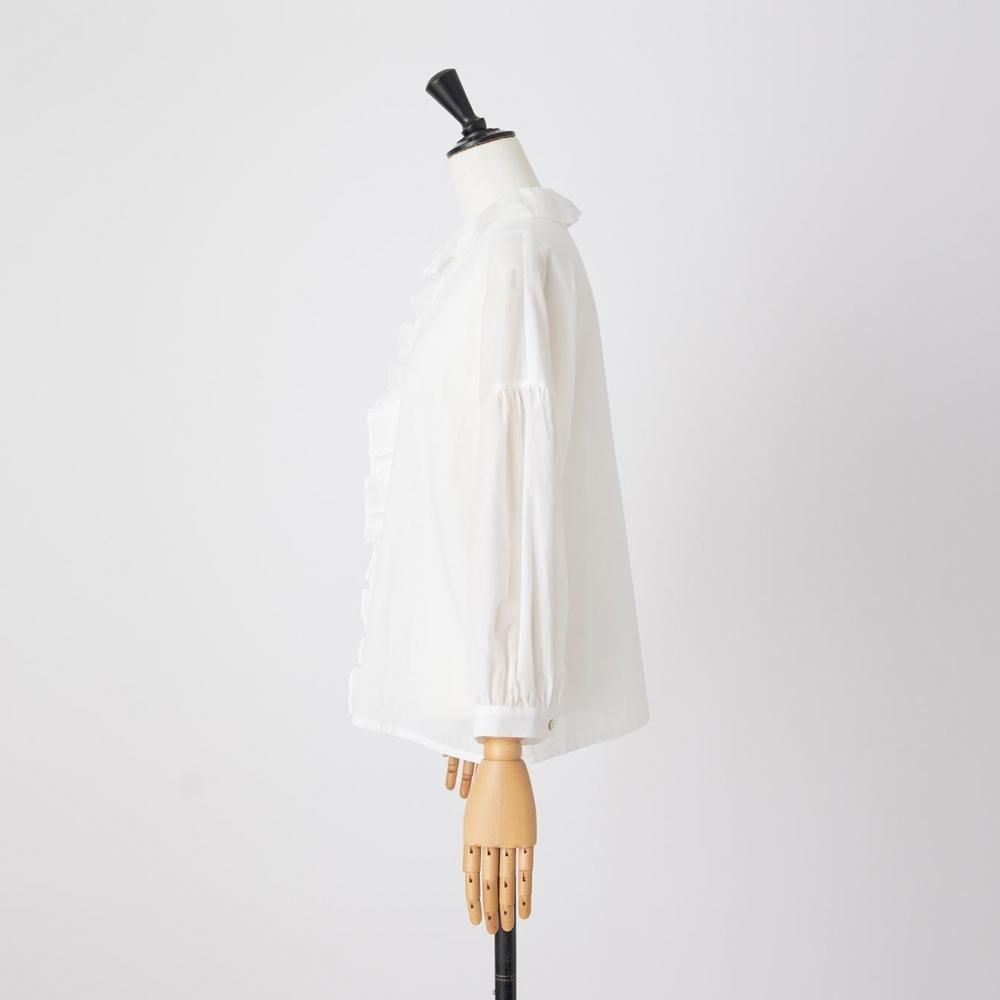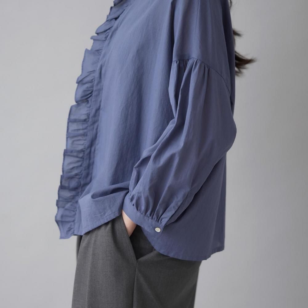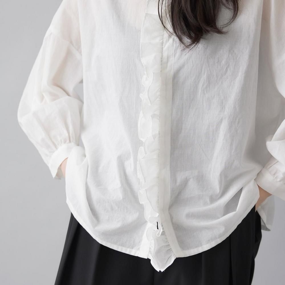 襟元からフロントにかけて施されたフリルが、動くたびに軽やかな表情を添え、袖には細かなギャザーを入れて立体感をプラス。