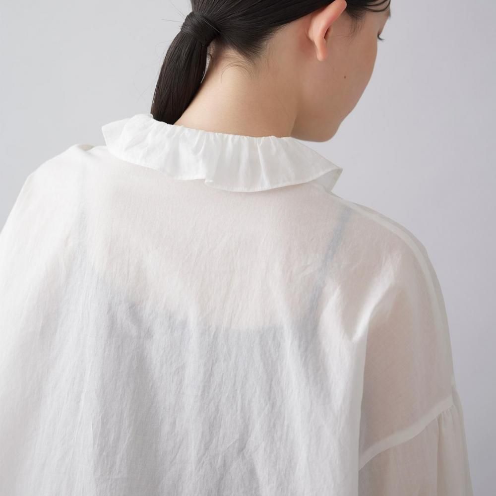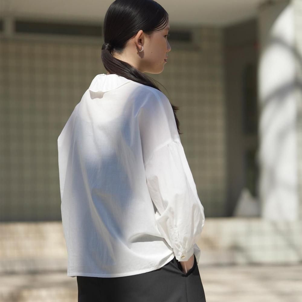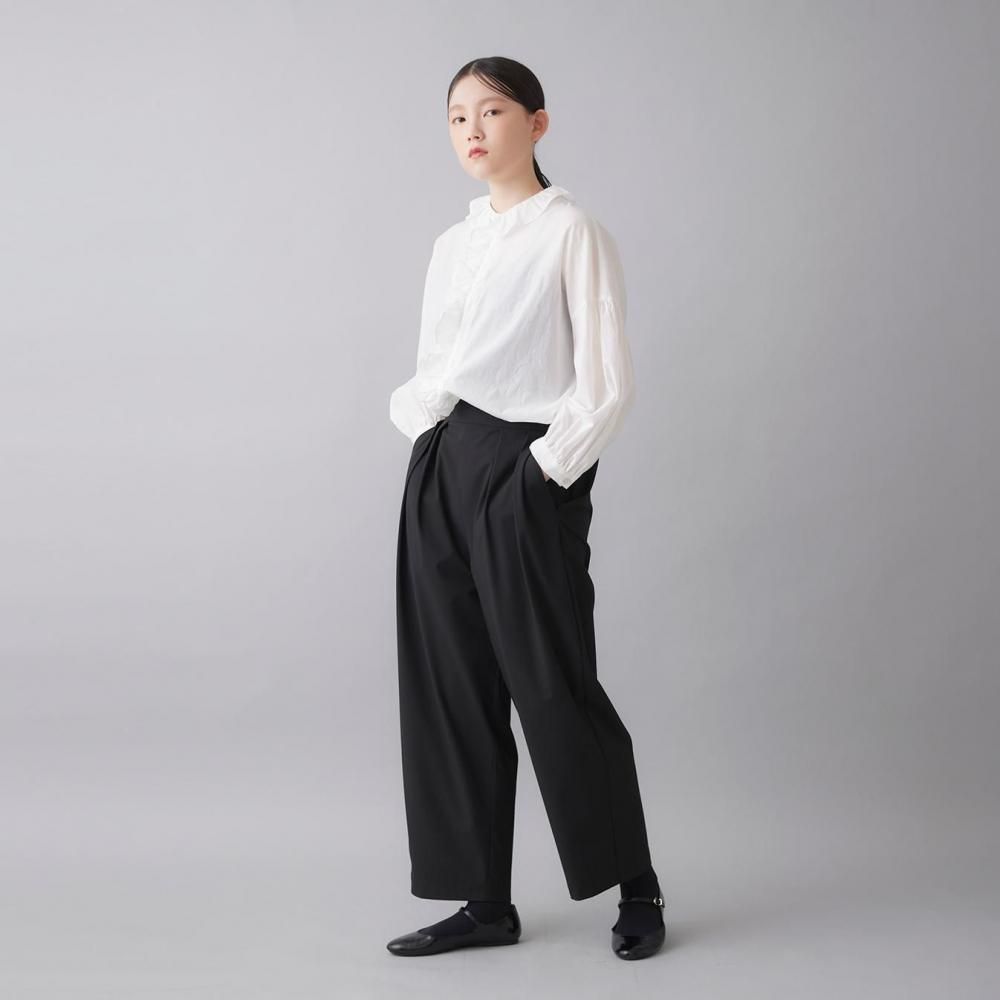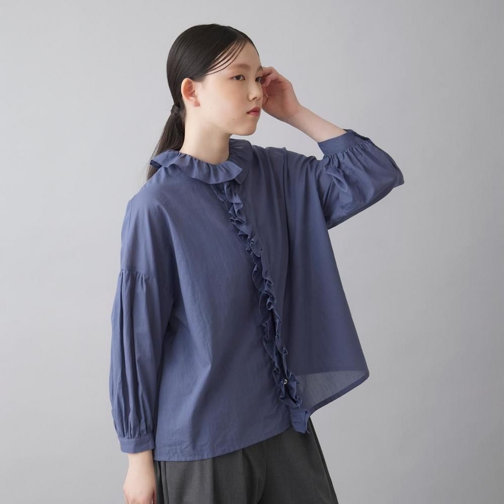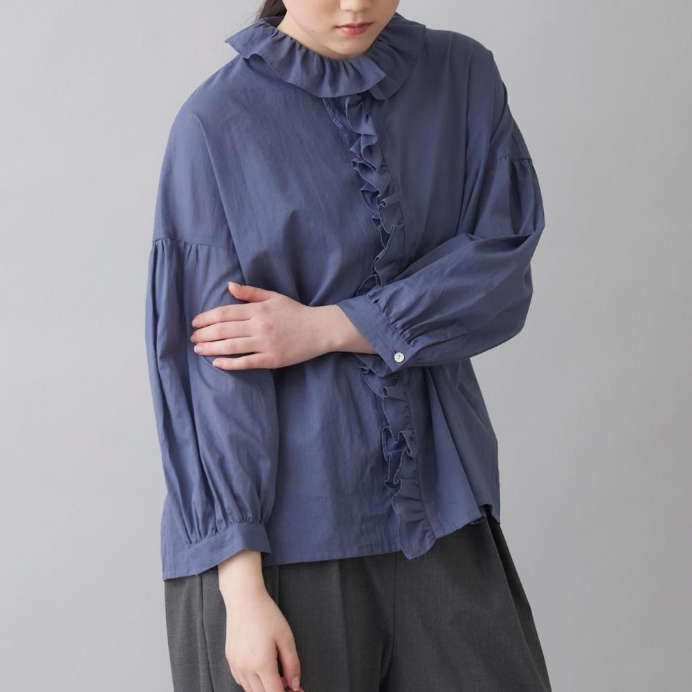 襟元からフロントにかけて施されたフリルが、動くたびに軽やかな表情を添え、袖には細かなギャザーを入れて立体感をプラス。