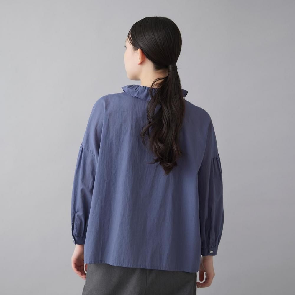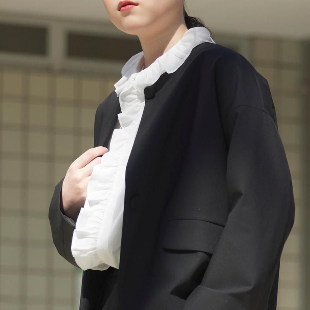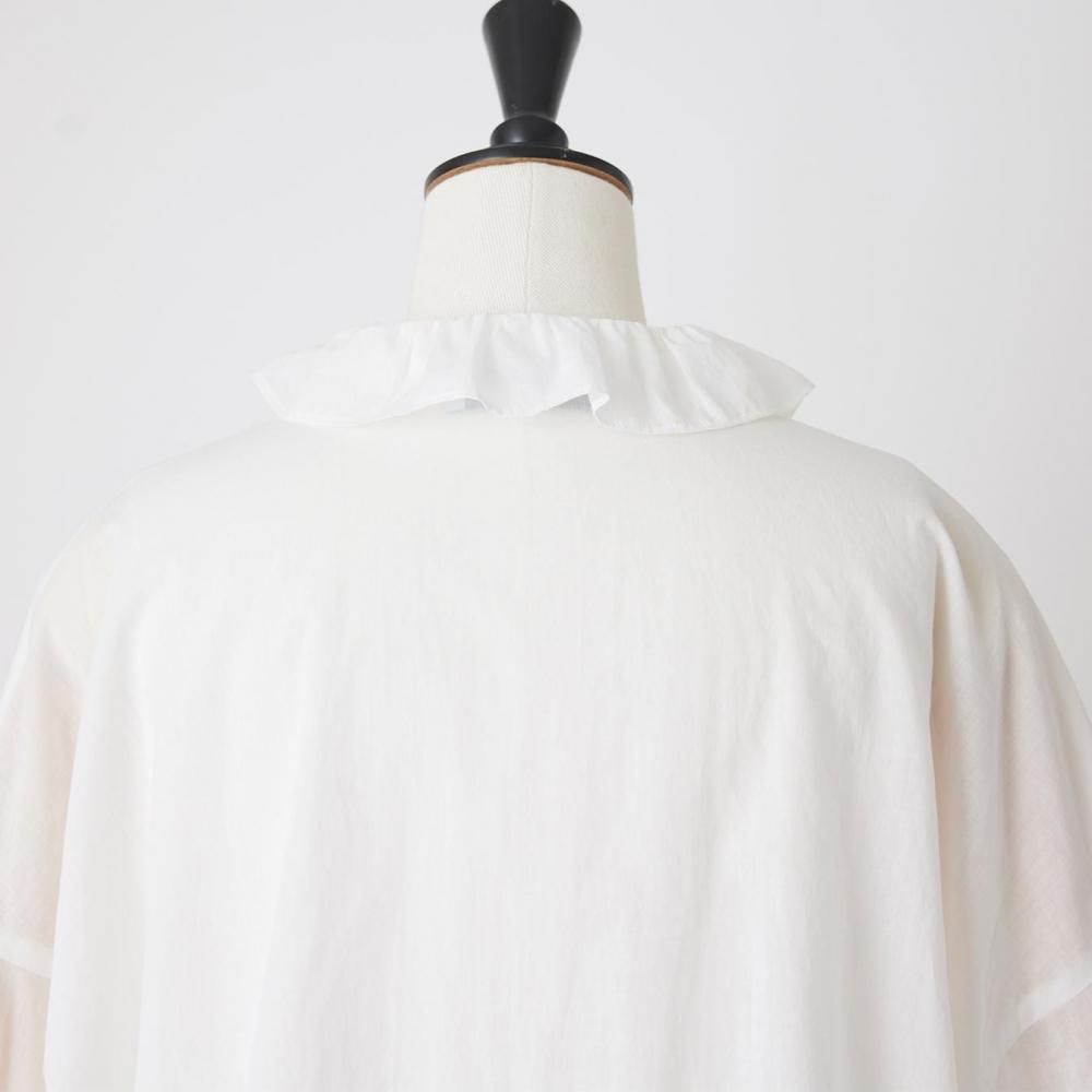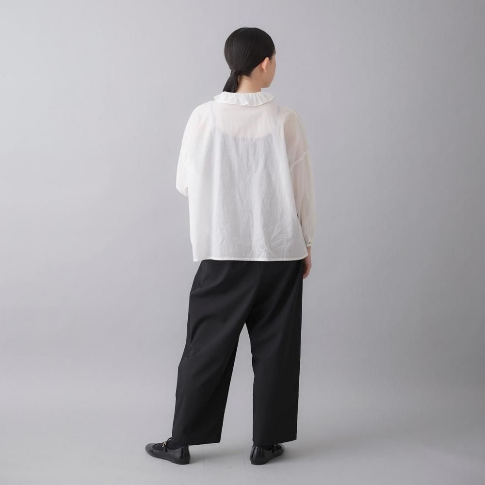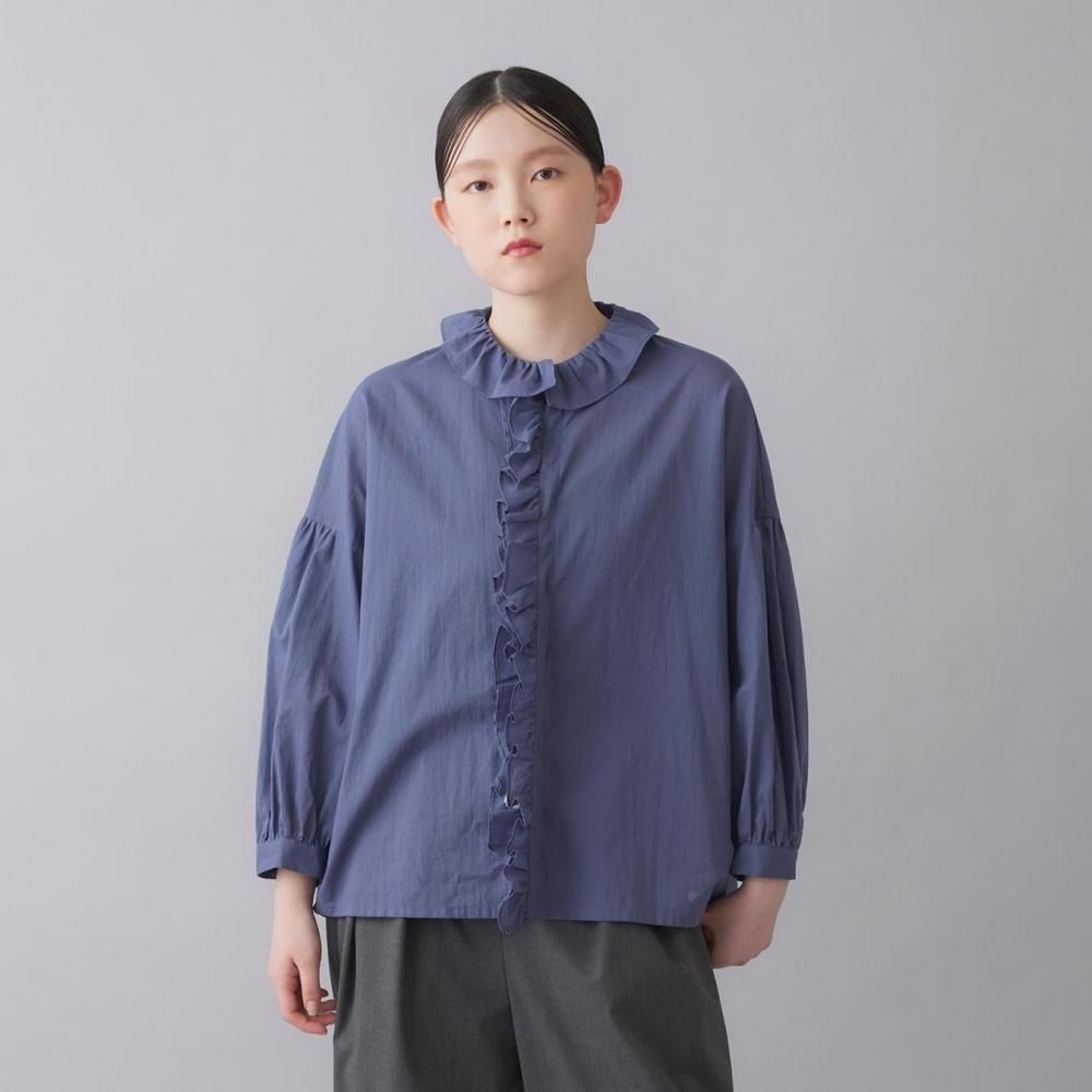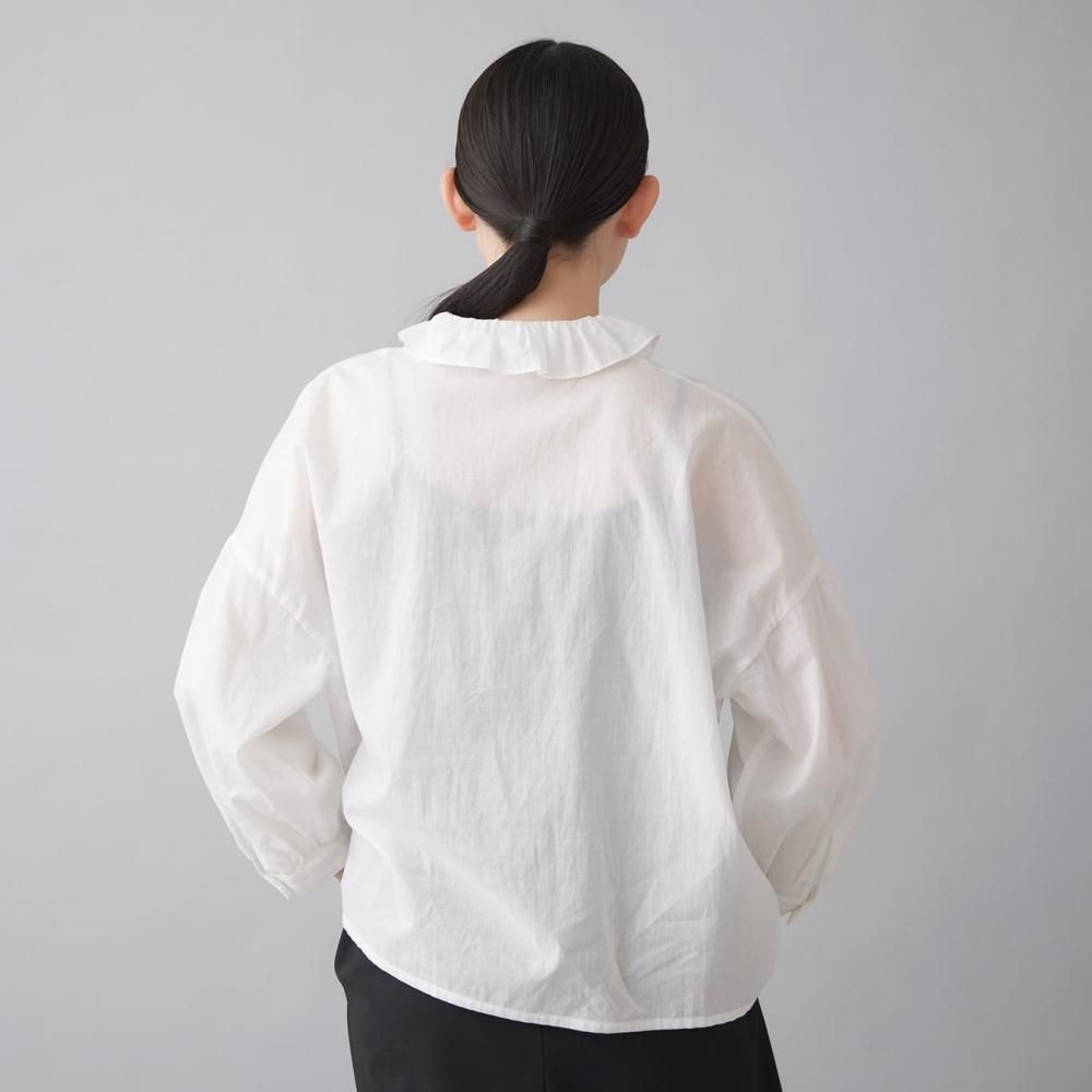 襟元からフロントにかけて施されたフリルが、動くたびに軽やかな表情を添え、袖には細かなギャザーを入れて立体感をプラス。