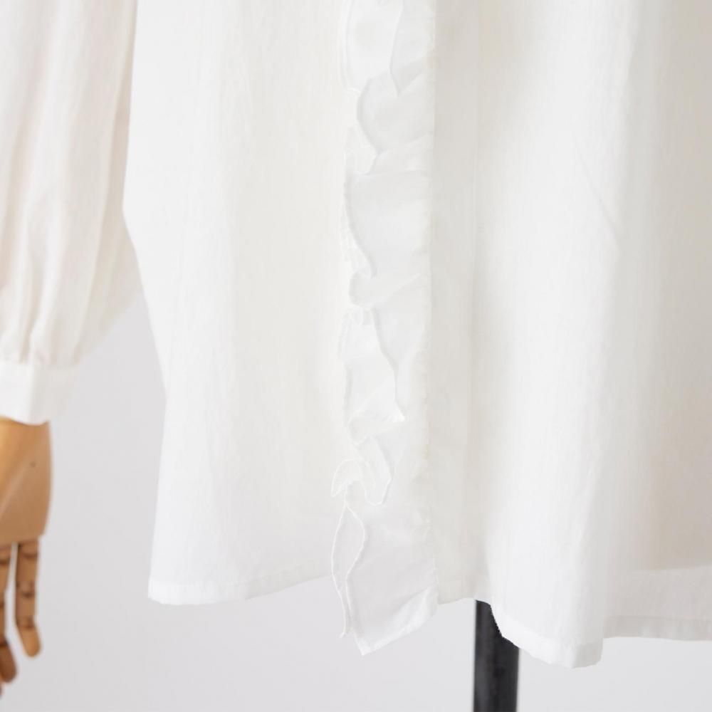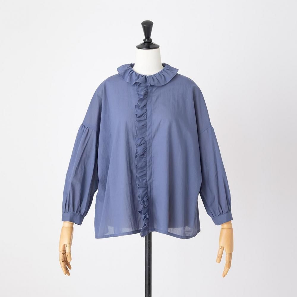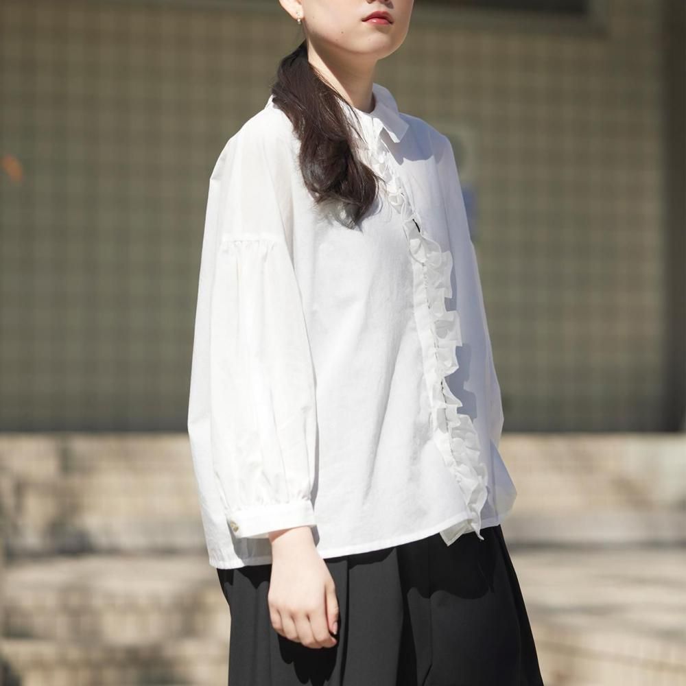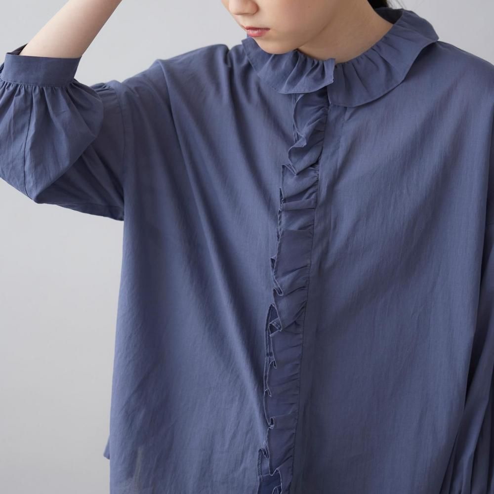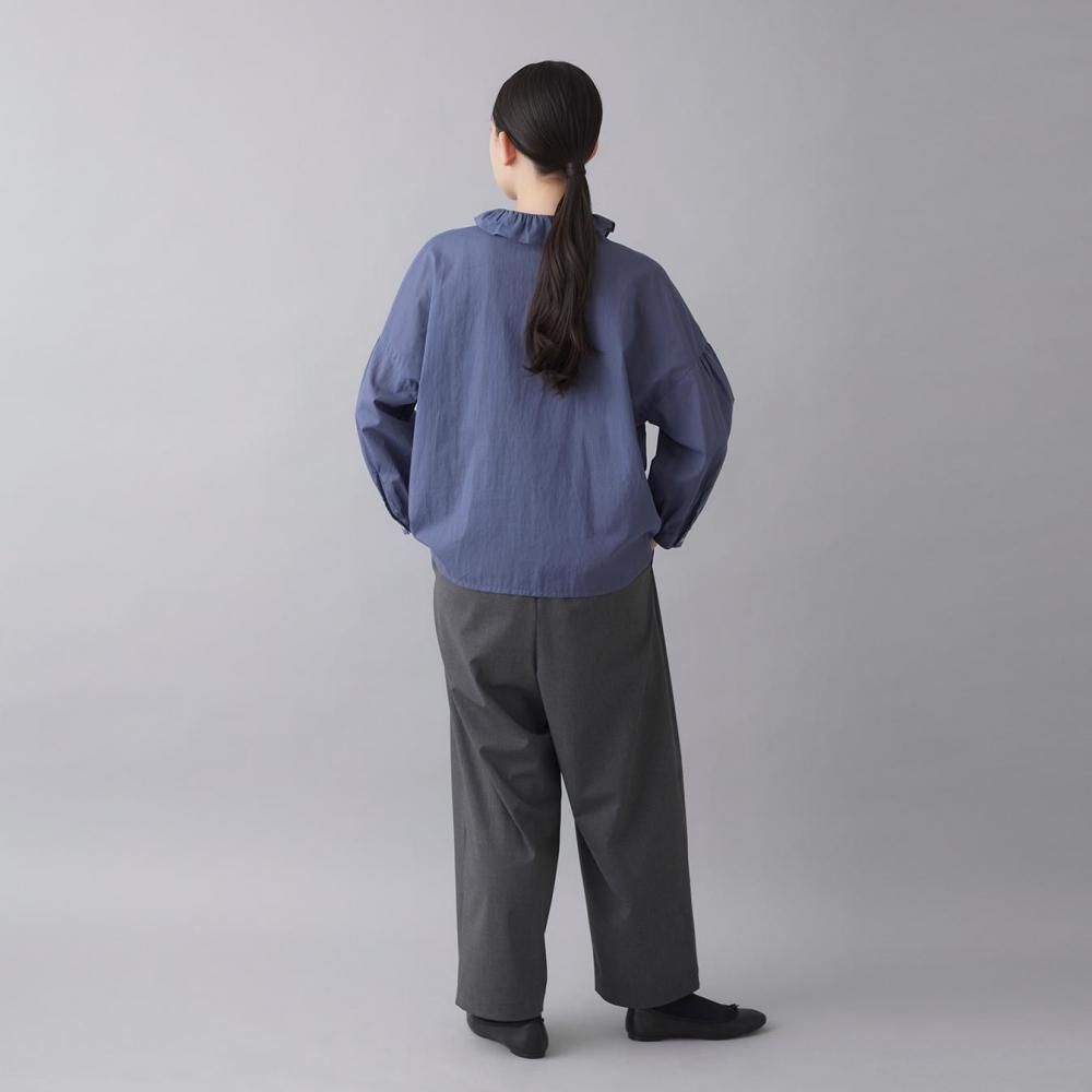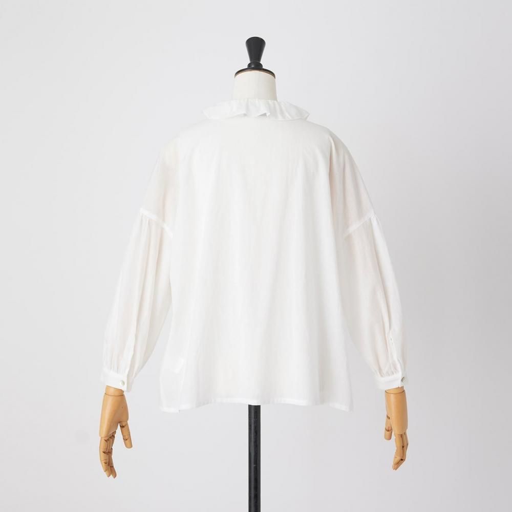 襟元からフロントにかけて施されたフリルが、動くたびに軽やかな表情を添え、袖には細かなギャザーを入れて立体感をプラス。