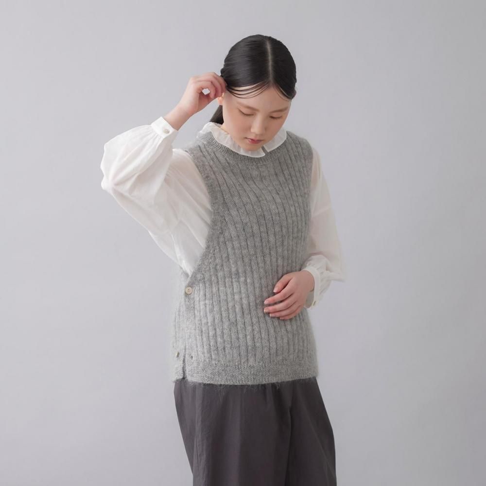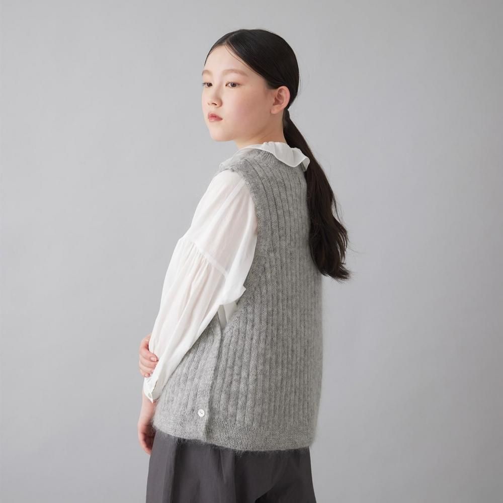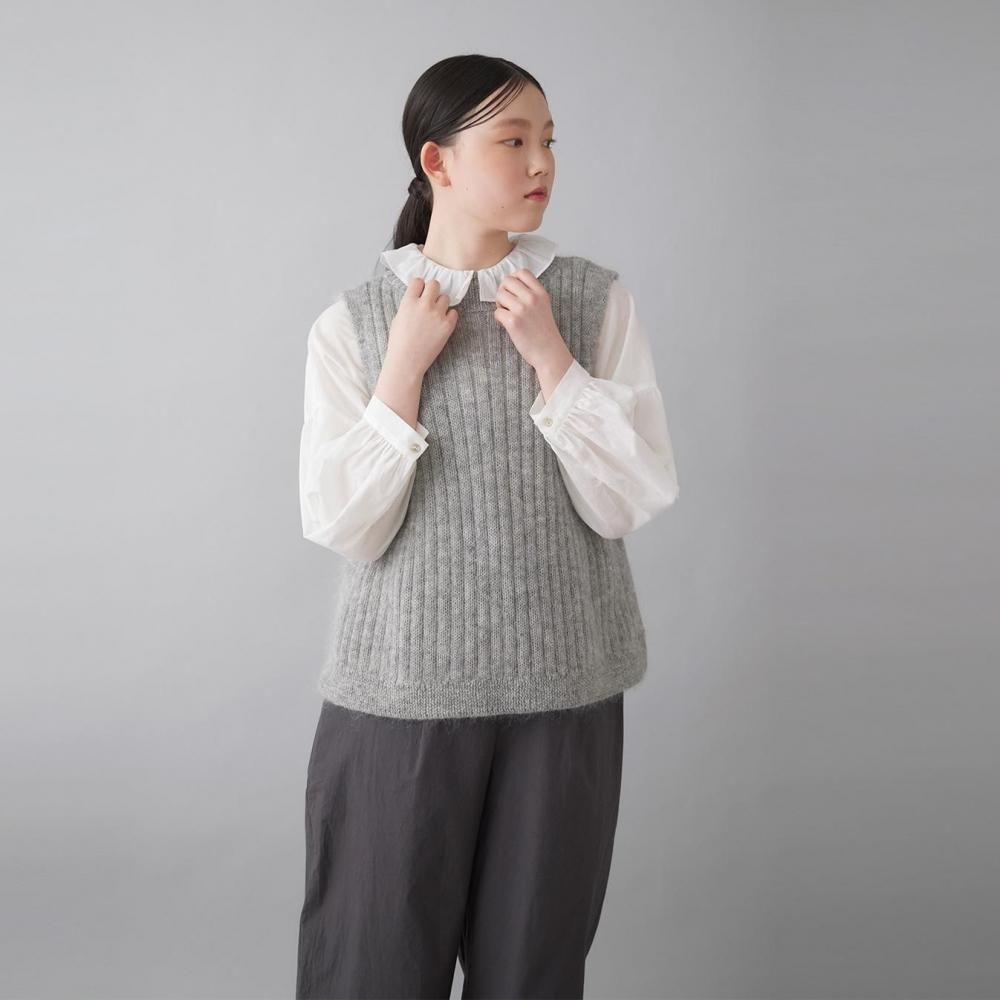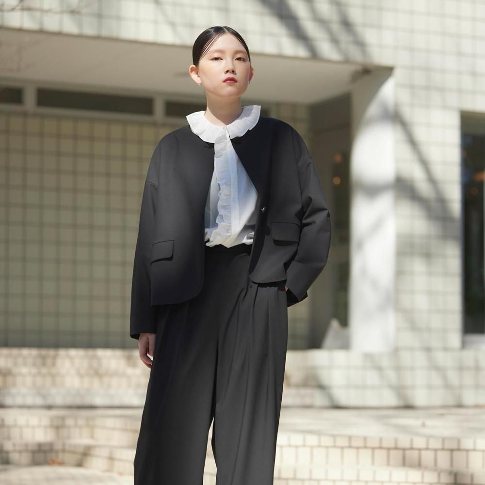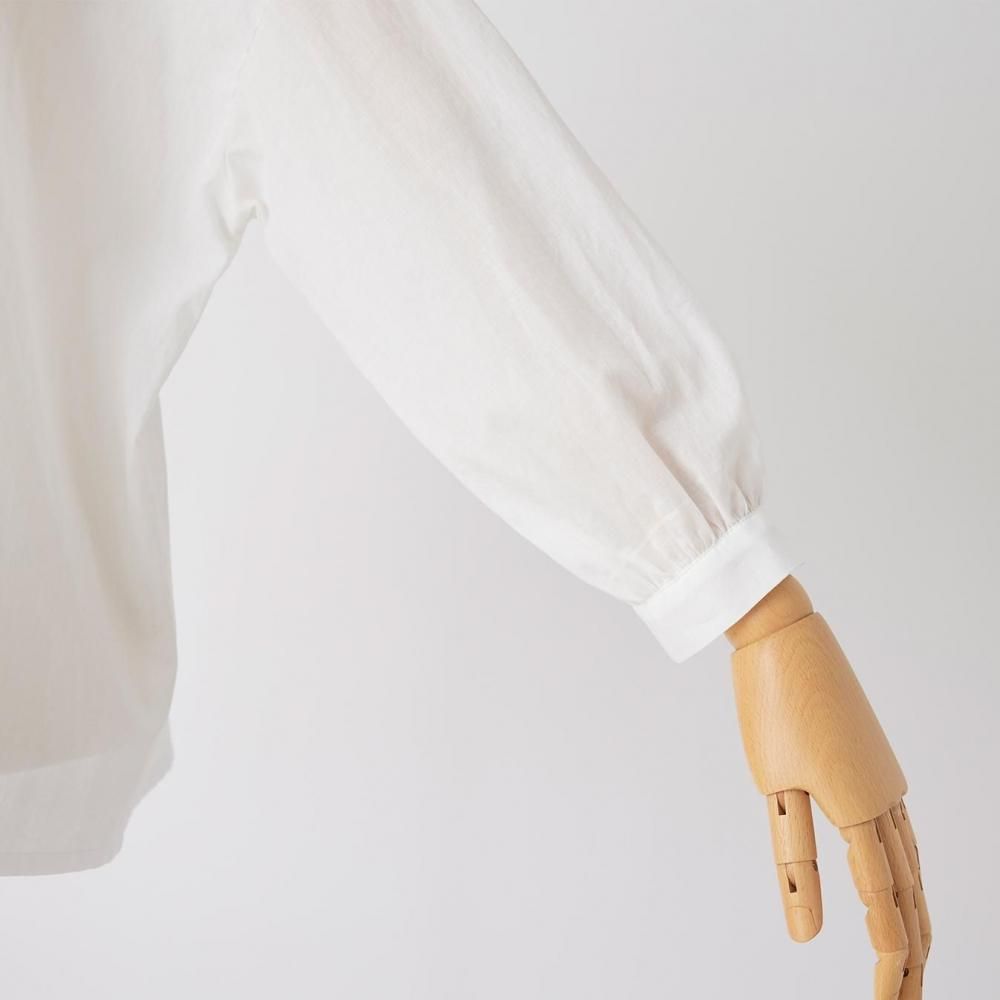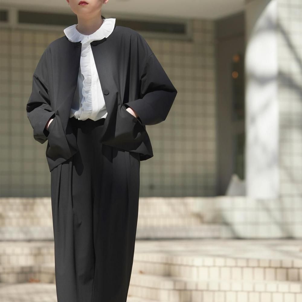 襟元からフロントにかけて施されたフリルが、動くたびに軽やかな表情を添え、袖には細かなギャザーを入れて立体感をプラス。