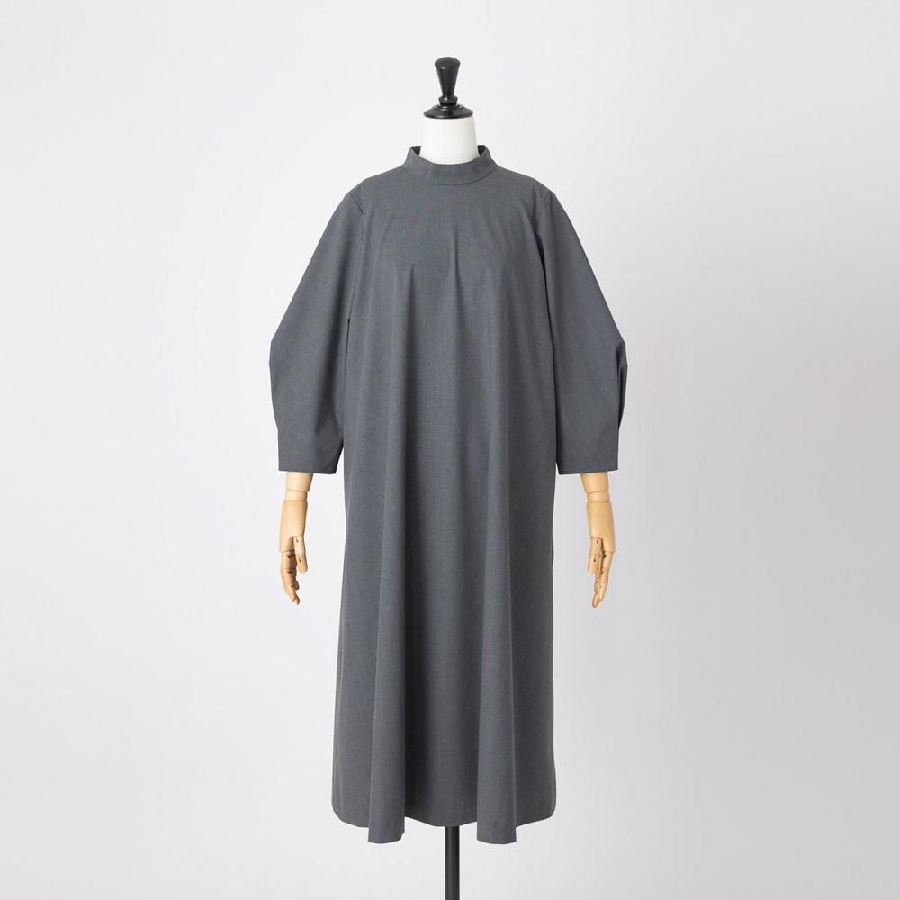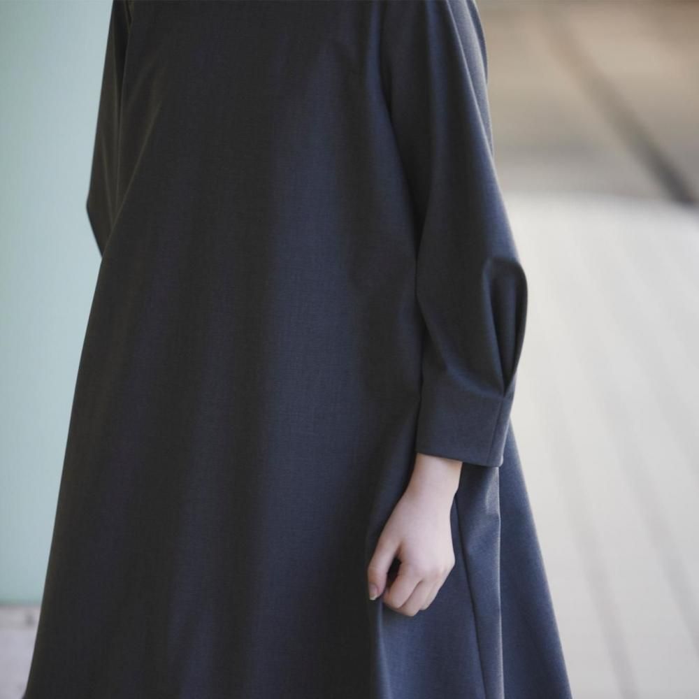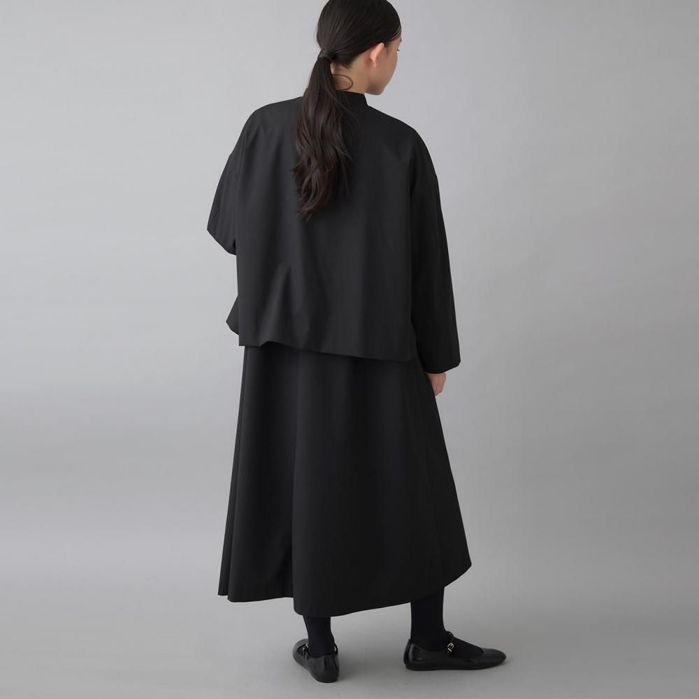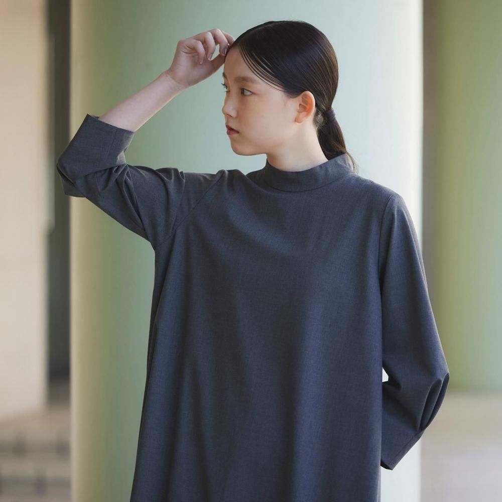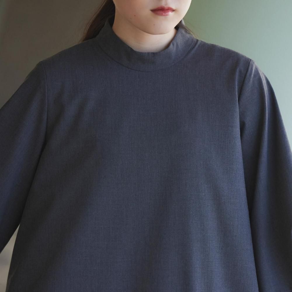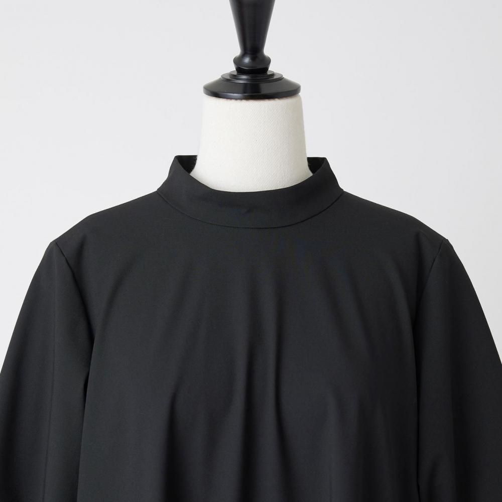 やや高めに仕上げたモックネックがきちんと感を演出し、袖のタックがほどよいボリュームを生み出して、動くたびに女性らしいニュアンスを添えます。