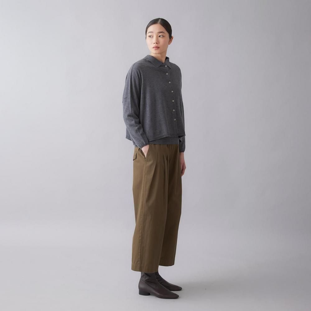 ボリュームのあるワイドパンツにも自然になじみ、全体をすっきりとまとめてくれます。